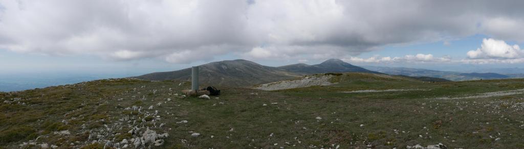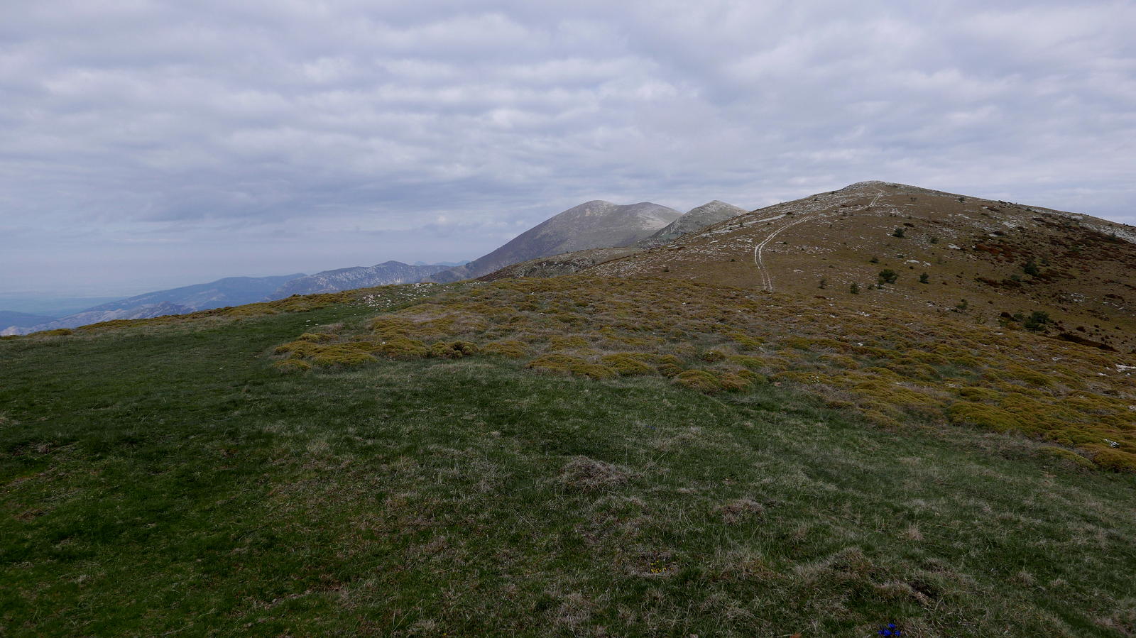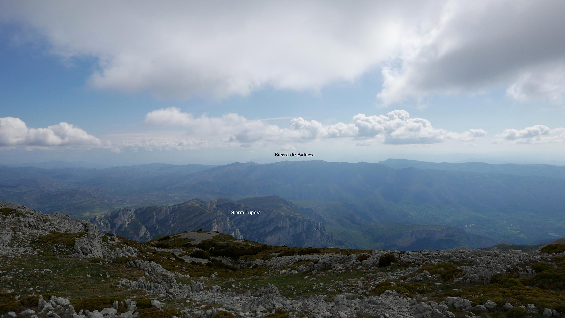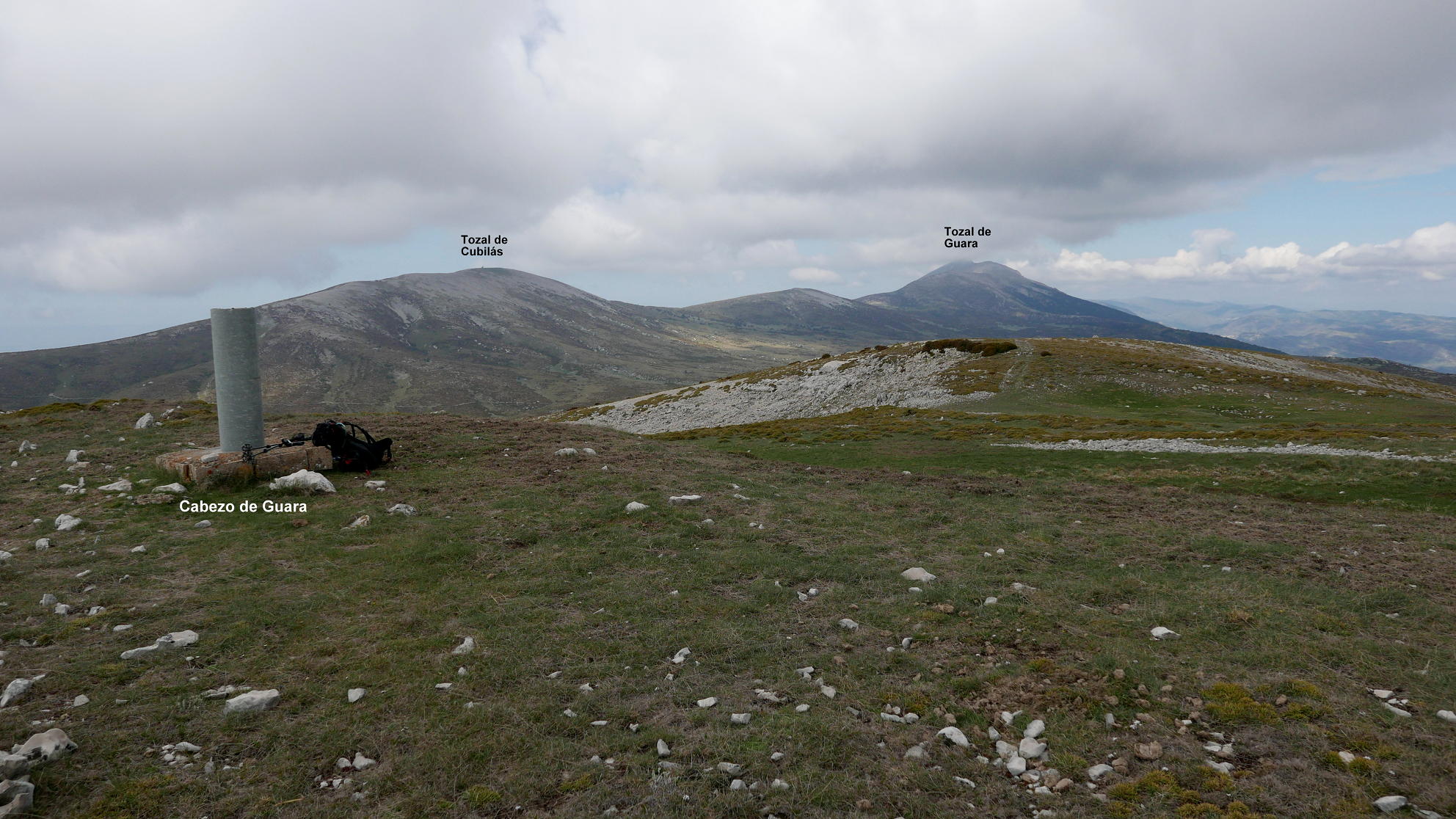 El Cabezo de Guara aún se ve lejos. Tengo que tomar a la derecha (SE) la dirección al Tozal de Cubilás y enseguida desviarme a la izquierda (1815m 1h37′) por un camino que desciende a los llano de Cupierlo, una amplia zona llena de dolinas. El camino sigue claramente al NE hasta que lo dejo junto a un hito bien visible desviándome a la derecha (1680m2h01′) por una zona de pasto, bojes y erizones campo a través, algo confuso, aunque ya directo hacia el Cabezo. Desemboco en un camino 1735m 2h12′) que asciende decididamente la ladera oeste del Cabezo hasta su cima (Cabezo de Guara 1870m 2h33′), donde encuentro la compañía de un rebaño de cabras.