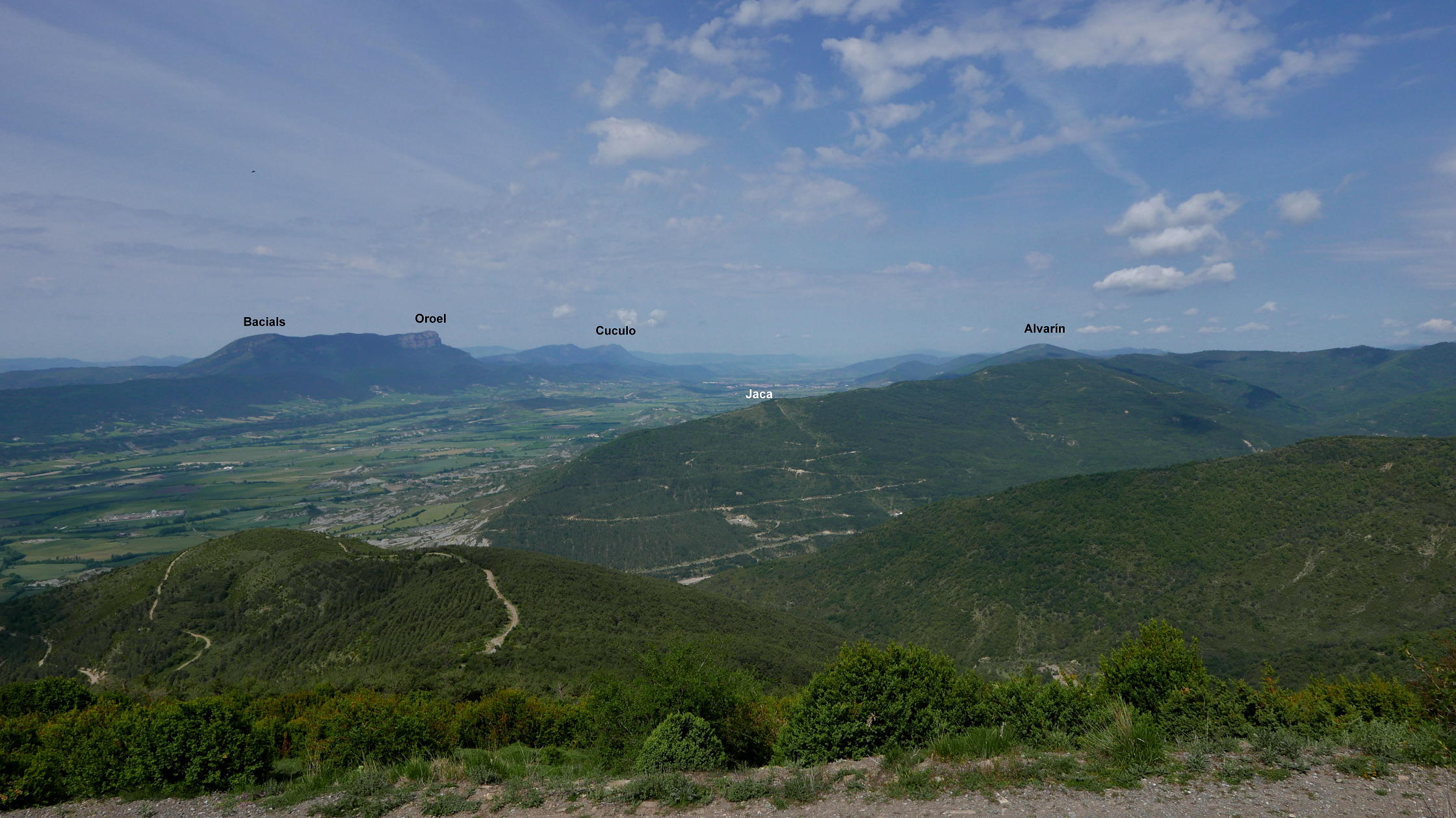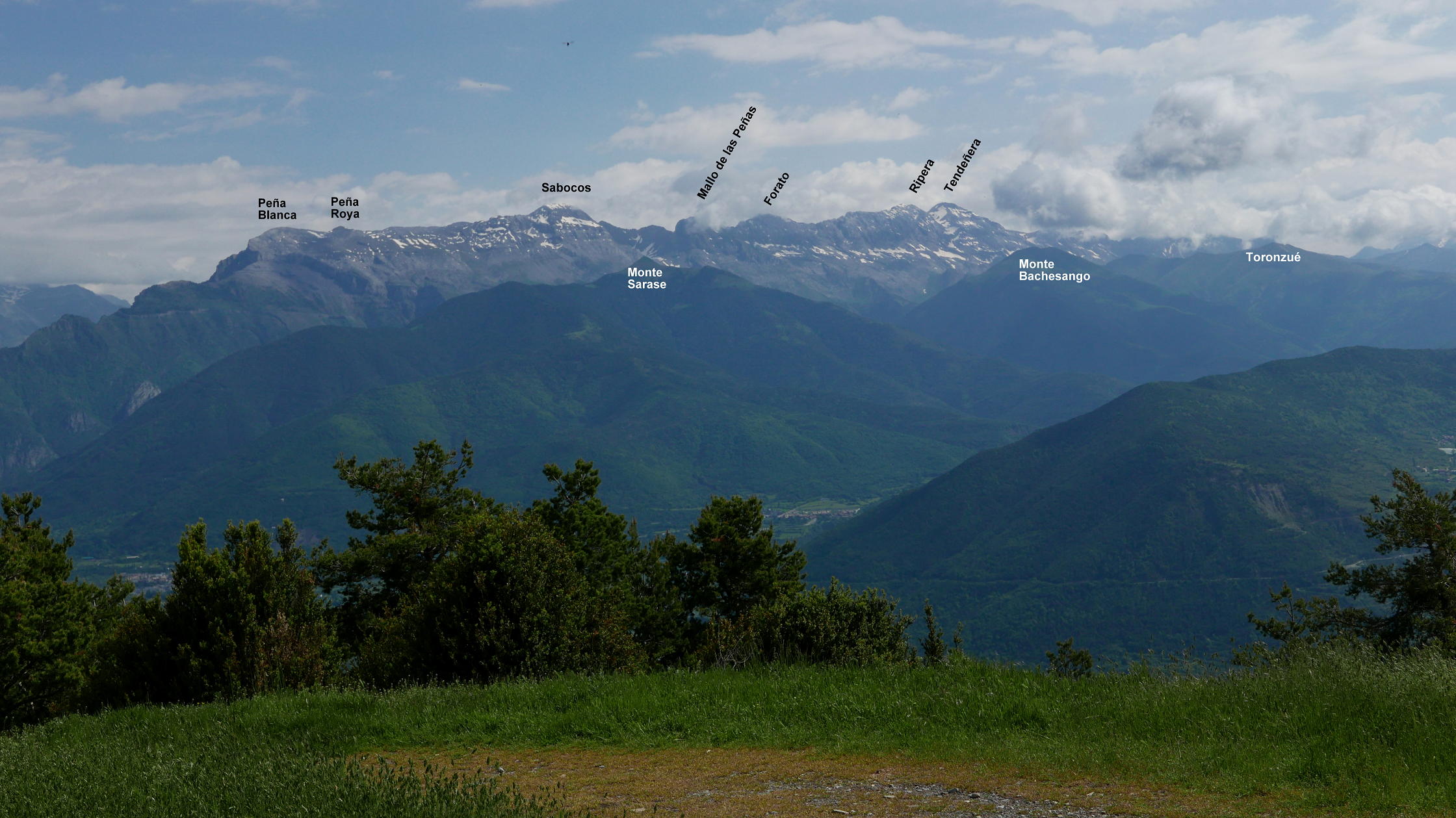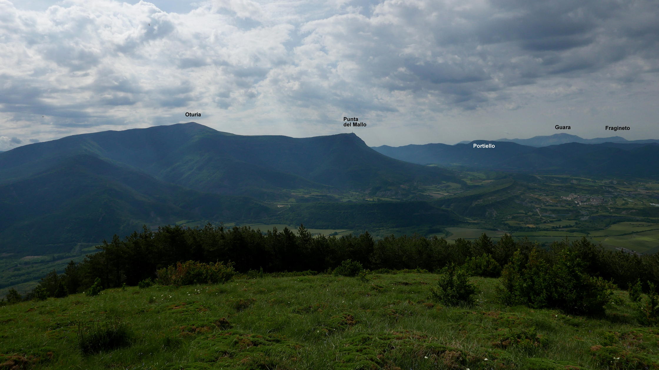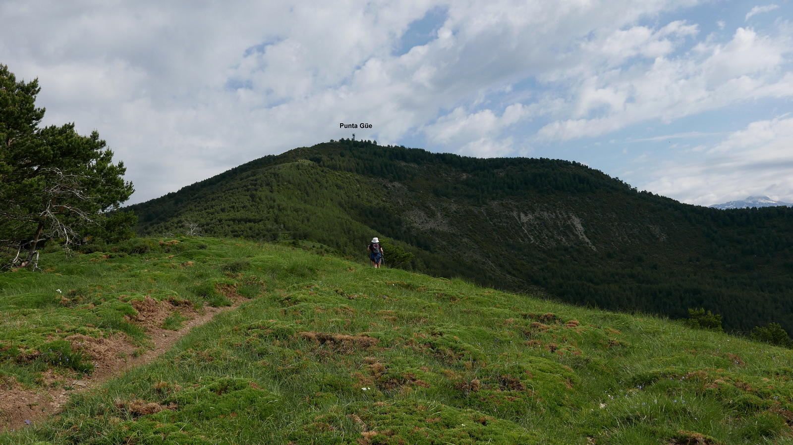 La Punta Gúe es el vértice de una suave cresta que separa los valles del río Gállego y el río Aurín, justo al norte de Sabiñánigo, abriéndonos una amplia vista del valle de Tena, con las sierras de Collarada, la Partacua, y Tendeñera. El ascenso es tranquilo, siempre por senda y, en buena parte, bajo la sombra de quejigos y pinos. Hoy es un día que amenaza tormenta y, aunque podemos aprovechar bien la mañana, las cimas del Pirineo están bastante cubiertas de gruesas nubes. Ayer ya hubo tormenta y hoy el ambiente tiene mucha humedad, lo que hace la subida un poco sofocante. Después de subirlo me doy cuenta de los visible que es este monte desde cualquier punto del entorno de Sabiñánigo, y nunca me había fijado