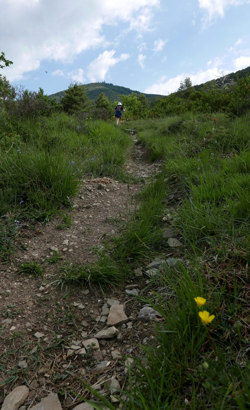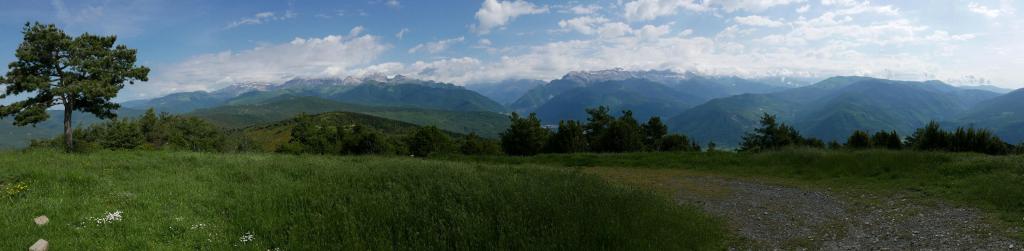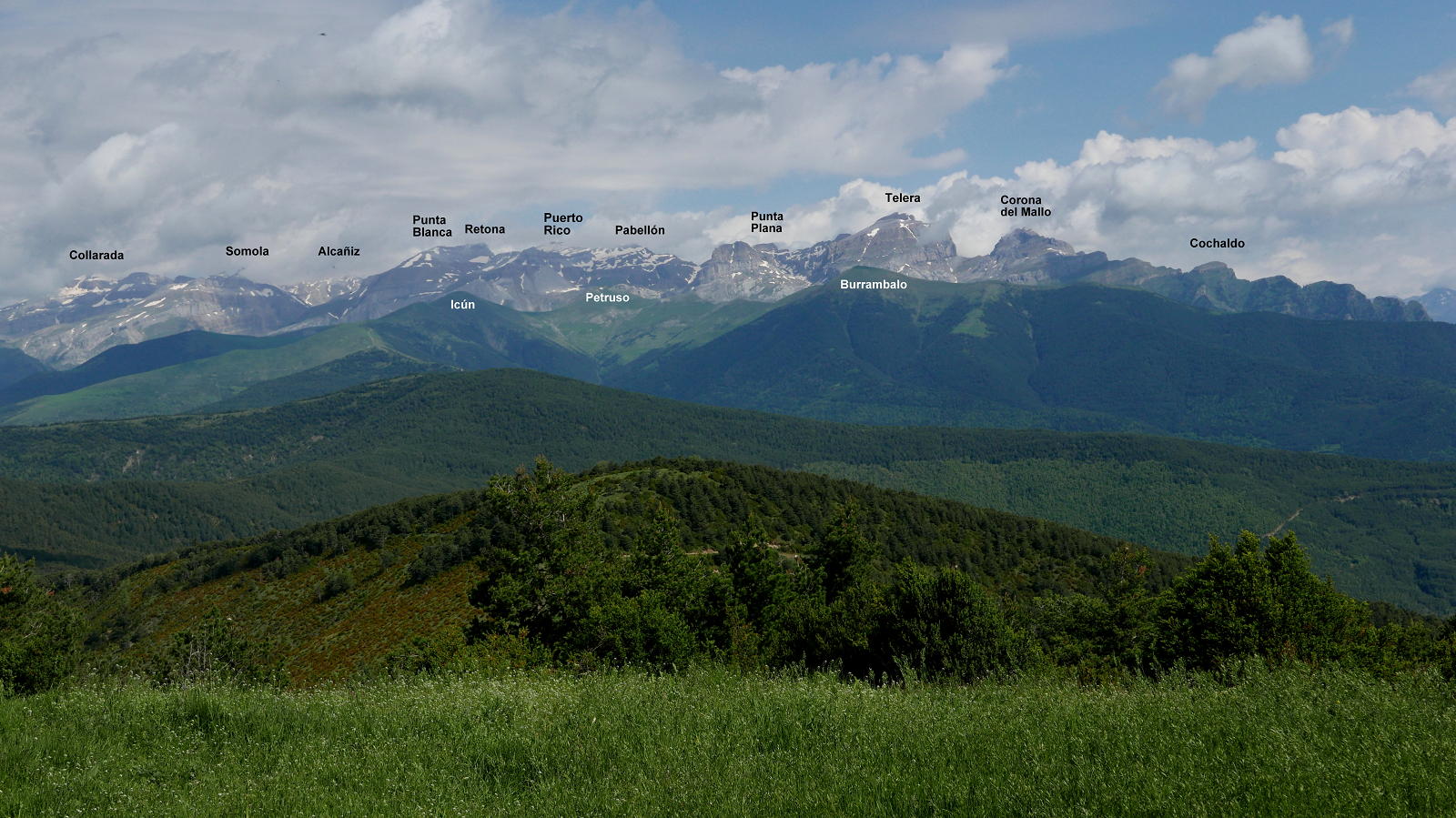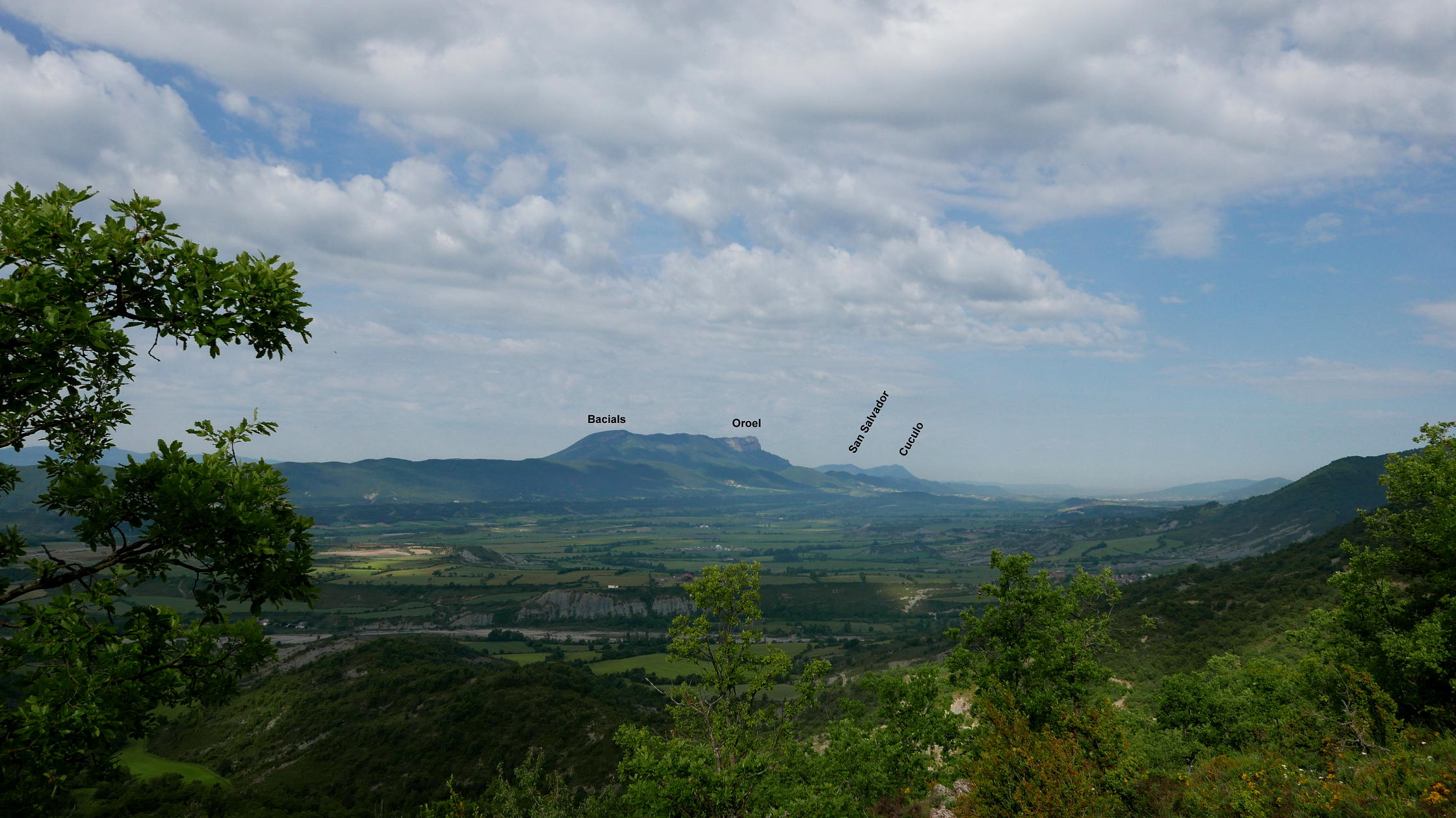 La Punta Gúe es el vértice de una suave cresta que separa los valles del río Gállego y el río Aurín, justo al norte de Sabiñánigo, abriéndonos una amplia vista del valle de Tena, con las sierras de Collarada, la Partacua, y Tendeñera. El ascenso es tranquilo, siempre por senda y, en buena parte, bajo la sombra de quejigos y pinos. Hoy es un día que amenaza tormenta y, aunque podemos aprovechar bien la mañana, las cimas del Pirineo están bastante cubiertas de gruesas nubes. Ayer ya hubo tormenta y hoy el ambiente tiene mucha humedad, lo que hace la subida un poco sofocante. Después de subirlo me doy cuenta de los visible que es este monte desde cualquier punto del entorno de Sabiñánigo, y nunca me había fijado