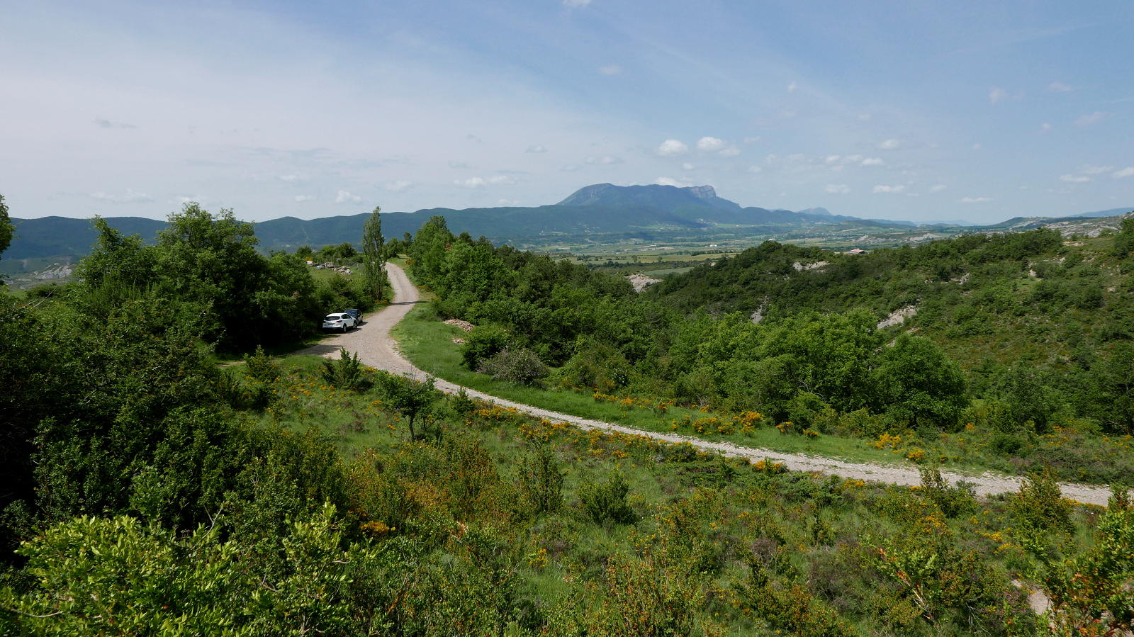 Descripción de la ruta: Desde el aparcamiento (970m) sale una senda a la derecha junto a un campo de cultivo que queda también a nuestra derecha. El sendero asciende por campo abierto de erizones y rosales, siempre cuesta arriba con pendiente moderada, siguiendo el lomo sur de la montaña. Después se interna en bosquecillo de roble quejigo y a continuación por el pinar. Los hitos jalonan el camino, pero no hay pérdida.