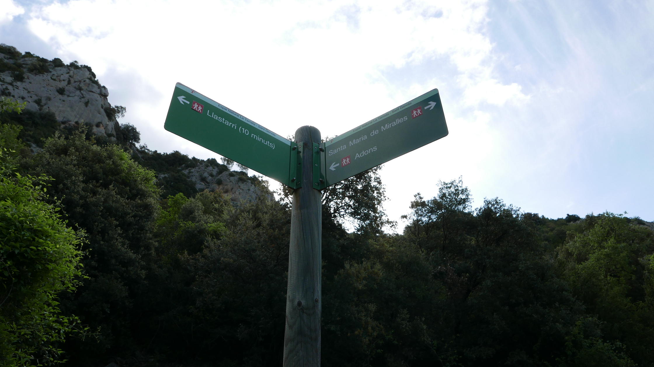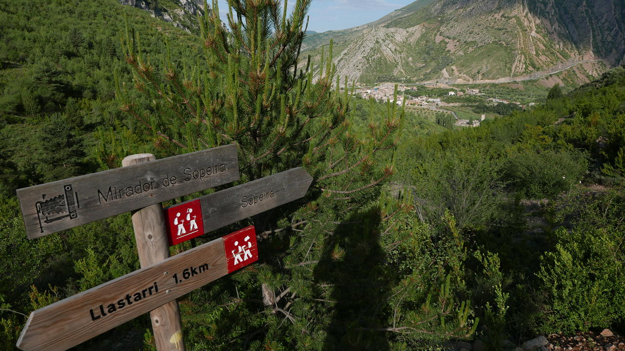 Empieza el ascenso por barranco de Llastarri, un sendero claro, jalonado por hitos y alguna vieja marca de pintura amarilla. Se cierra a veces por la vegetación de bojes y encinas, pero está bien indicado. Un cartel marca Mirador de Sopeira (845m 0h37′) donde echar un vistazo atrás para ver abajo Sopeira enclavado en el estrechamiento del Noguera Ribagorzana.