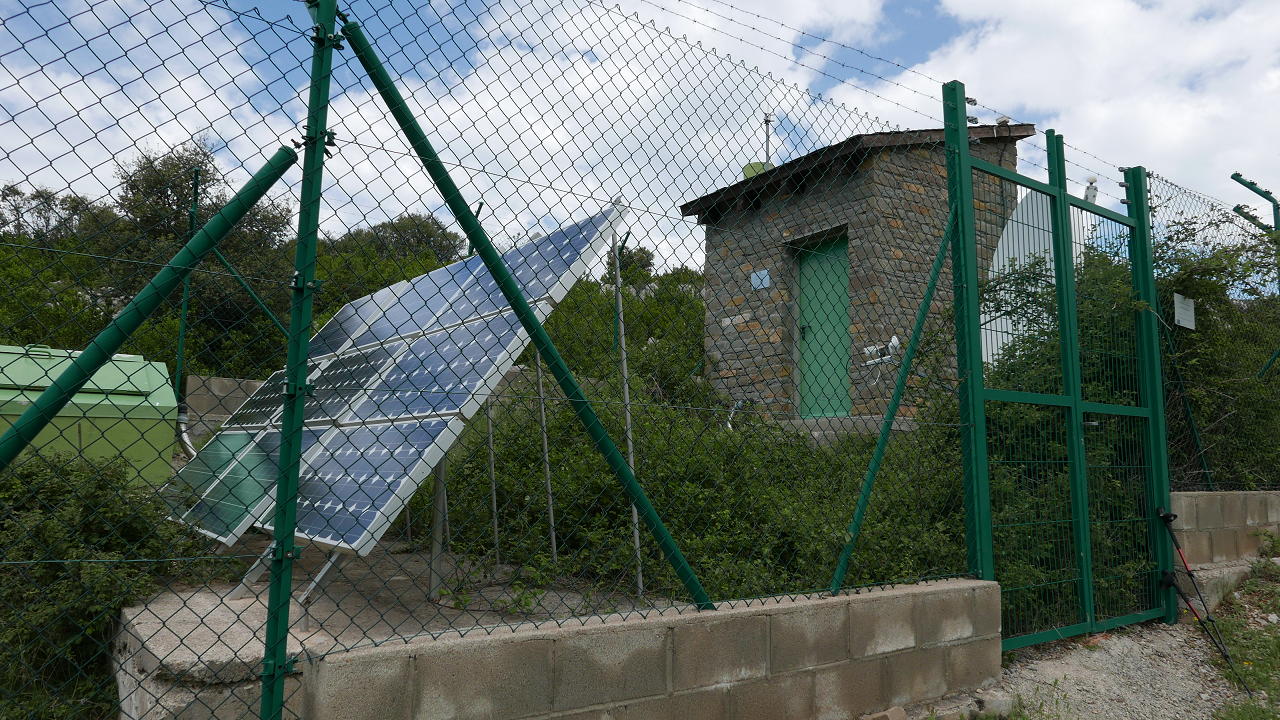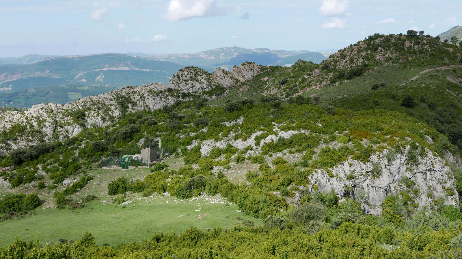 La pista desciende hasta una bifurcación (1095m 1h17′) donde tomo a la izquierda dirección Adons, en fuerte subida. Paso una vieja portilla de ganado, un poste indicador con un extraño rombo y un riachuelo y me desvío por otro atajo a la derecha (1203m 1h27′), muy confuso, junto a una balseta para beber el ganado. Es difícil de seguir, finalmente sale a campo abierto de pasto que asciende al Pla de Cunco. La estación sismológica de Tremp queda a la izquierda (1320m) junto a la pista que he atajado, y desemboco en un camino (1325m 1h43′) que va al norte al collado de Llastarri.