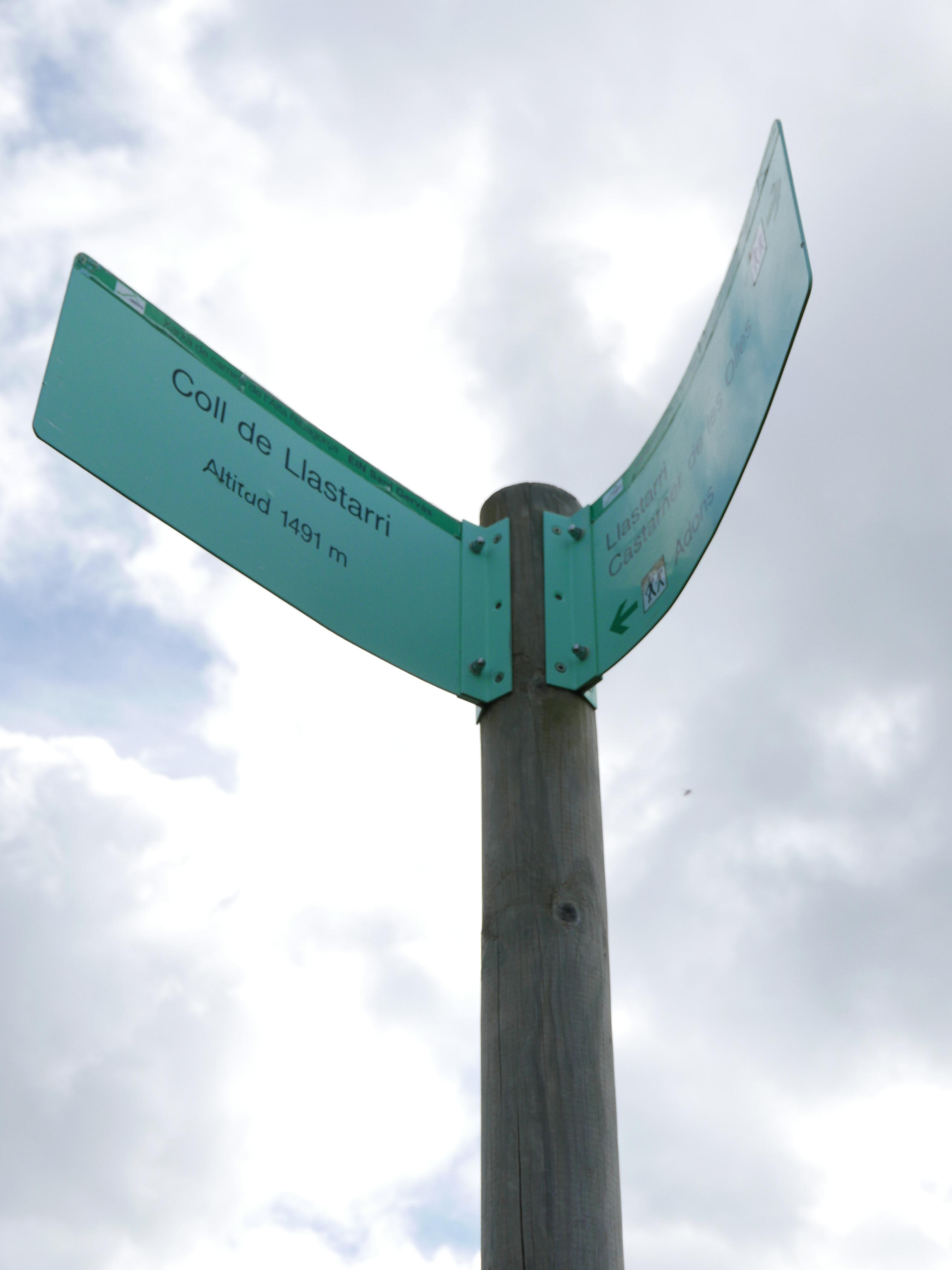 Llastarri (1165m 1h05′) pueblo abandonado cuyas ruinas quedan a la derecha del collado que acabo de alcanzar. Por lo visto era el paso obligado para remontar el Noguera Ribagorzana debido al difícil estrecho de Escales, por lo que tuvo importancia en el pasado, quedando restos de un castillo y una necrópolis. Al pasar el collado bajo por un prado a una pista que va hacia el sur. Junto a una gran encina tomo un atajo a la izquierda (1150m 1h09′) apenas visible, para evitar una gran curva. Unos metros más abajo vuelvo a tomar la pista hacia el NE.