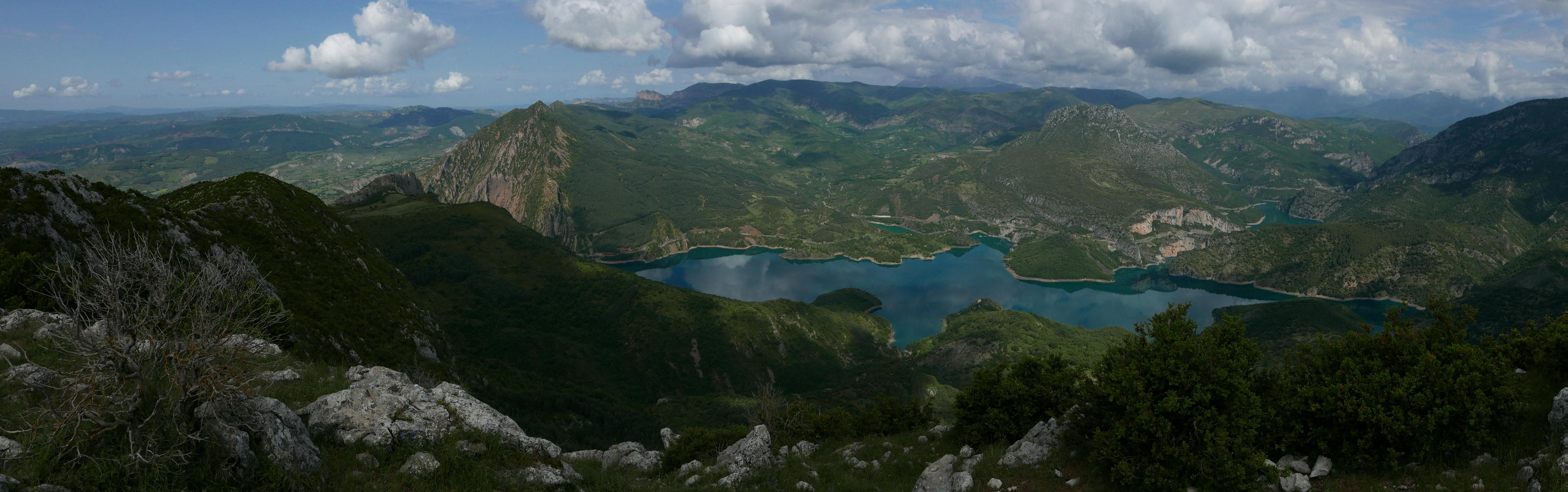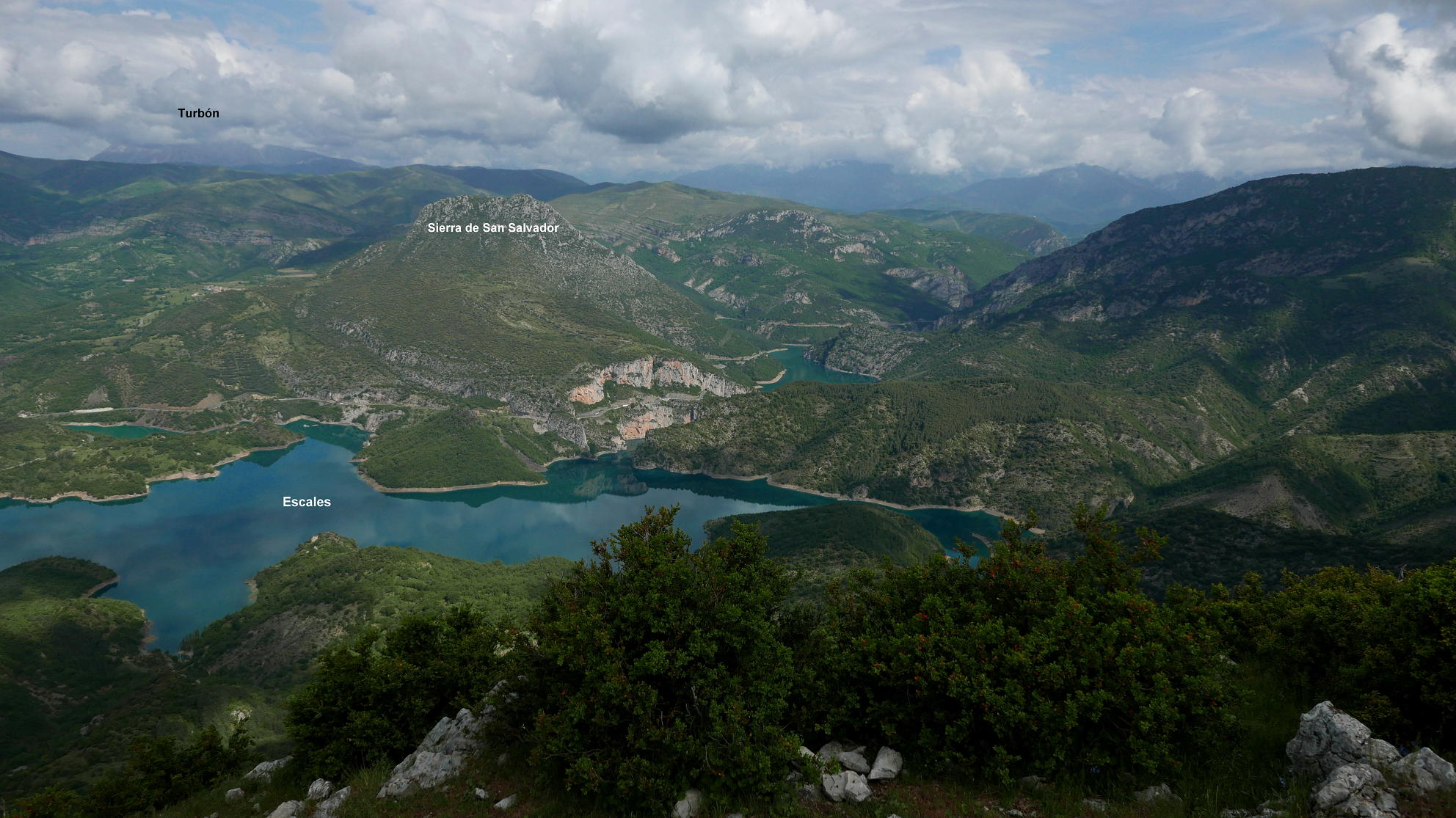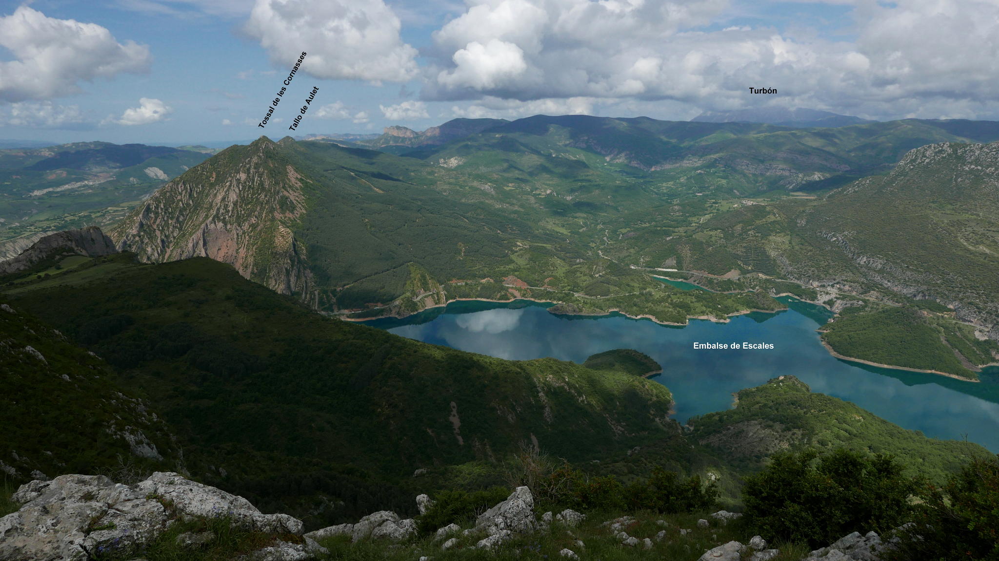 Aunque las cimas del Tossasl Gros son lomos redondeados, la 2º de ellas se asoma verticalmente al embalse y la vista es muy espectacular. Lástima que el día nublado no me permite ver también el Pirineo. La altura de las cimas presenta confusión; el mapa del IGN nos da 1555 y 1544m, mientras que la aplicación Vissir del Instituto Cartográfico de Cataluña da 1549 y 1546m (siempre me resulta curioso que en estos tiempos siga habiendo discrepancias al consultar dos mapas, así que en la entrada he puesto 1550m, ni para unos ni para otros). Esta ruta suele combinarse con la trepada a Roc de Sant Cugat y un recorrido circular, pero la amenaza de tormenta a partir de mediodía me aconseja ser prudente, hacer cima y volver por el mismo camino.