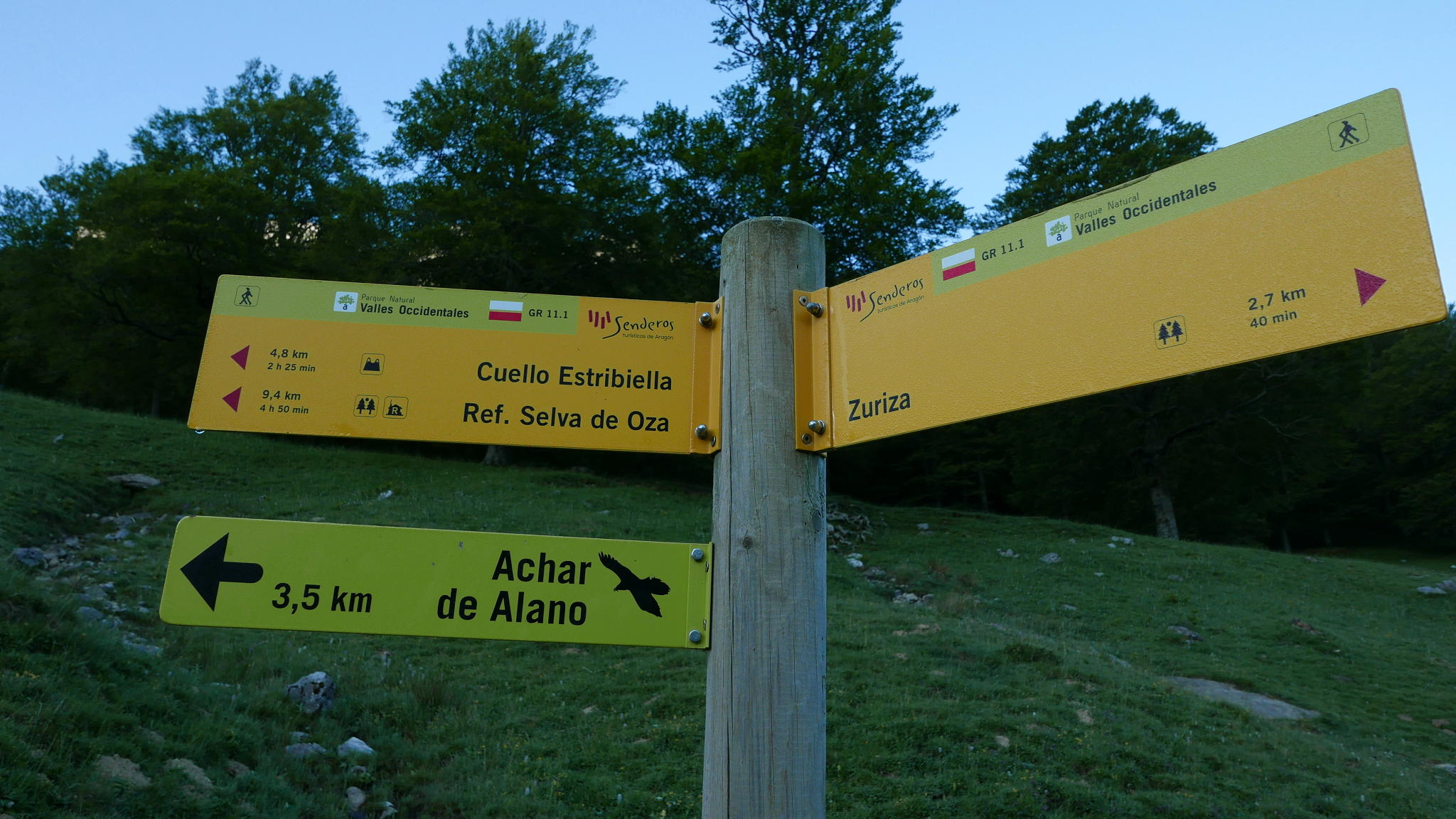 Descripción de la ruta: Tacheras (1285m). La pista que da acceso a granjas de ganado pasa el puente sobre el barranco de Petraficha. Inmediatamente se deja la pista para progresar a la izquierda por el sendero GR11 entre bellos hayedos, siempre bordeando o cruzando la pista hacia las verticales paredes de la sierra de Alano. Dejo a la izquierda una granja (1458m 0h17′) y, tras un corto recorrido por la pista, salgo del GR para desviarme a la derecha (cartel a Achar y Alano y un poste clavado que indica el sendero 1517m 0h29′).