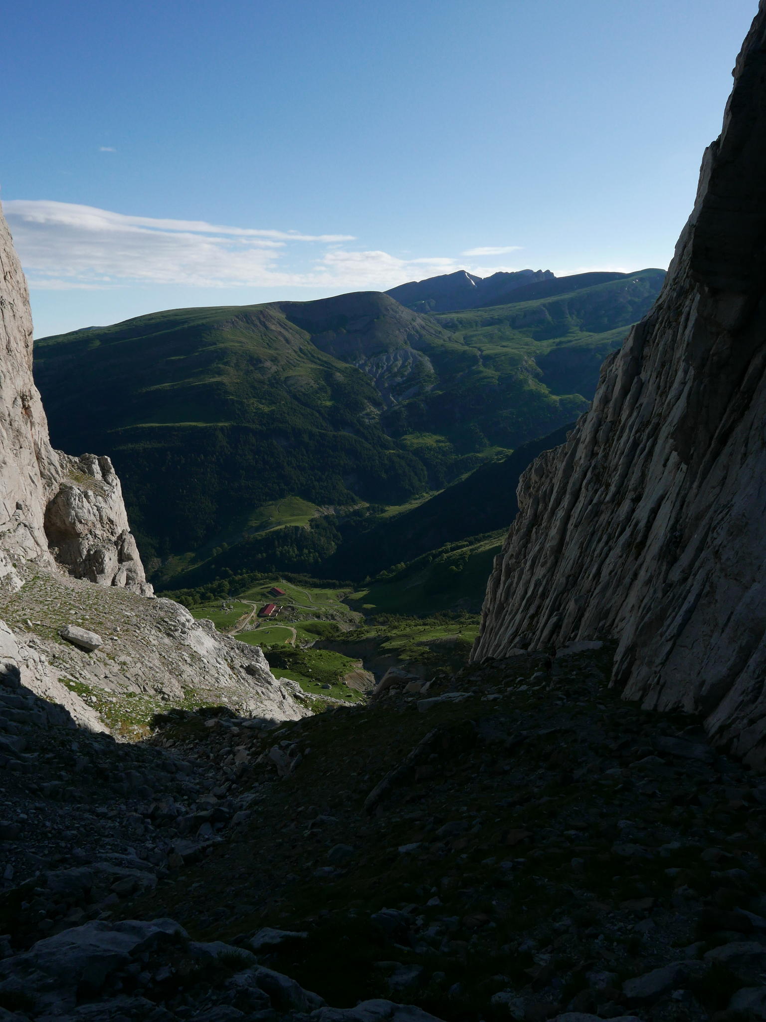 La senda va tomando pendiente y se dirige claramente a la brecha del Paso Tacheras. Poco a poco se vuelve más pedregosa, pero se abre paso con comodidad, siguiendo hitos y alguna marca de pintura verde y amarilla y puntos azules. Las paredes a izquierda y derecha se alzan imponentes. Paso Tacheras 1905m 1h05′).