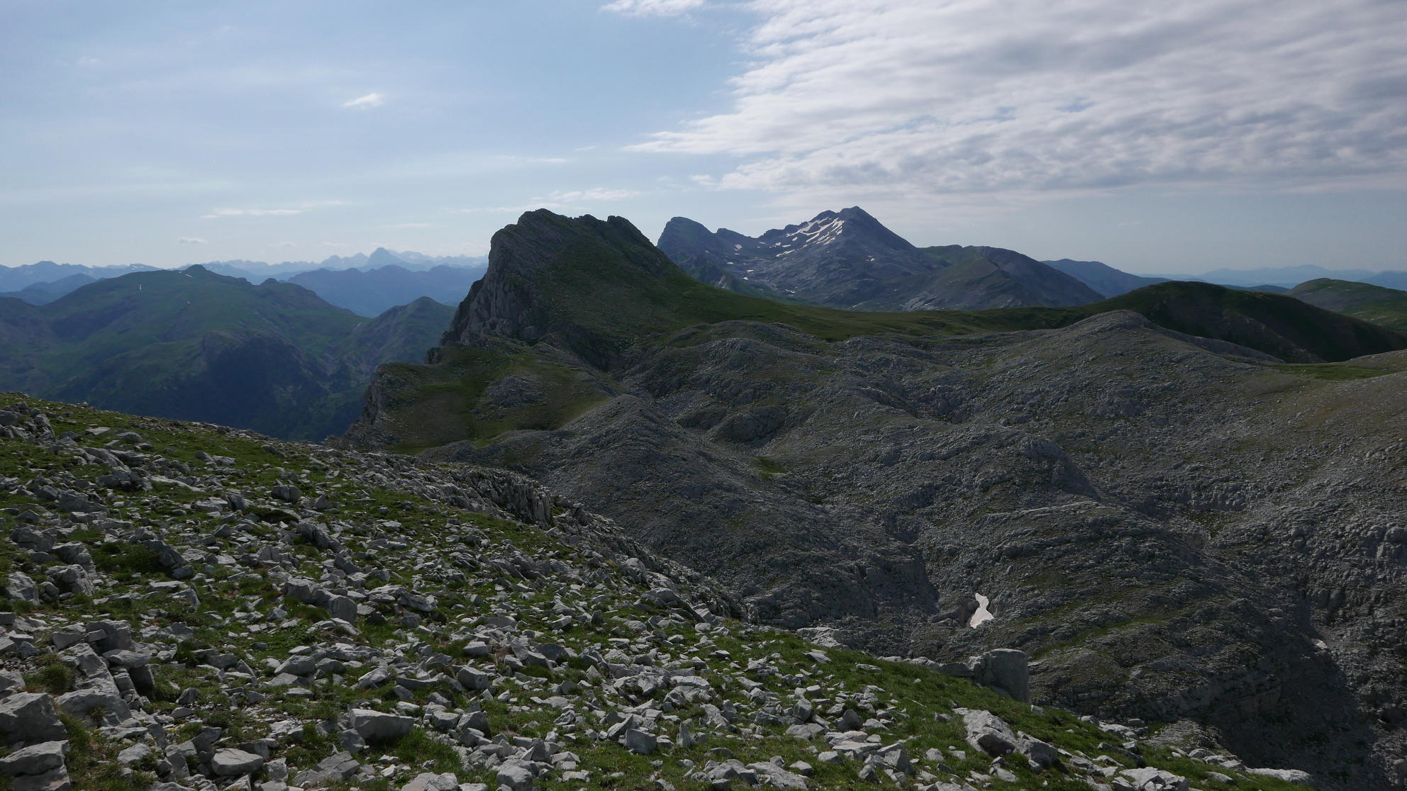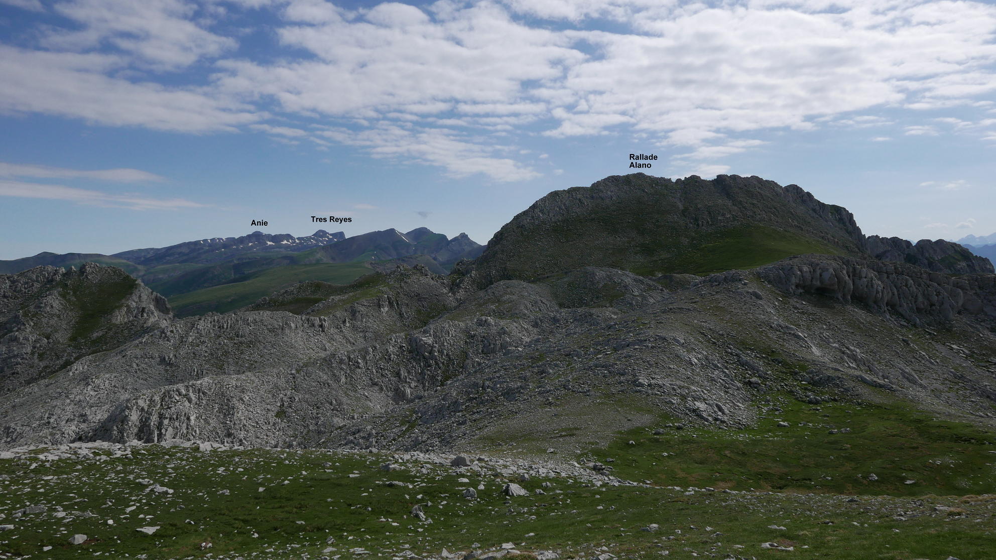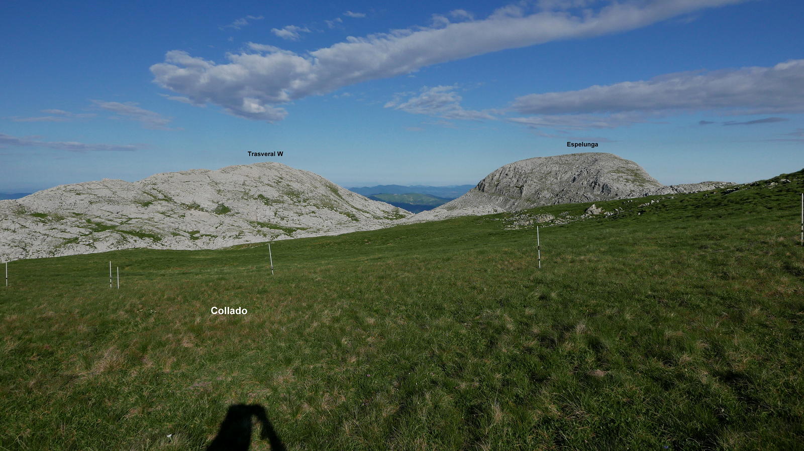 Vuelvo a bajar al collado oriental del Espelunga (2003m 2h45′) para dirigirme al sur, también por terreno caótico de calizas en las que hay que tener cuidado porque forman afiladas aristas que en caso de caída te destrozan la piel; pero sin mayores problemas se llega al Trasveral Occidental (2081m 3h00′). Al este se eleva la cota sin importancia del Trasveral Central (2077m 3h07′). En el descenso hacia el este y sur paso a terreno herboso y afronto la ladera que me eleva al Trasveral Oriental (2088m 3h18′) desde donde puedo observar todas las cimas coronadas en esta jornada.