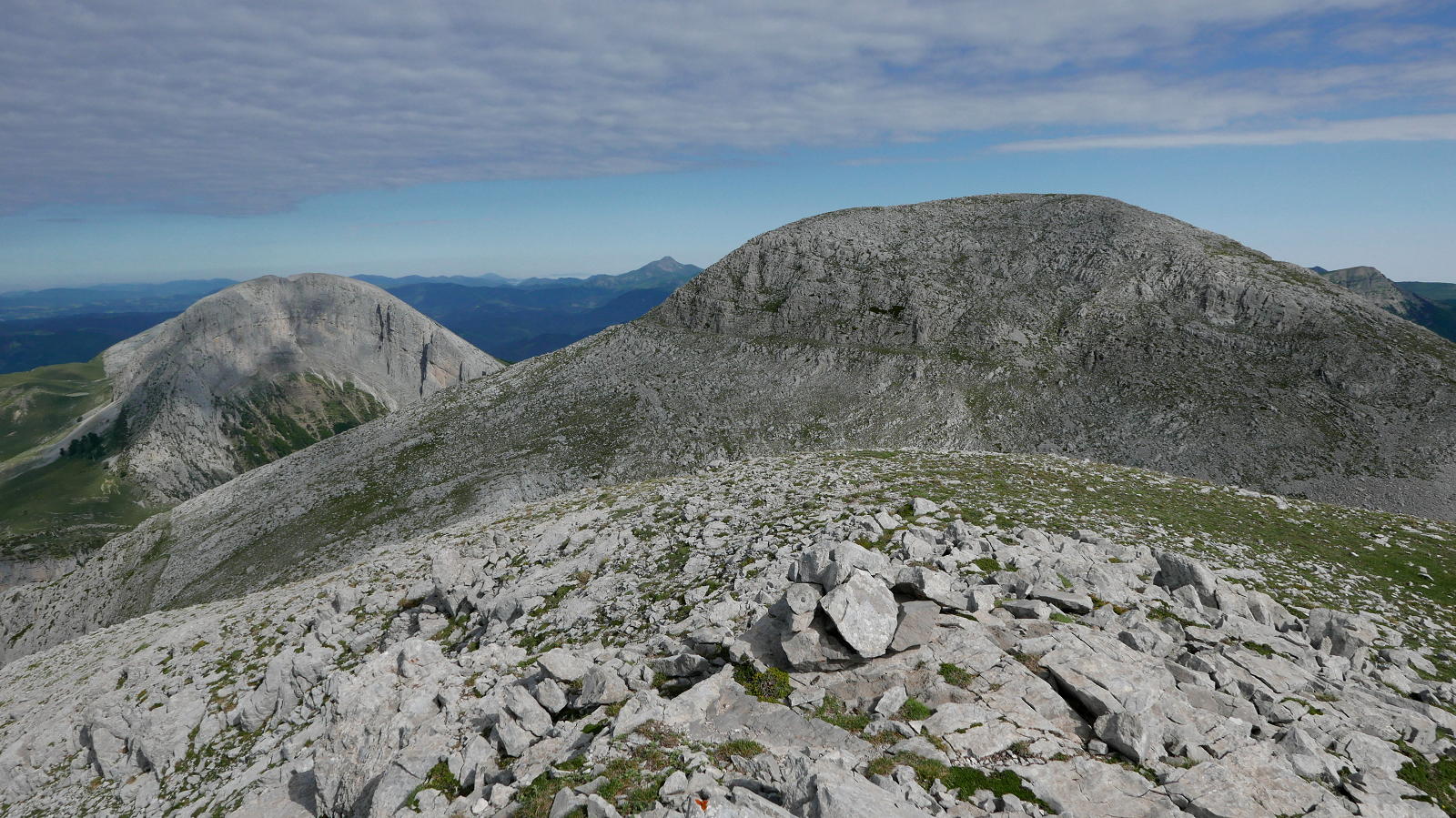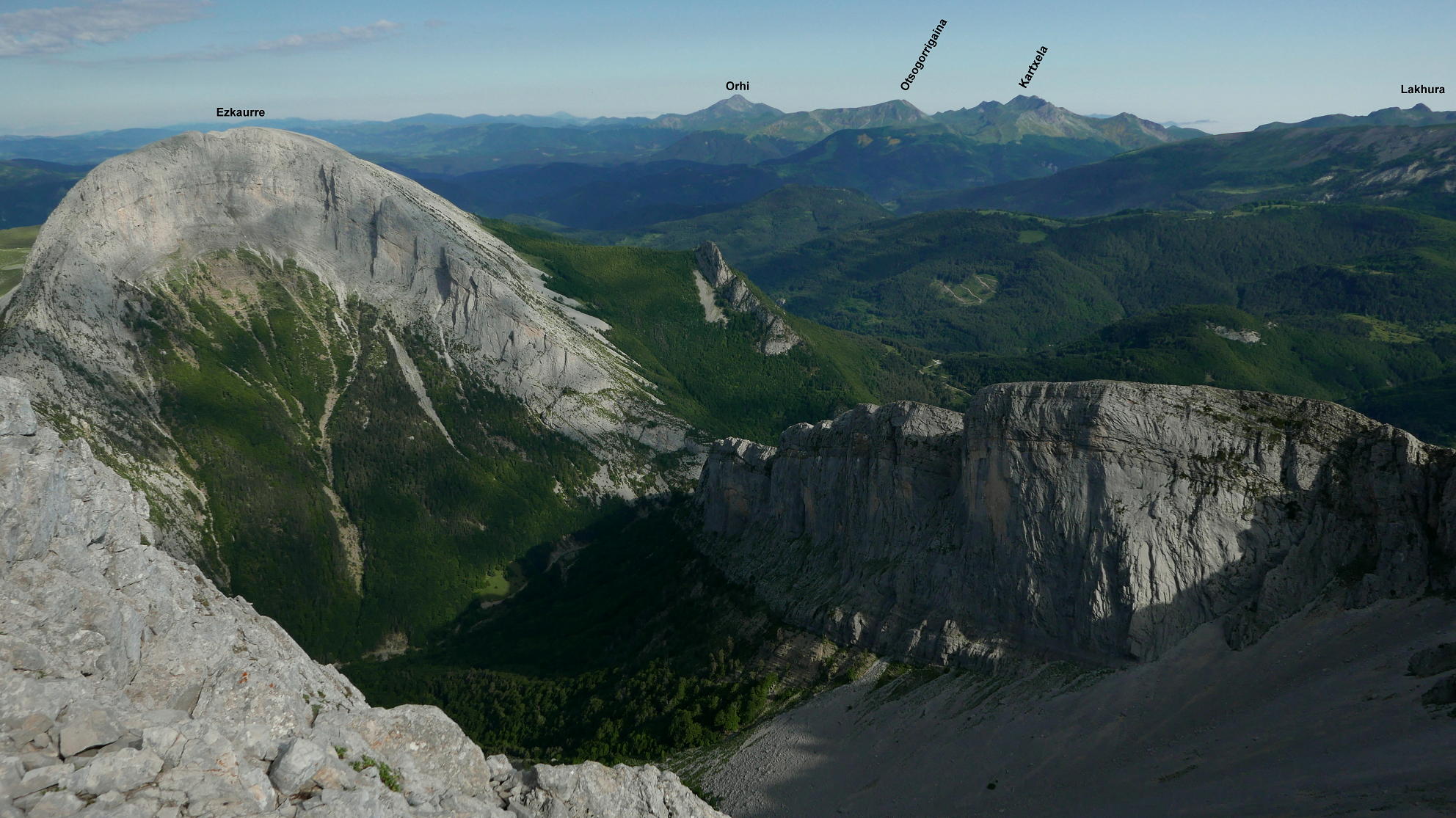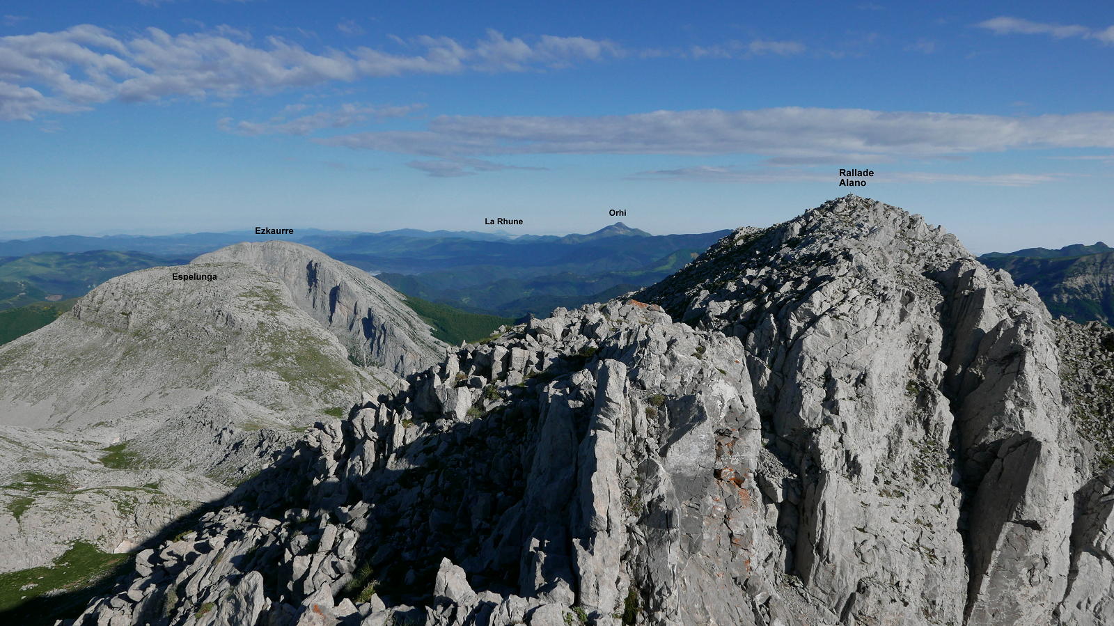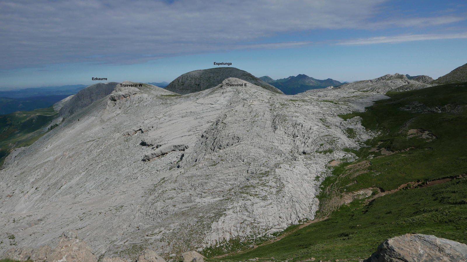 Continúo un poco la cresta hacia el oeste, desciendo luego al sur y sigo hacia el oeste por terreno caótico de karst, bordeando simas y dolinas hasta un difuso collado (lo llamo collado occidental de la Ralla 2062m 2h12′) y luego hasta otro collado (collado oriental del Espelunga 2003m 2h20′), desde el que afronto el lomo oriental hasta la cima del Espelunga (2111m 2h31′). Espléndida vista de la peña Ezkaurre, que parece al alcance de la mano.