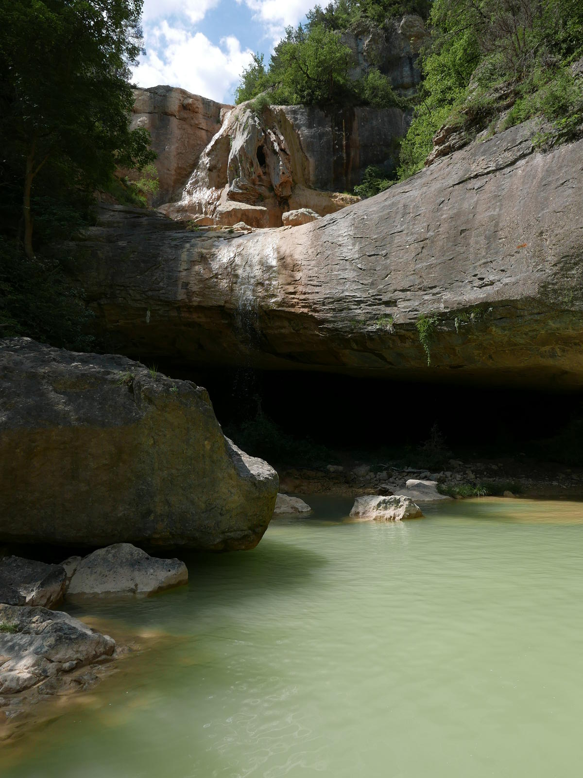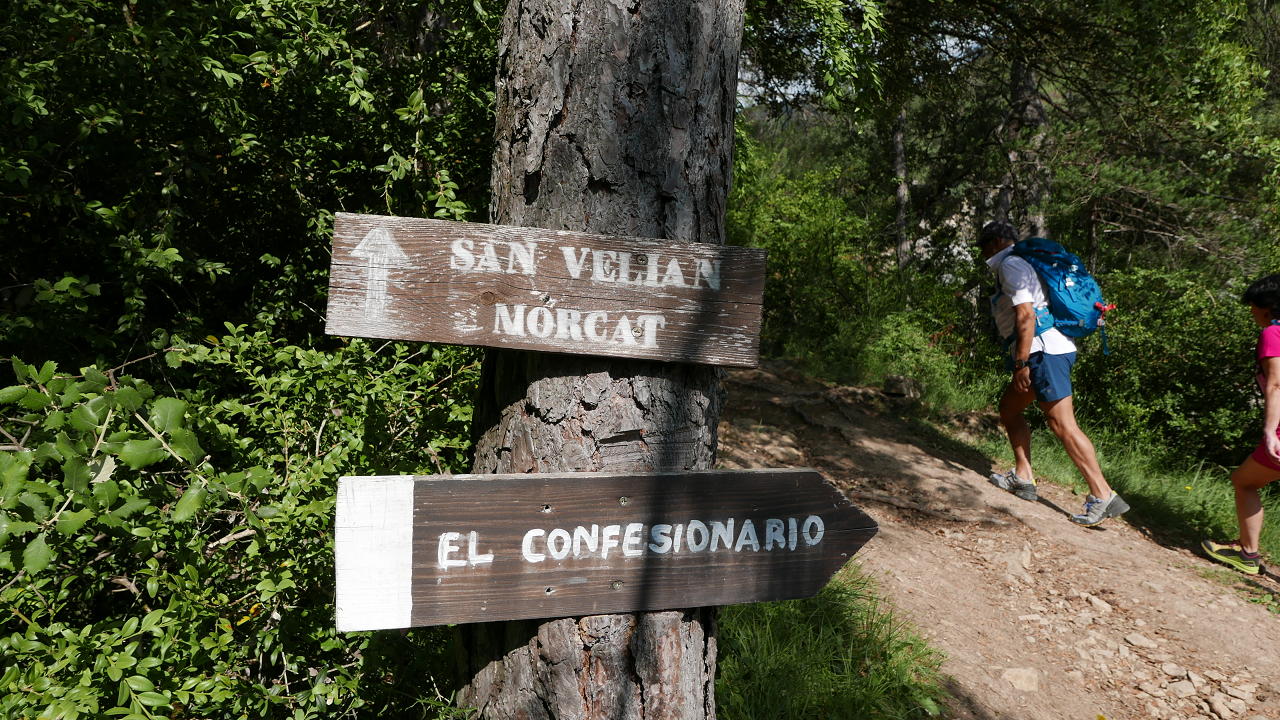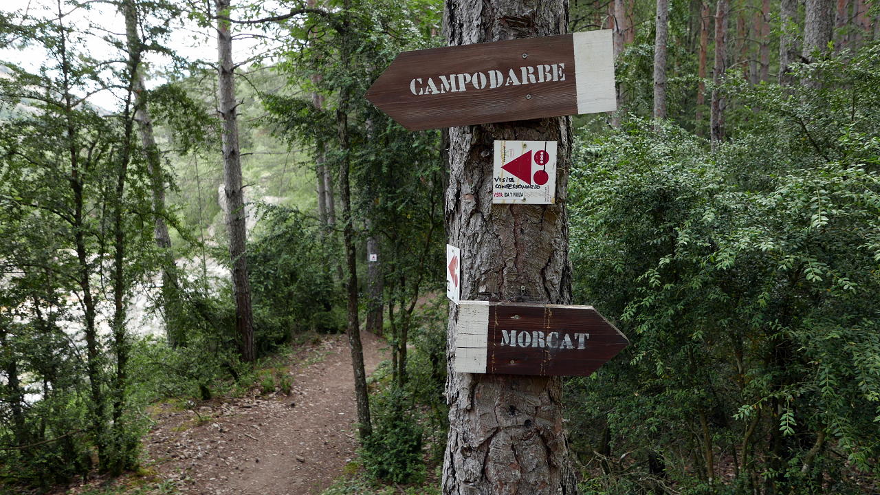 Tomamos una desviación a la derecha (730m 0h21′). Más adelante nos asomamos al mirador de la Predicadera (820m 0h44′), con una gran vista hacia la parte superior del barranco. Otra desviación a la derecha (860m 1h00′) dejando el camino a Morcat a la izquierda y cruzando un barranco para dirigirnos al norte. Se cruza el barranco de Sieste y giramos a la derecha. Iniciamos un camino de descenso hasta la cascada de Campodarbe pasando por las cuevas que debieron ser refugio de pastores (cueva de las Golondrinas), un enclave precioso. Pero volvemos a la senda principal para continuar ya por el cauce y remontar unos metros hasta encontrar la cascada del Confesionario, también llamada Coño del Mundo. Los más atrevidos podemos subir por la izquierda, entre las raíces de unos árboles y con una cuerda de ayuda a la parte de arribas de la cascada.