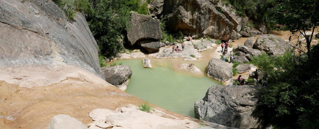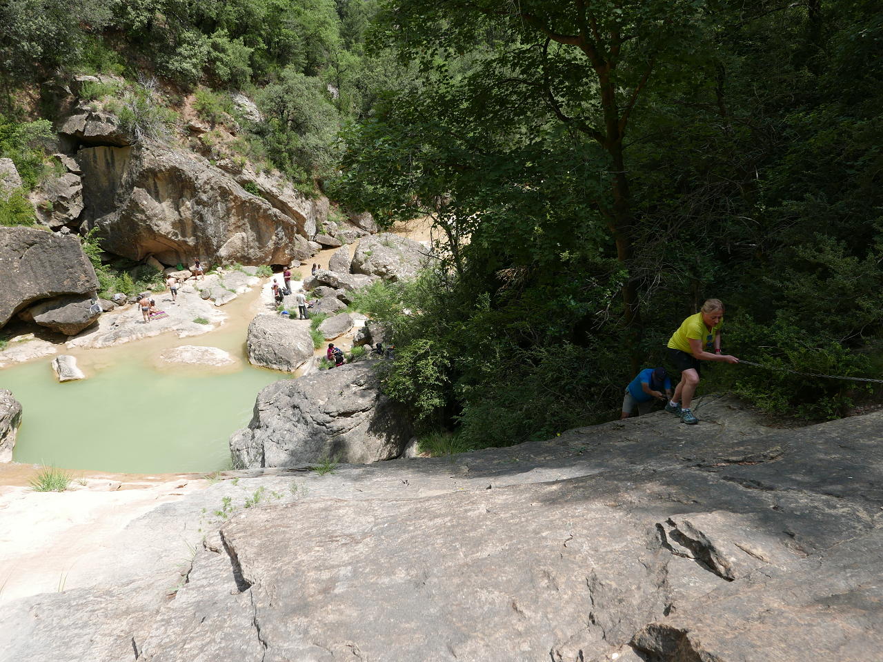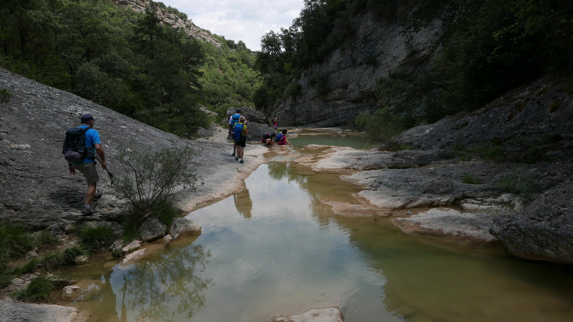 Es un enclave espectacular con acceso relativamente sencillo. La subida por una senda fácil y bien señalizada y el descenso por el cauce del barranco, sin dificultades, pero a veces por algún bloque de roca en el que hay que tener cuidado. El barranco lleva siempre poca agua, así que se puede hacer con calzado normal prácticamente sin mojarse aunque sea junio, supongo que a final de verano casi no habrá agua. En las pozas hay algún bañista, puede que en pleno verano y en fin de semana esté más saturado. En cualquier caso cascadas y pozas son una preciosidad y las ruta es muy divertida. El tiempo de recorrido puede ser más corto, pero nosotros hacemos muchas paradas.