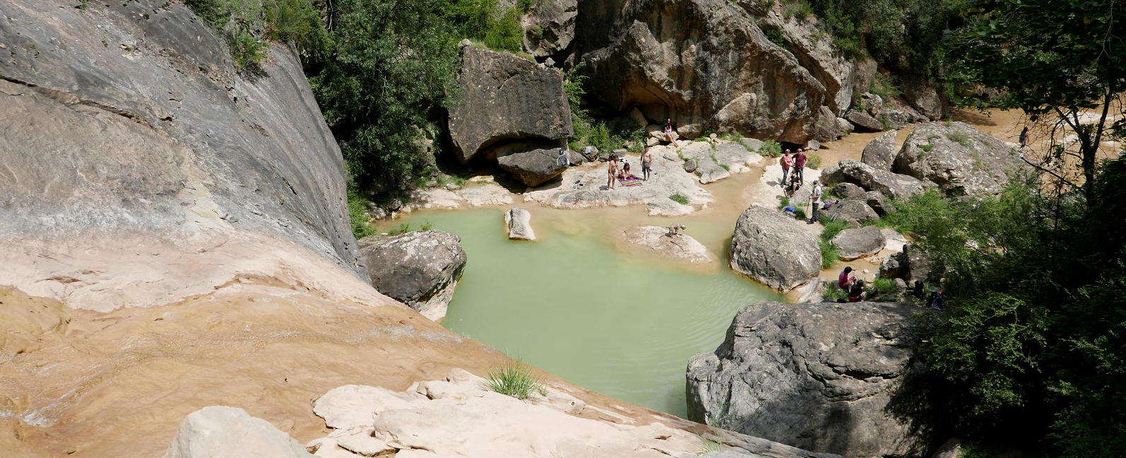 Descripción de la ruta: Desde el aparcamiento (690m) se cruza el río Sieste y la senda sigue l orilla derecha del río. Seguiremos las indicaciones de la ruta «Confesionario por senda» El camino avanza por pinar y el río queda abajo a nuestra derecha, con el cauce y las pozas por donde realizaremos el descenso.