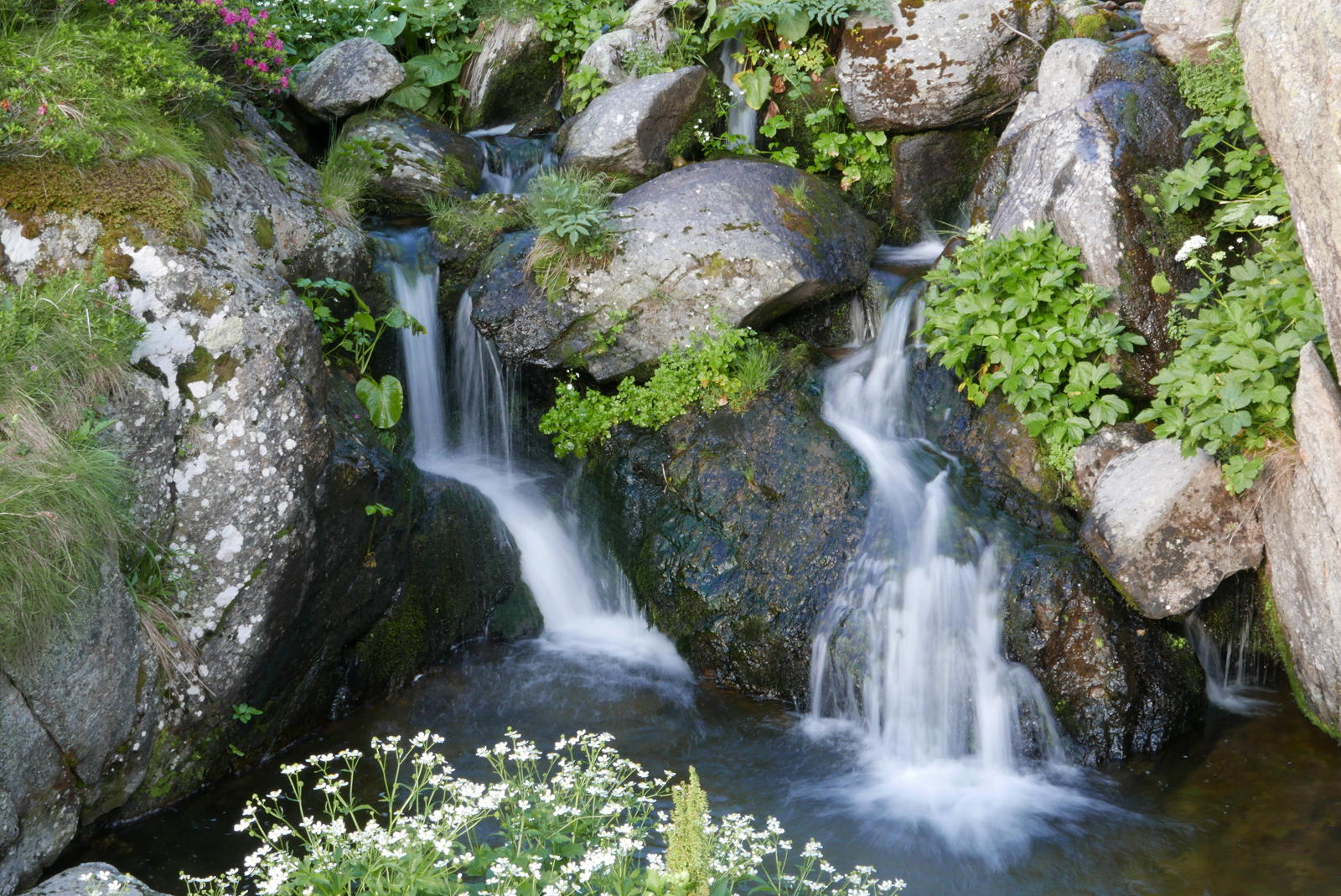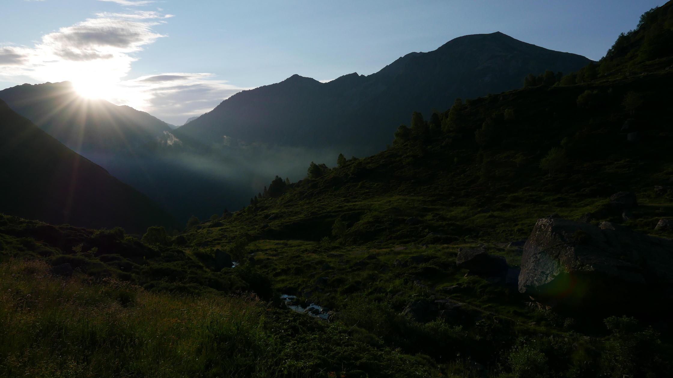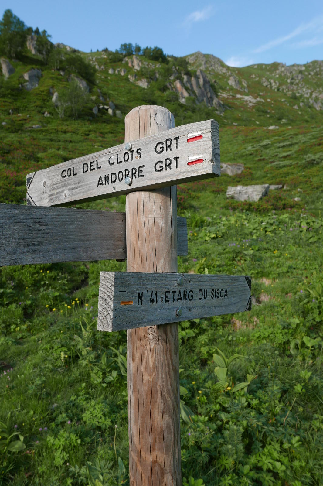 Descripción de la ruta: Desde el aparcamiento de Ste. Suzanne (1430m) se sube a la carretera y, al cruzarla, se inicia una senda sin indicación y algo oculta por la vegetación hasta llegar a un cartel ya por encima de Hospitalet. Camino junto a la tubería forzada hasta un cartel que sigo a la izquierda (1570m 0h19′) (a la derecha indica camino de las cascadas), ascendiendo moderadamente entre hayas. De nuevo otro cartel que sigo a la izquierda (1740m 0h40′), es el punto de conexión del descenso. Sigo junto a la orilla del río Siscar. Atravieso una portilla para ganado (1850m 1h00′). Un nuevo cartel que sigo a la derecha (1960m 1h12′) (a la izquierda va a Andorra). El camino está jalonado con marcas de pintura amarilla.