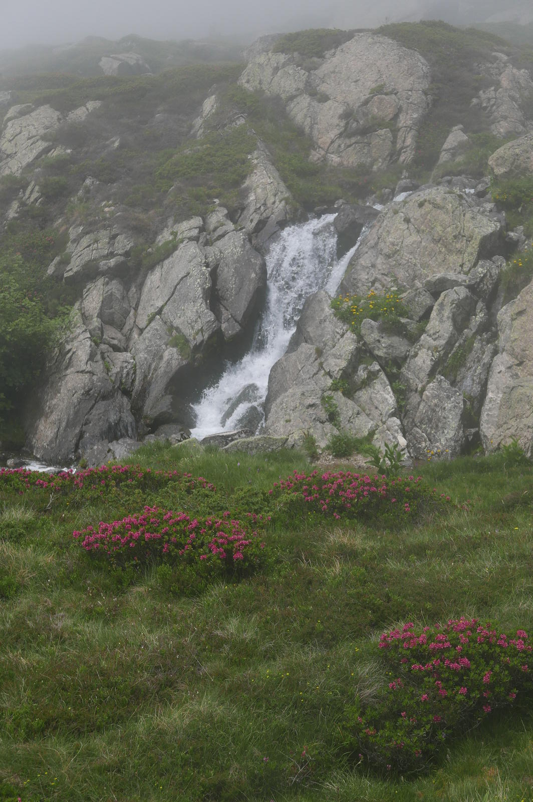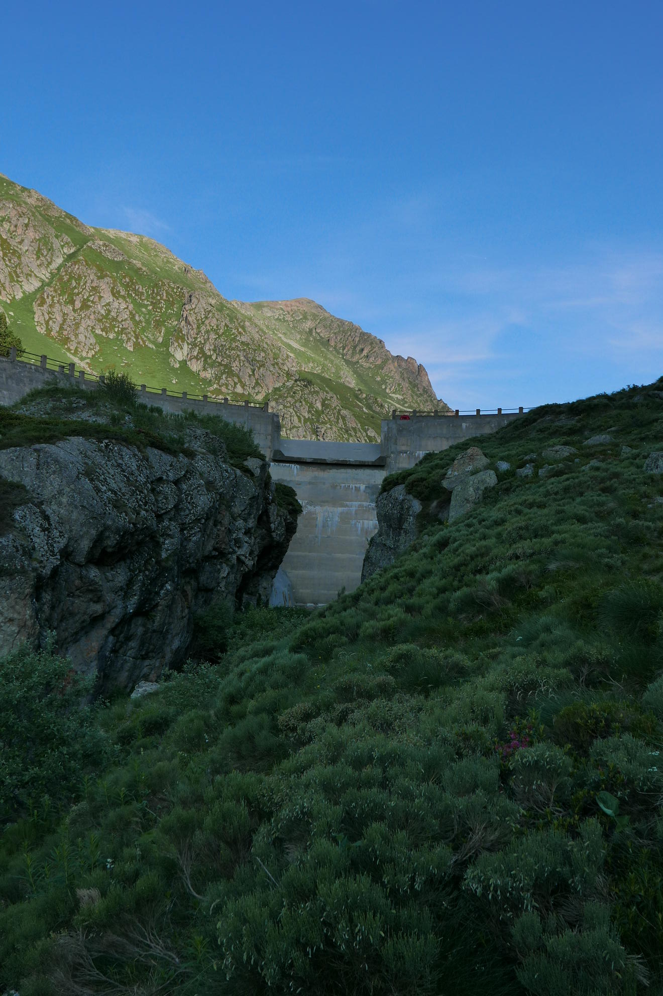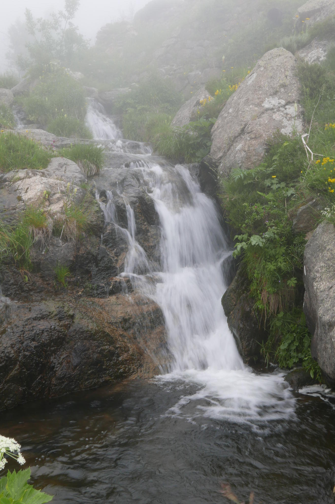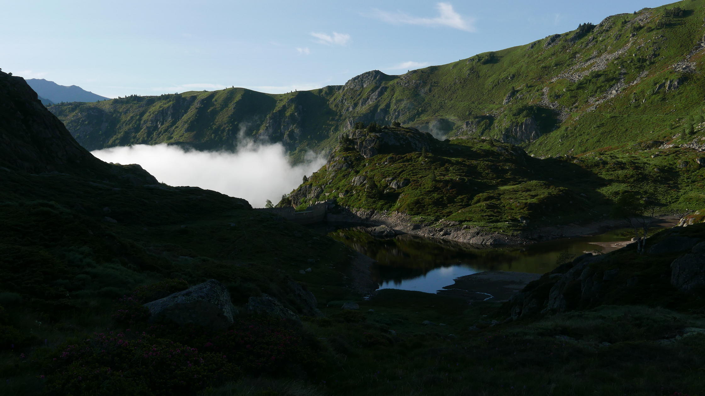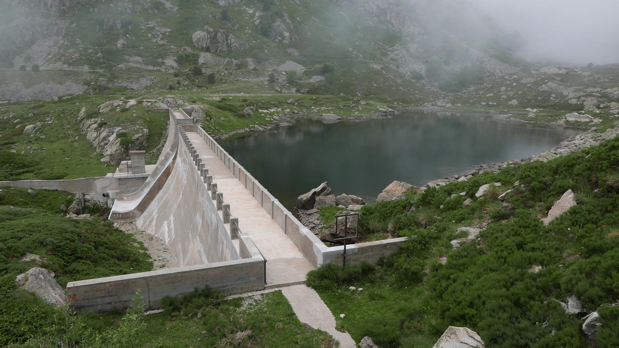 Vuelvo a la Porteilla du Sisca (2440m 6h18′) y ya sigo el camino de marcas amarillas, plácidamente junto al riachuelo. Una tubería de cemento (2180m) lleva al Étanh de Pedorrés (2178m6h46′) y después cruza el río conectando con el GR-T68 (2170m 6h51′). Continúa el suave descenso entrando en la niebla, paso junto a la presa de Arques (1985m 7h20′). Un puente (1820m 7h37′) cruza a la orilla derecha. El camino pasa bajo la tubería forzada (1750m 7h47′) y conecta con la ruta de subida (1740m 7h52′) para descender finalmente al aparcamiento (1430m 8h17′)
