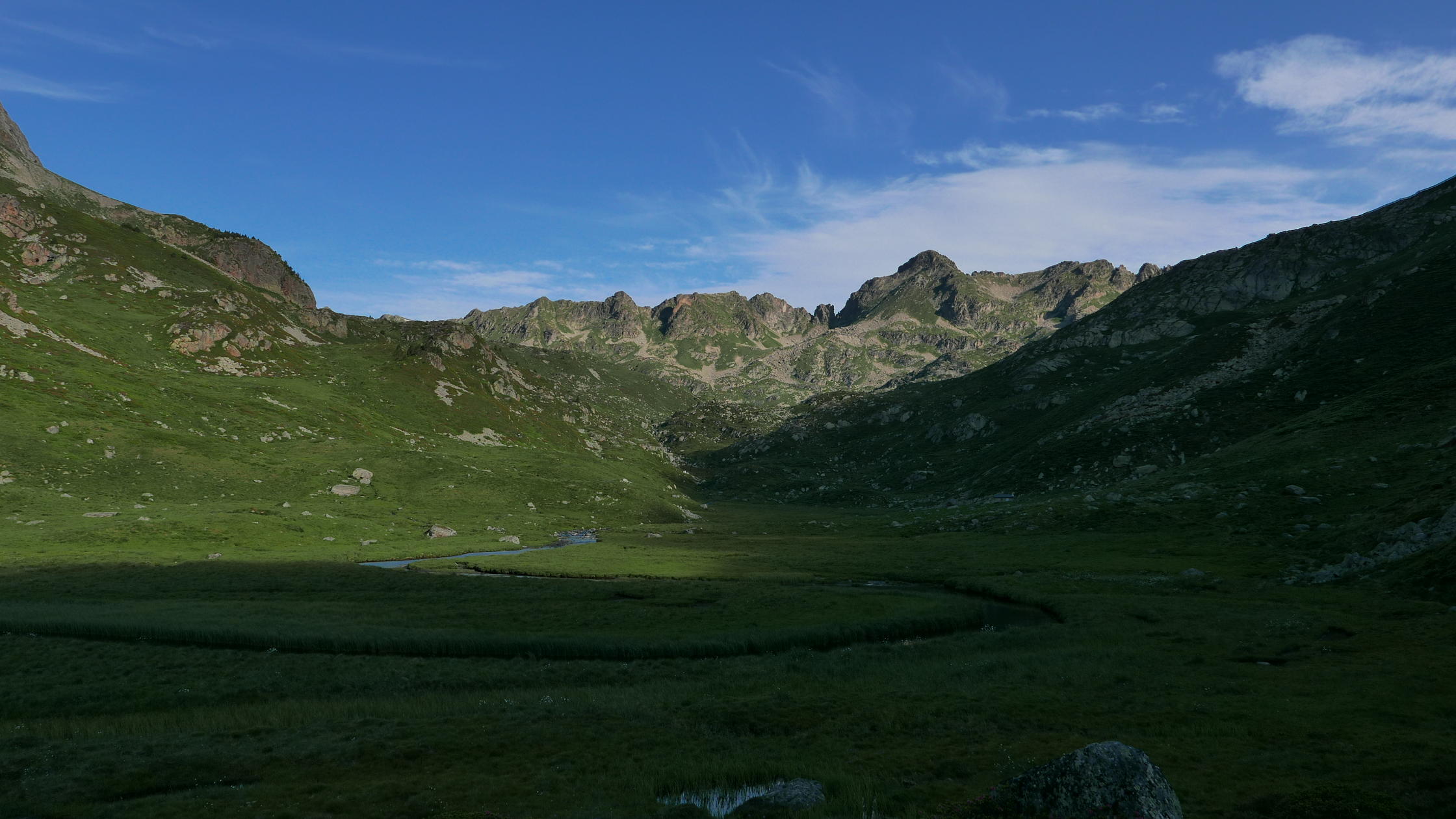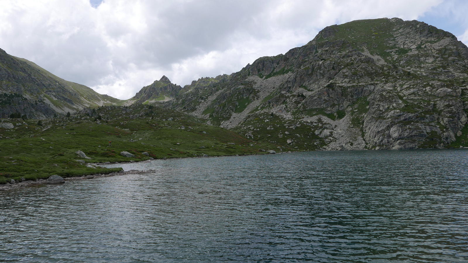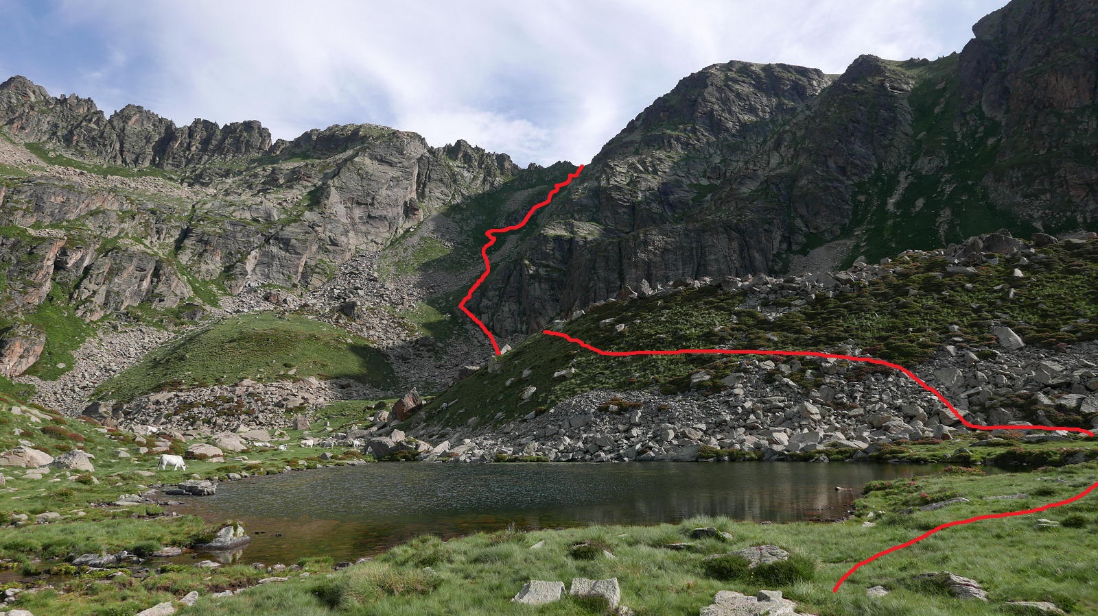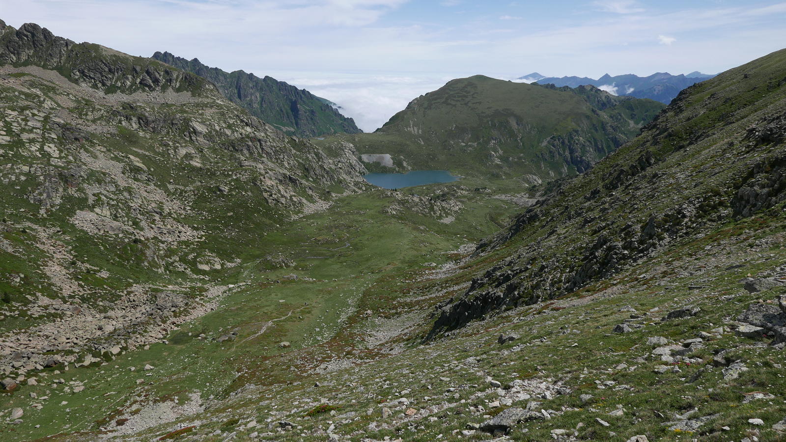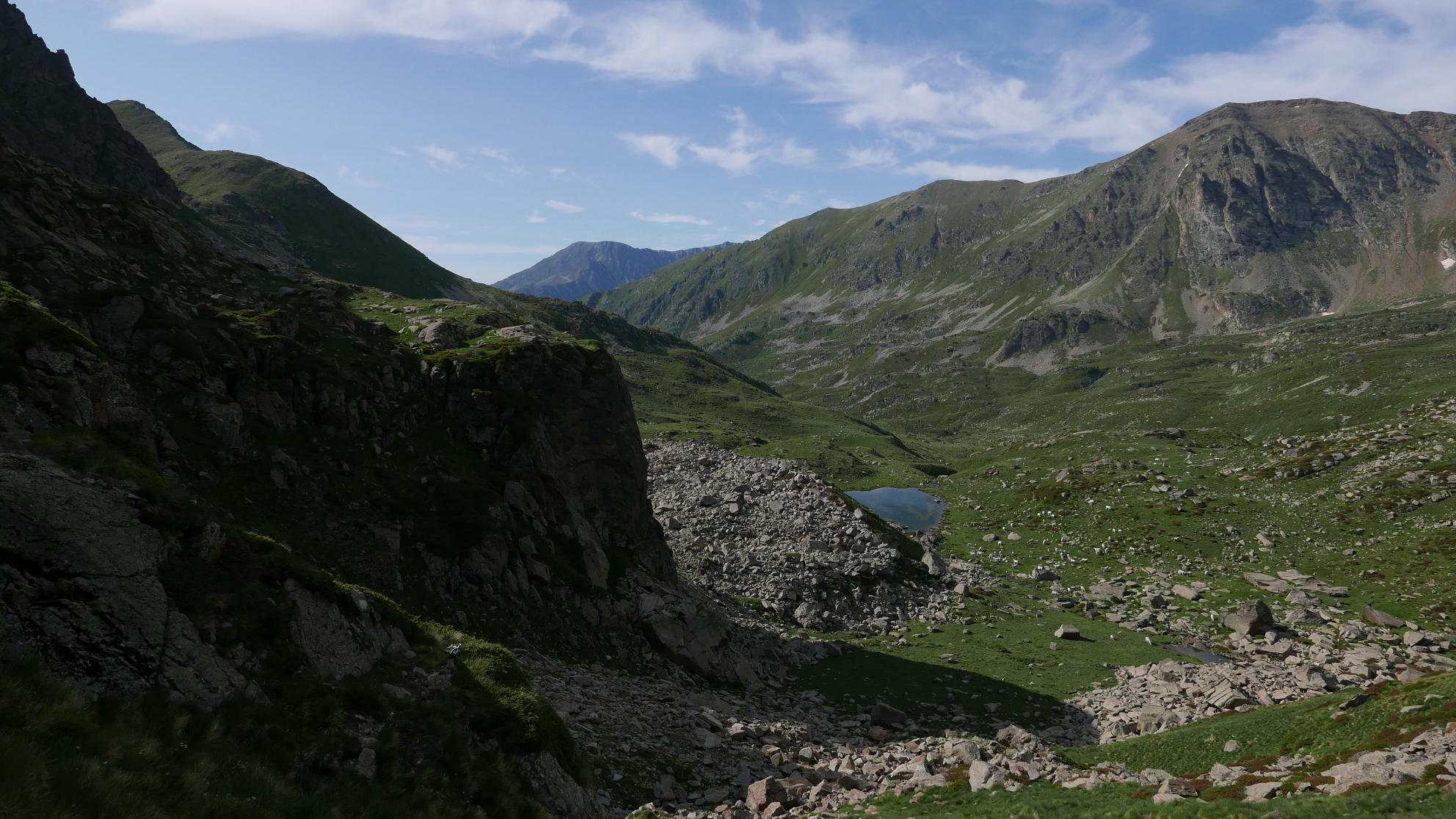 Desciendo de nuevo hacia el sur, pero desviándome hacia la izquierda respecto a la subida. Un gran hito (2705m 4h29′) en el lomo herboso marca la ruta. Aumenta la pendiente, pero no hay que lanzarse por las verticales laderas de la izquierda, más bien girar ligeramente a la derecha y luego hacia una brecha (2575m 4h42′). Desde ahí sí es una canal herbosa muy pendiente con una gran pedrera a mi izquierda. Luego se abre un poco, tengo que pasar alguna pedrera y, poco a poco, va hacia el valle a unirse con el camino del Tour de Nérassol (2340m 5h17′).