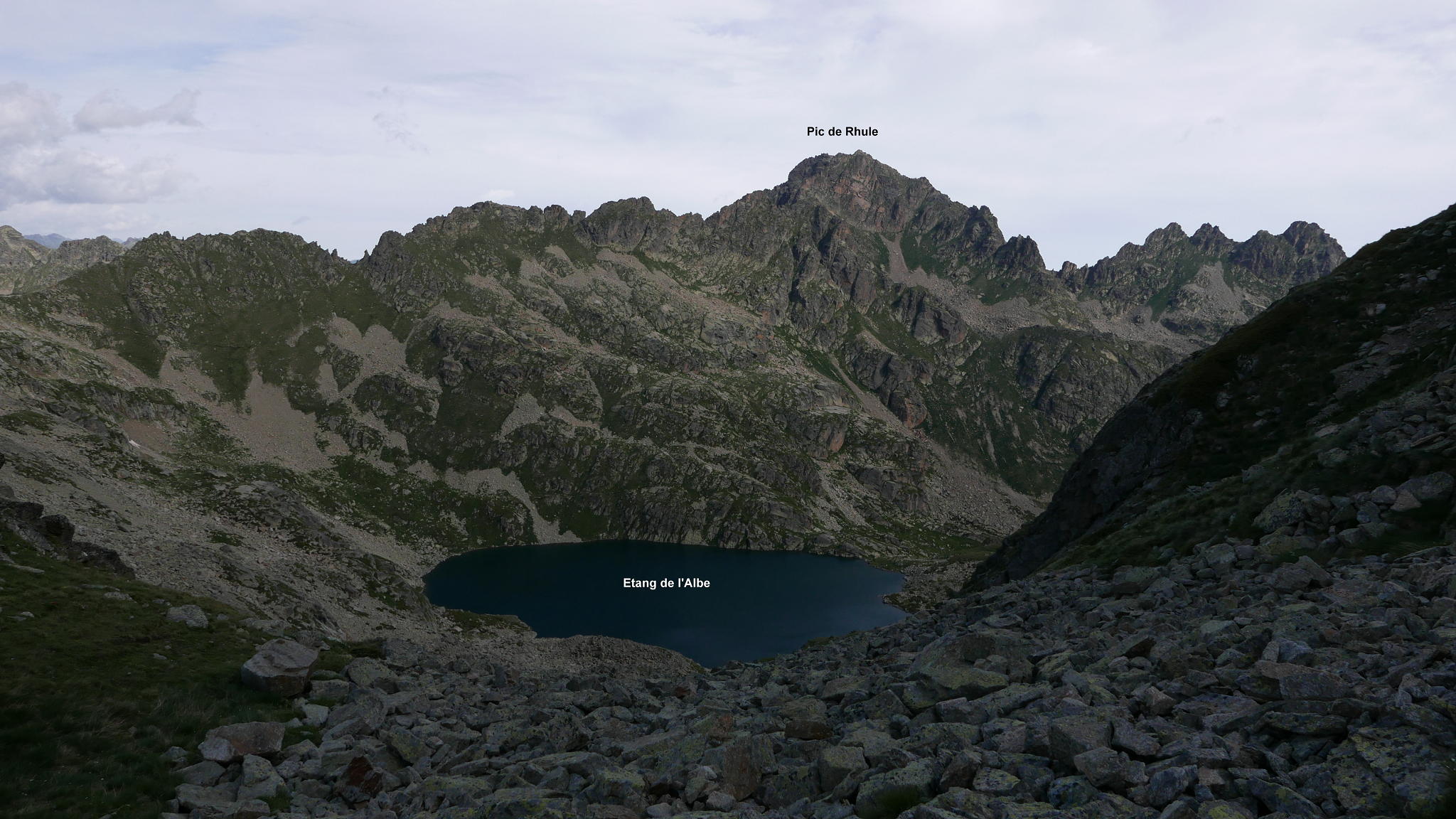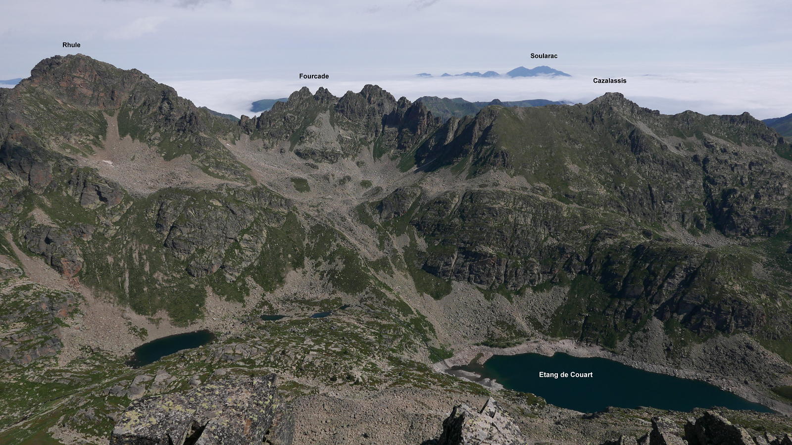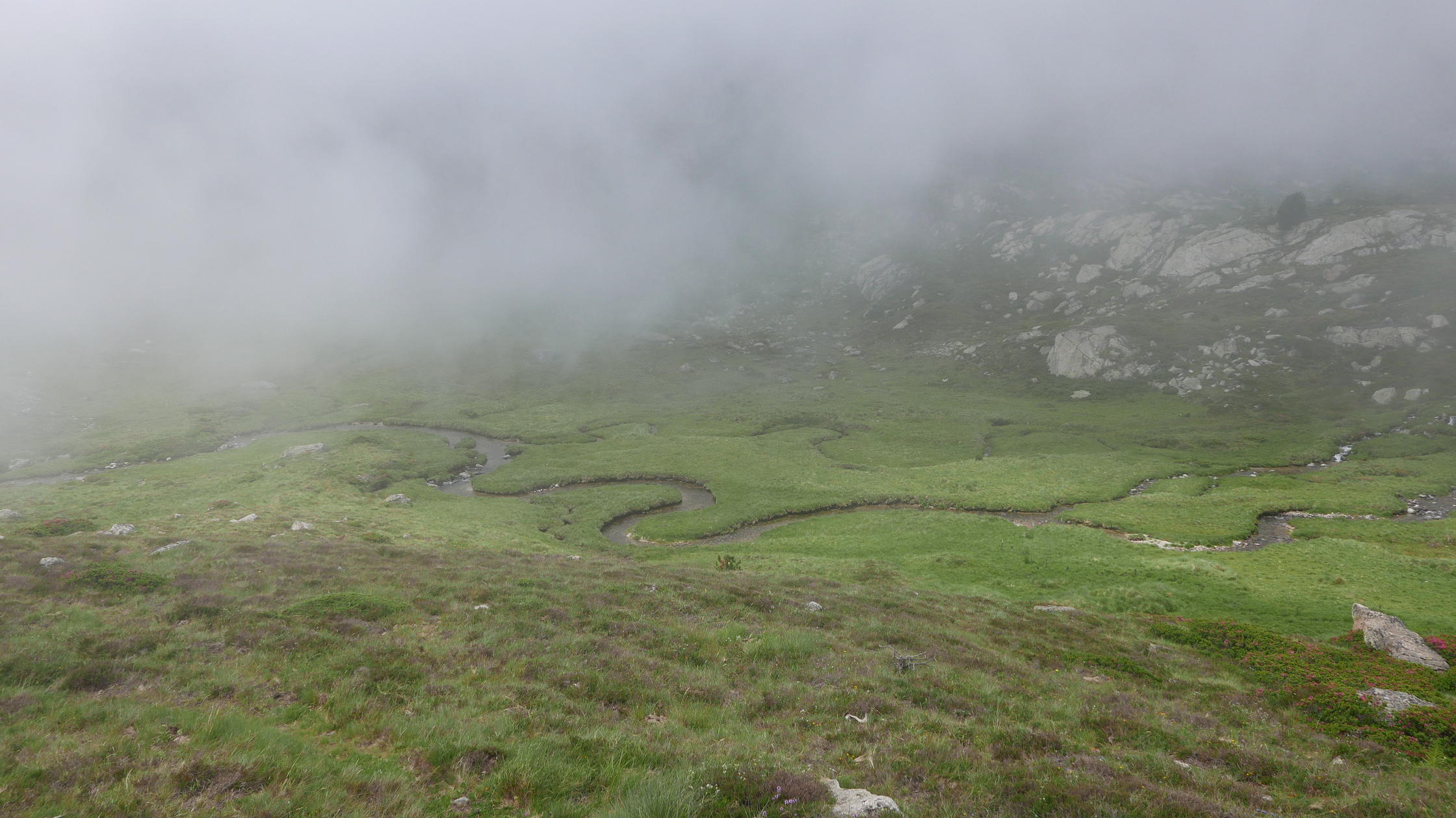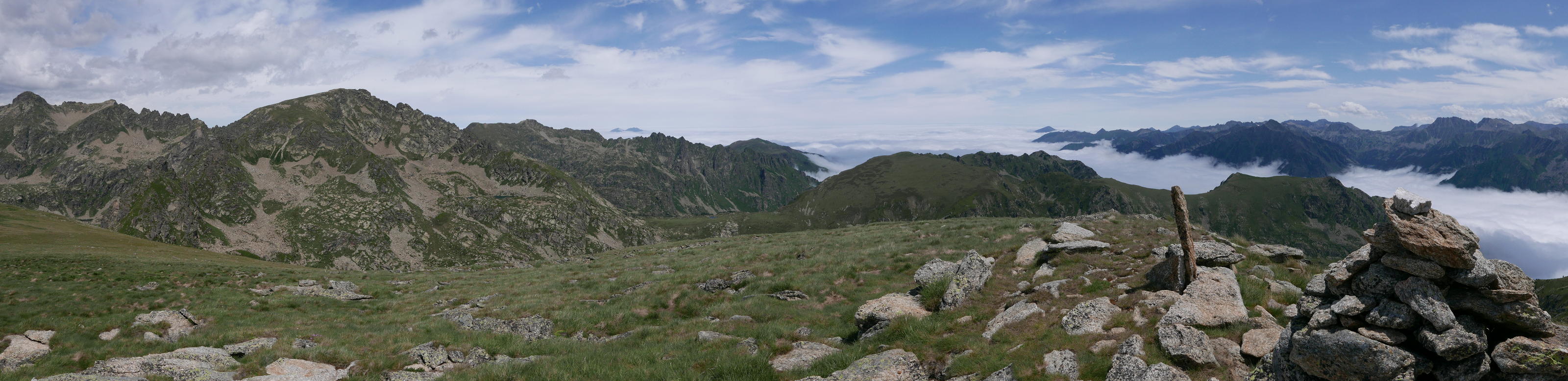 A partir de la presa de Siscar (2070m 1h25′) entro en un suave valle de prados y meandros y el pic Escobes domina al fondo. La niebla que sube del valle amenazante no alcanzará las zonas altas del valle, así que no me dará problemas para subir los picos. Mi primera parada es el refugio de Bésines (2105m 1h50′). Más arriba está el Étang du Siscar (2195m 2h23′), donde el camino gira a la derecha en ascenso. Luego tengo que dejar la ruta del Tour de Nérassol y girar a la izquierda (2250m 2h31′), pasando sobe un laguito que hay a mi derecha y ascendiendo junto al arroyo, más bien por la orilla izquierda, hasta otro laguito, el Étang de Regalécio (2310m 2h45′), que bordeo por la derecha y sigo ascendiendo. El Étang Haut quedará a la izquierda más lejos. Yo voy hacia una marcada canal, medio herbosa medio pedregosa y encuentro un hito (2320m 2h52′).
