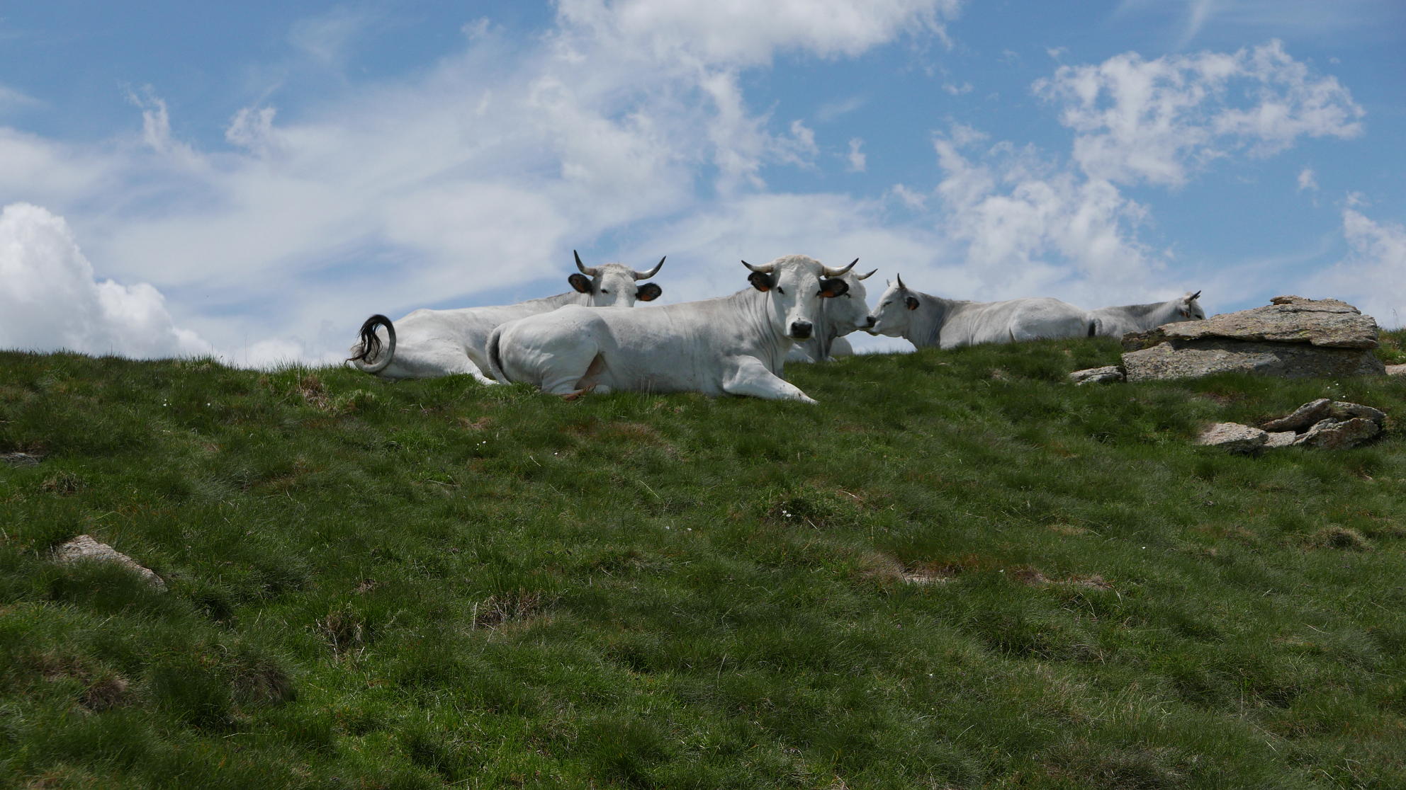 Ya en el camino lo sigo a la derecha para subir a la Porteilla du Sisca (2440m 5h26′) donde tomo, a la izquierda, la cresta oeste del Nérassol. Hay senda poco marcada que faldea por la izquierda, pero en un momento dejo la senda y me voy ladera arriba, llegando a lo que creía el pico pero es solo una antecima (2595m 5h45′). Queda una suave y larga ladera hasta el Pic Nérassol (2633m 5h53′), donde un rebaño de vacas blancas toma el fresco. Hace bastante viento.