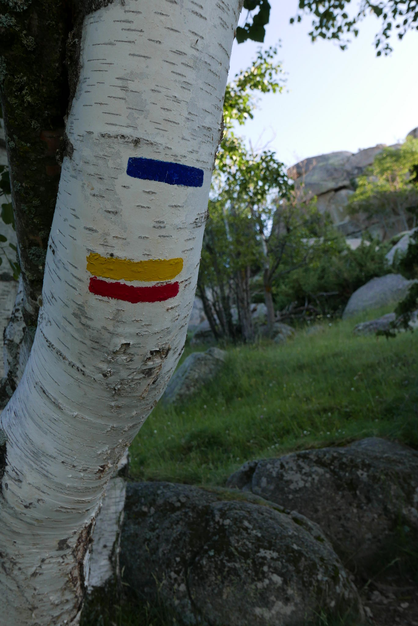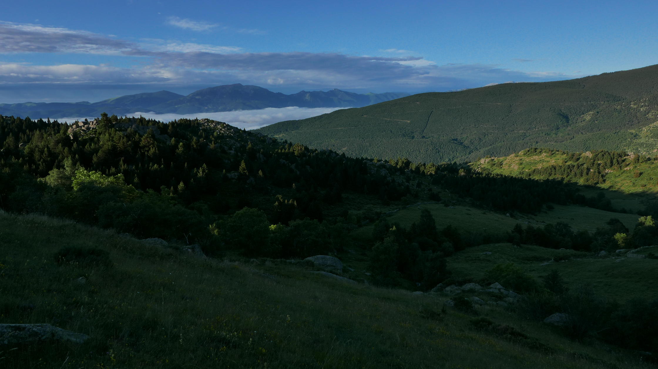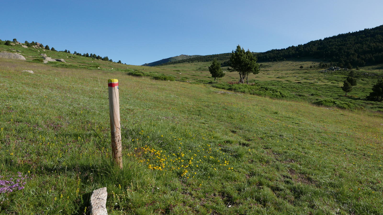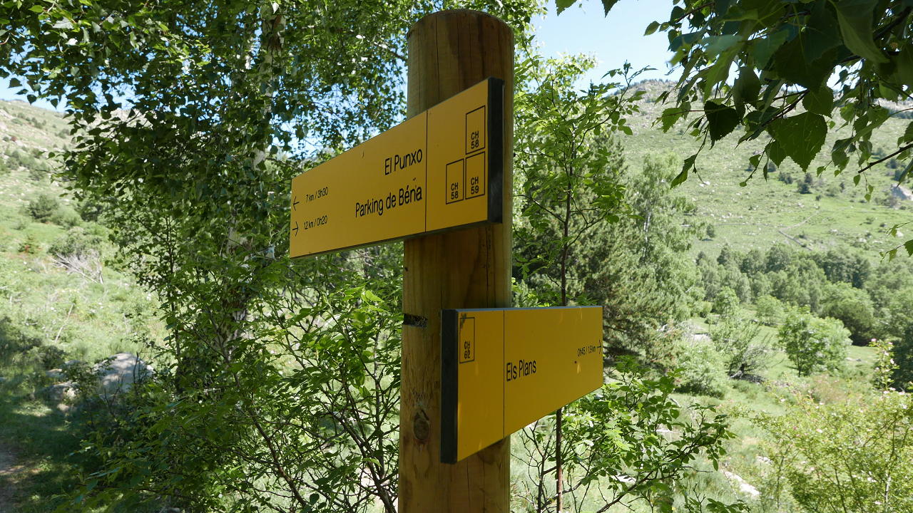 Descripción de la ruta: aparcamiento de Bena (1596m). Aquí llega la ruta que usaré en el descenso y que los carteles indican al Punxó, pero yo tomo la carretera hacia Bena y a unos 200m sale un camino indicado con carteles a la derecha (1585m 0h04′). Esta ruta de subida es mucho más interesante que la de bajada. Una agradable senda con poca pendiente y perfectamente balizada con pintura reciente en rojo/amarillo y azul. La hierba cargada de rocío me empapa botas y calcetines.