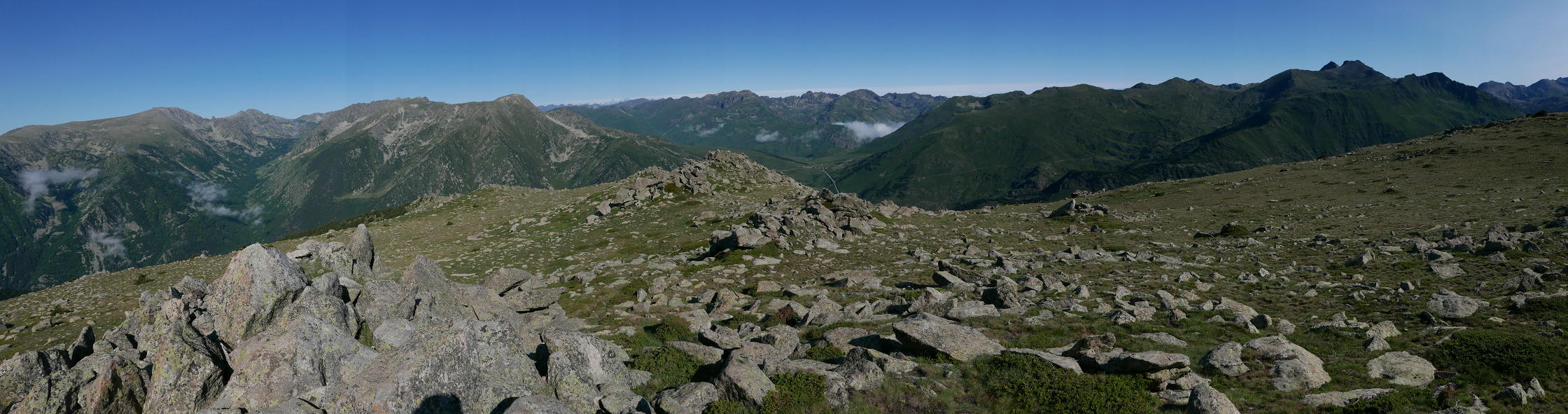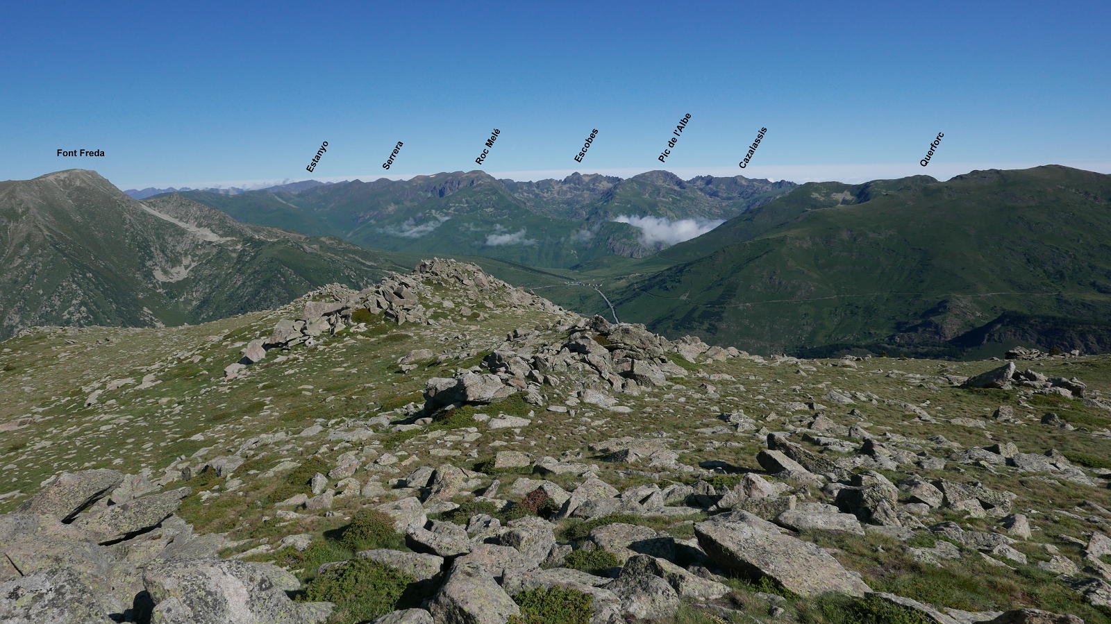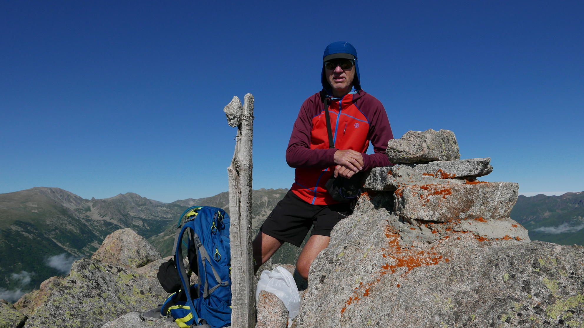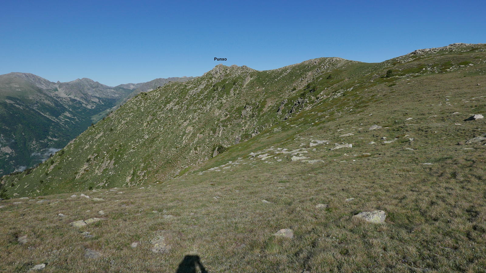 Antes de llegar al amplio collado de l’Homme Mort me desvío a la derecha. El collado queda a mi izquierda cuando alcanzo el lomo (2815m 1h47′). Parece que hay traza de senda pero desaparecerá y atravieso una zona de pinos dispersos. Al final hay un poco más de pendiente para llegar al lomo este del Punxó. Solo hay que seguir el lomo hasta la cima (El Punxó 2581m 2h27′). La cima es un conjunto de bloques de granito que se asoma a un magnífico panorama.