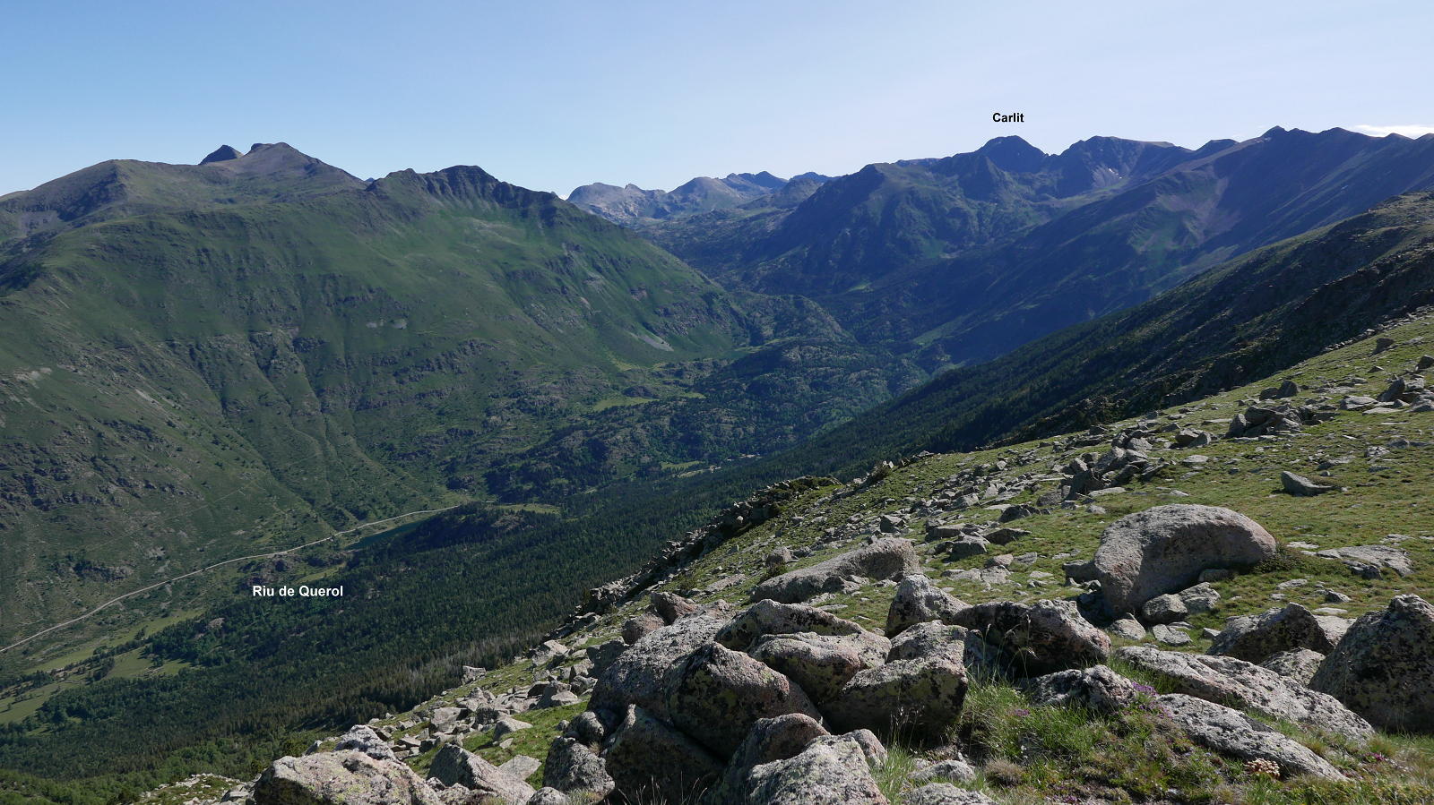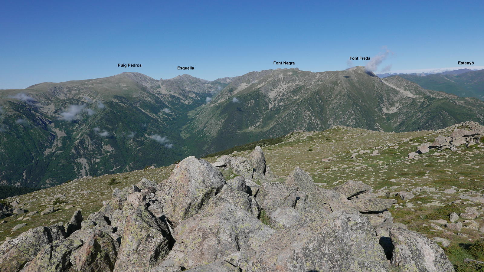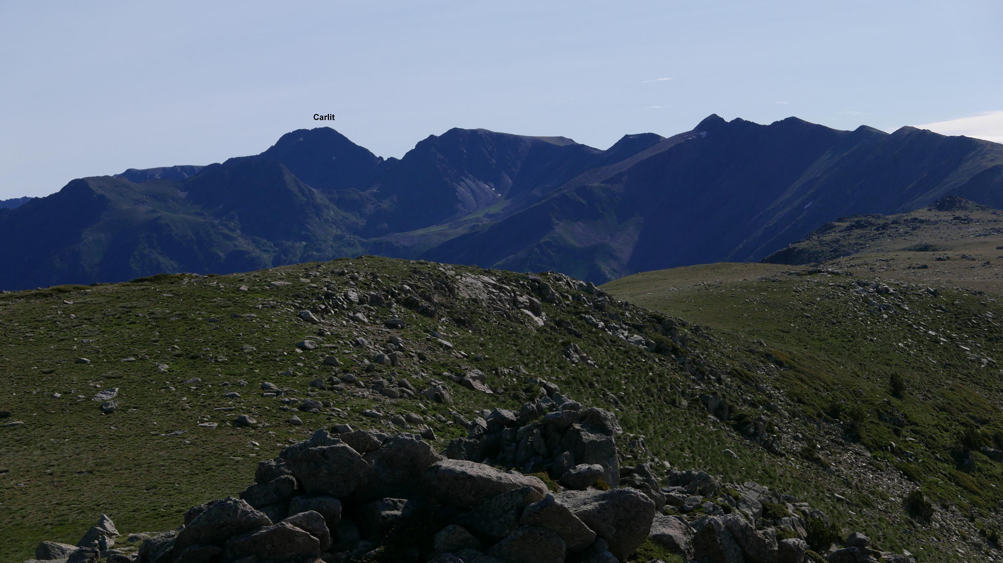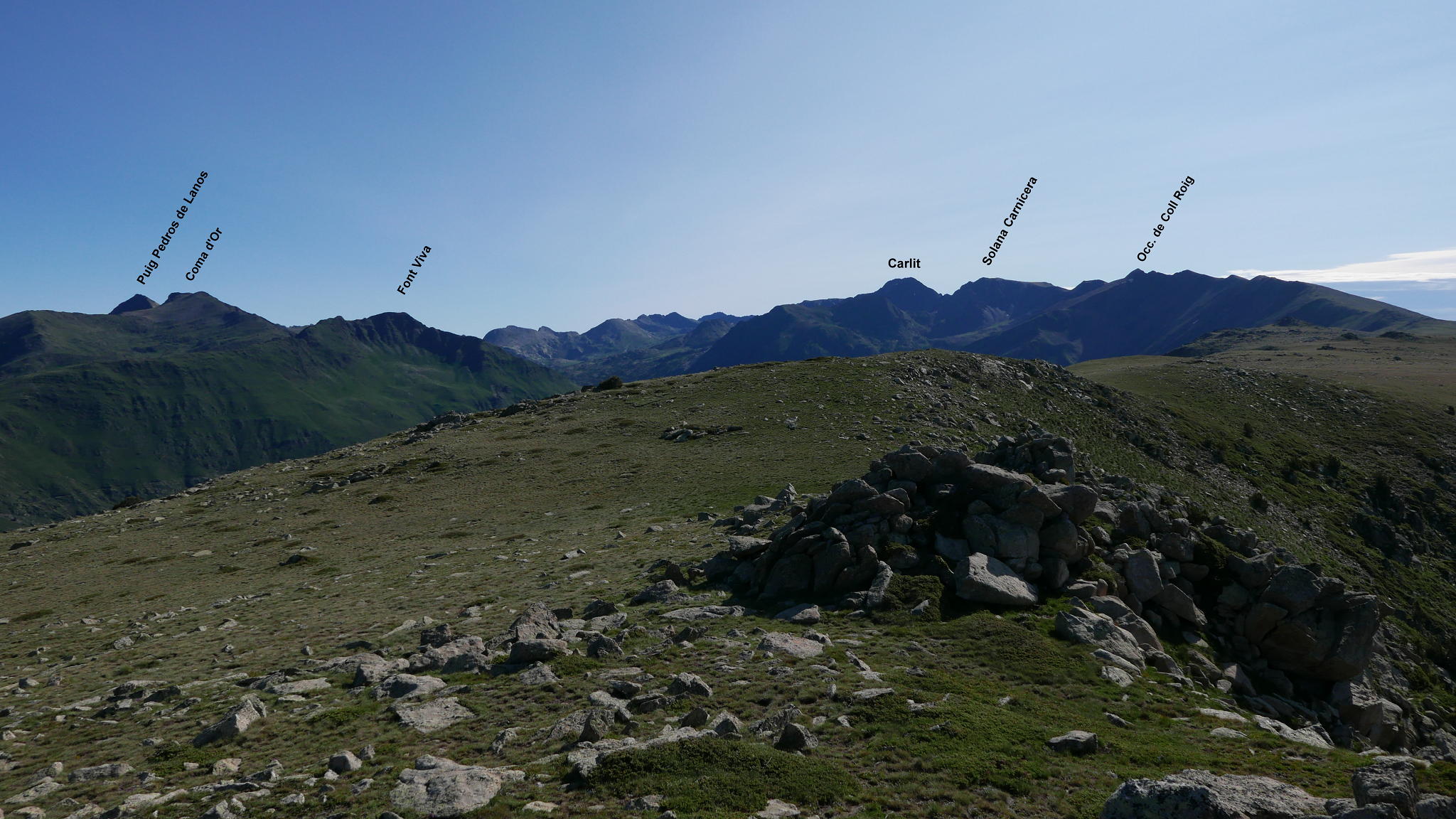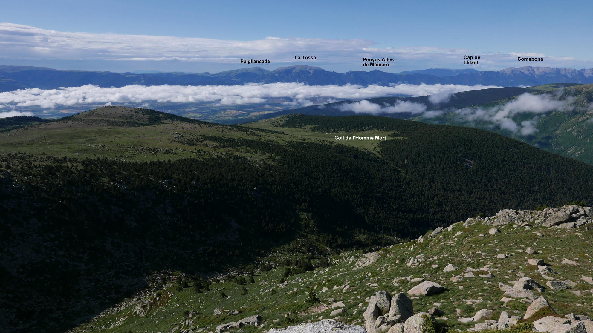Antes de llegar al amplio collado de l’Homme Mort me desvío a la derecha. El collado queda a mi izquierda cuando alcanzo el lomo (2815m 1h47′). Parece que hay traza de senda pero desaparecerá y atravieso una zona de pinos dispersos. Al final hay un poco más de pendiente para llegar al lomo este del Punxó. Solo hay que seguir el lomo hasta la cima (El Punxó 2581m 2h27′). La cima es un conjunto de bloques de granito que se asoma a un magnífico panorama.