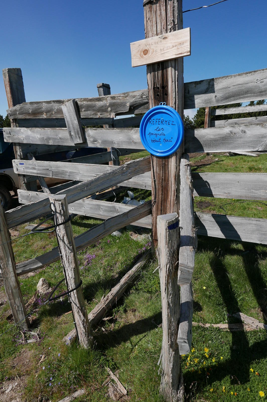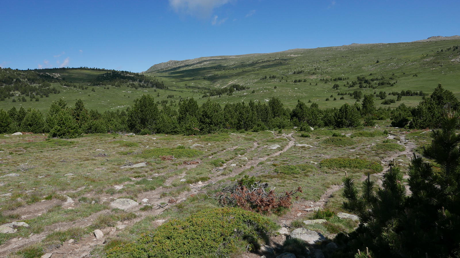 Al regreso sigo el lomo, pero en vez de descender la ladera por donde he subido sigo a la izquierda cerca del lomo, a media ladera. Es una zona suave de pasto, la dirección es ESE, no hay senda ni señalización y tomo como referencia unas vaguadas a lo lejos. Es un largo trayecto, pero es cómodo y con muy poca pendiente, también con alguna zona empantanada. Encuentro finalmente una traza de senda (2235m 3h47′) y una marca azul (2240m 3h55′) antes de llegar a una cerca de ganado (2235m 3h57′) con una valla que cruza de este a oeste. Al otro lado pierdo el camino pero sigo la dirección por prados hasta conectar de nuevo con el camino (2095m 4h13′) que ya no se perderá más.