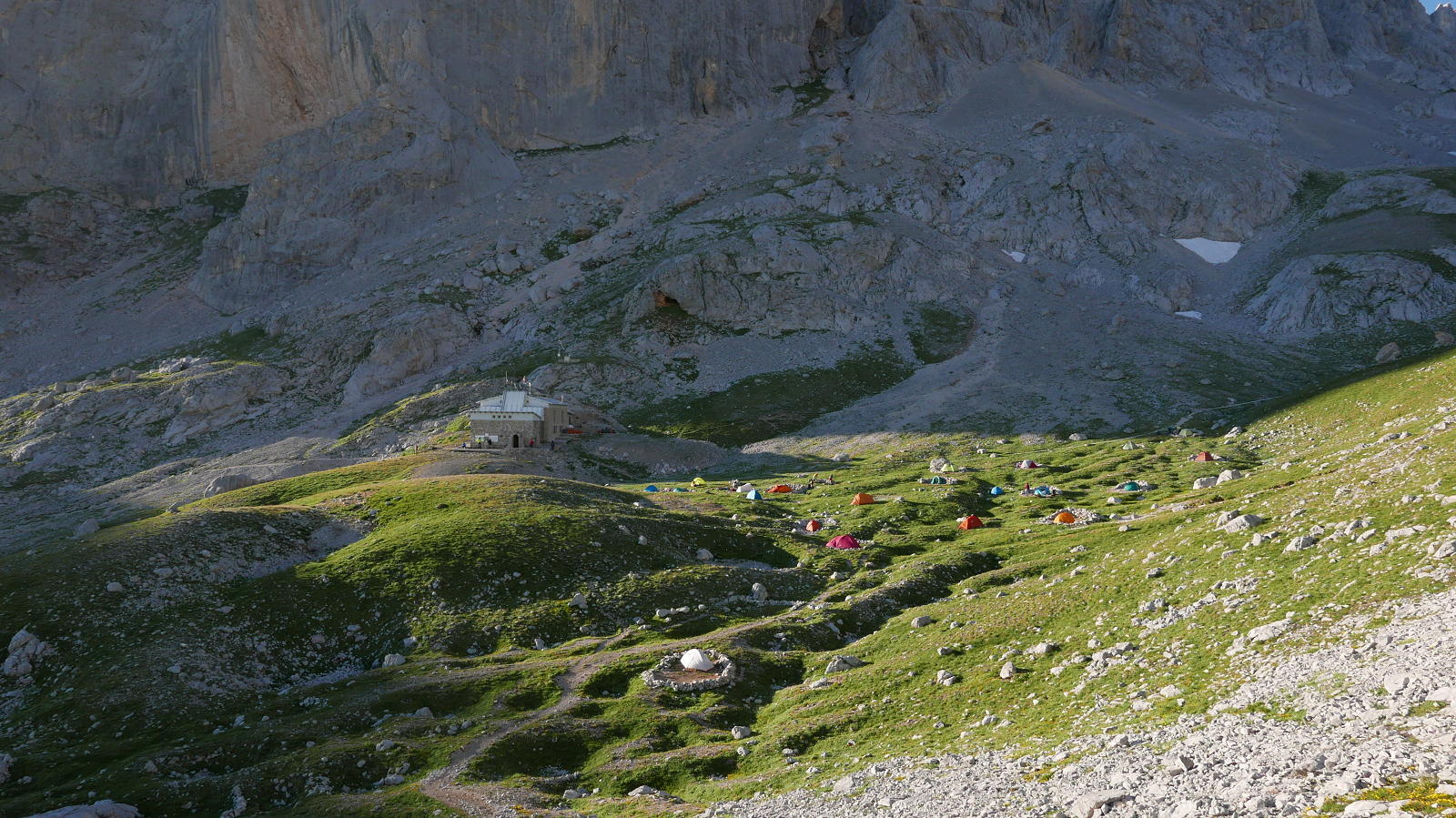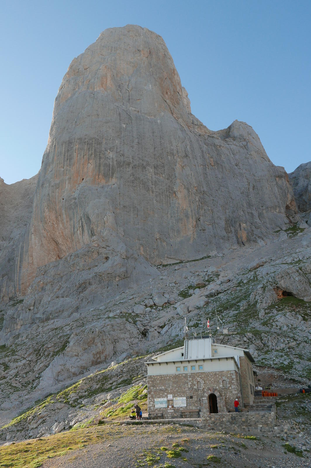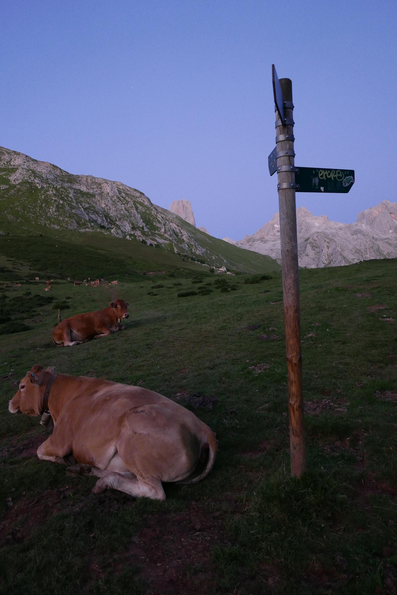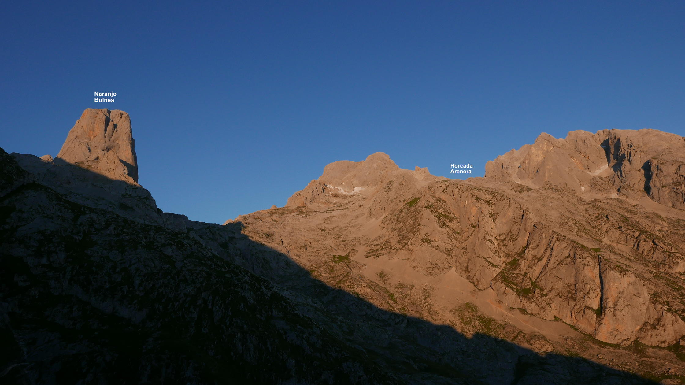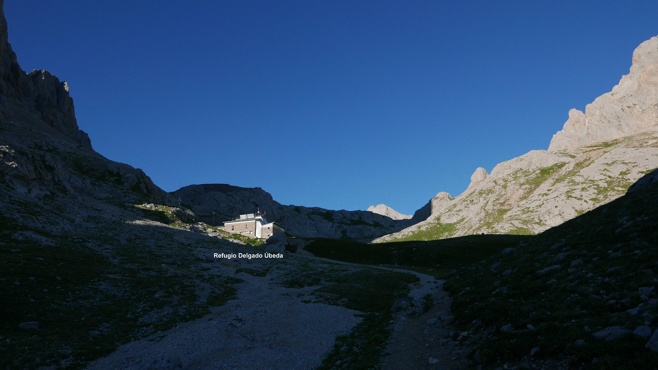 Descripción el recorrido: aparcamiento (1035m). Tengo que hacer andando lo que queda de pista hasta el último parking (1125m) 0h12′), desde donde sale un camino a la derecha al collado Pandébano (1219m 0h22′). El camino pasa por la majada Tenerosa (1300m 0h30′), donde hay un bar, y ya sin pérdida y con las espectaculares vistas del pico Urriello con la luz del amanecer, hasta el refugio Delgado Úbeda (1950m 1h52′) bajo la pared NW del Naranjo. Las praderas en el entorno del refugio están llenas de tiendas de campaña, así que supongo que será complicado reservar noche en el refugio. Hasta aquí hay marcas amarillas y blancas.