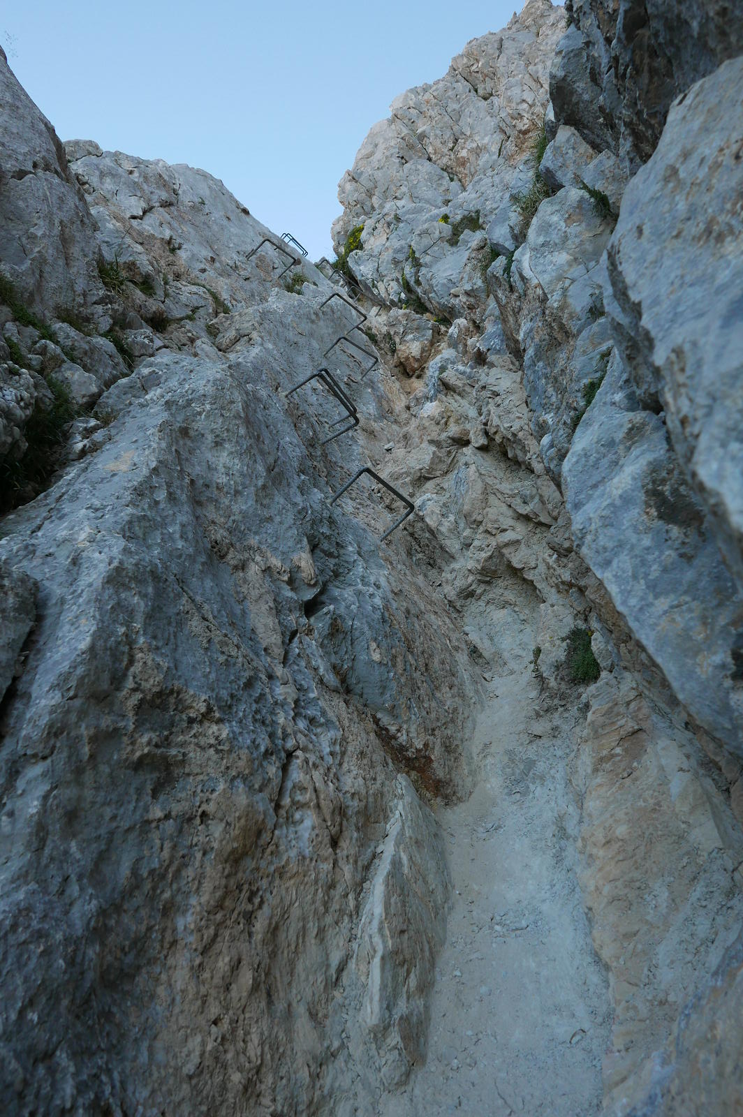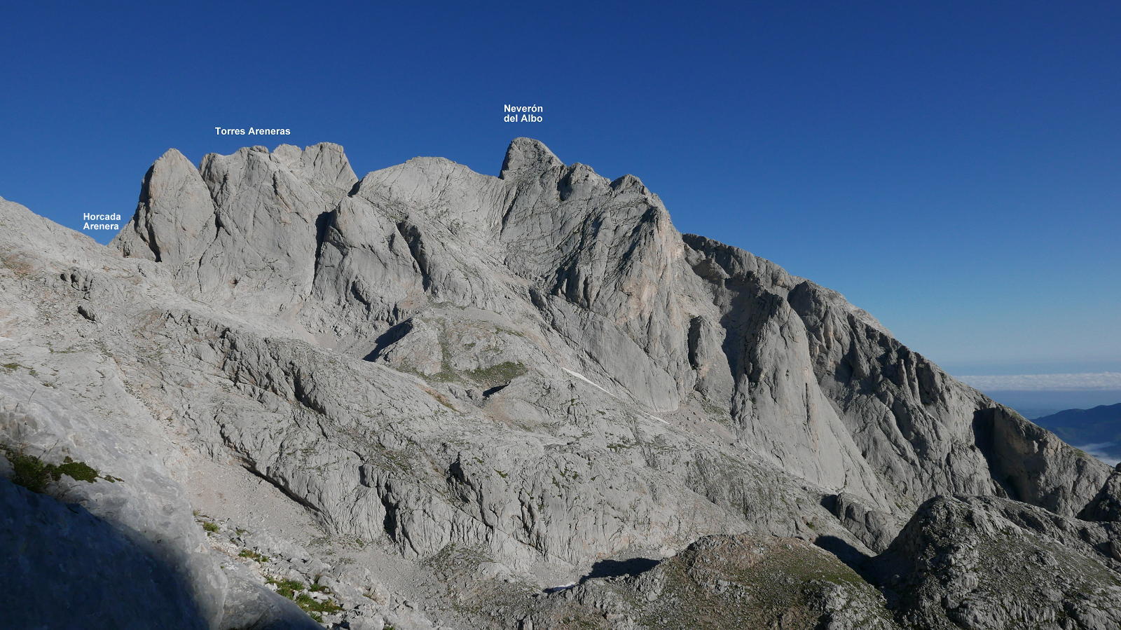 Una senda sale a la derecha, frente al refugio (NW). A partir de aquí hay hitos y alguna marca de pintura verde. Se pasa a la derecha del Neverón y el Diente de Urriello por la Corona del Raso (2175m 2h26′) (en algunas descripciones la llaman Brecha de los Cazadores, pero consultando en foros parece ser que la Brecha está al SW, más cerca del Diente de Urriello), con una chimenea equipada con cadenas y grapas superando la cresta NE del Diente. Este equipamiento es bastante reciente. Faldeando casi en llano se llega a la Horcada Arenera (2273m 2h47′), entre el Neverón Albo/Torres Areneras y el Neverón de Urriello, que da paso a un terreno de jous tras los cuales están los picos de los Cabrones, la Torre Labrouche y el Torrecerredo.