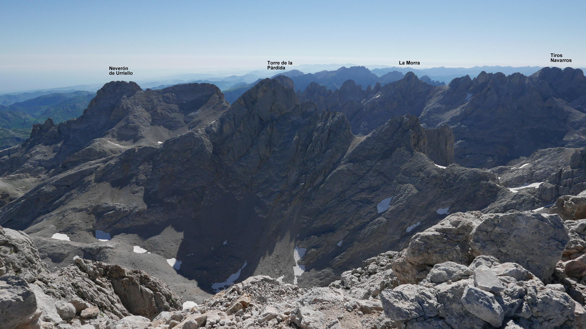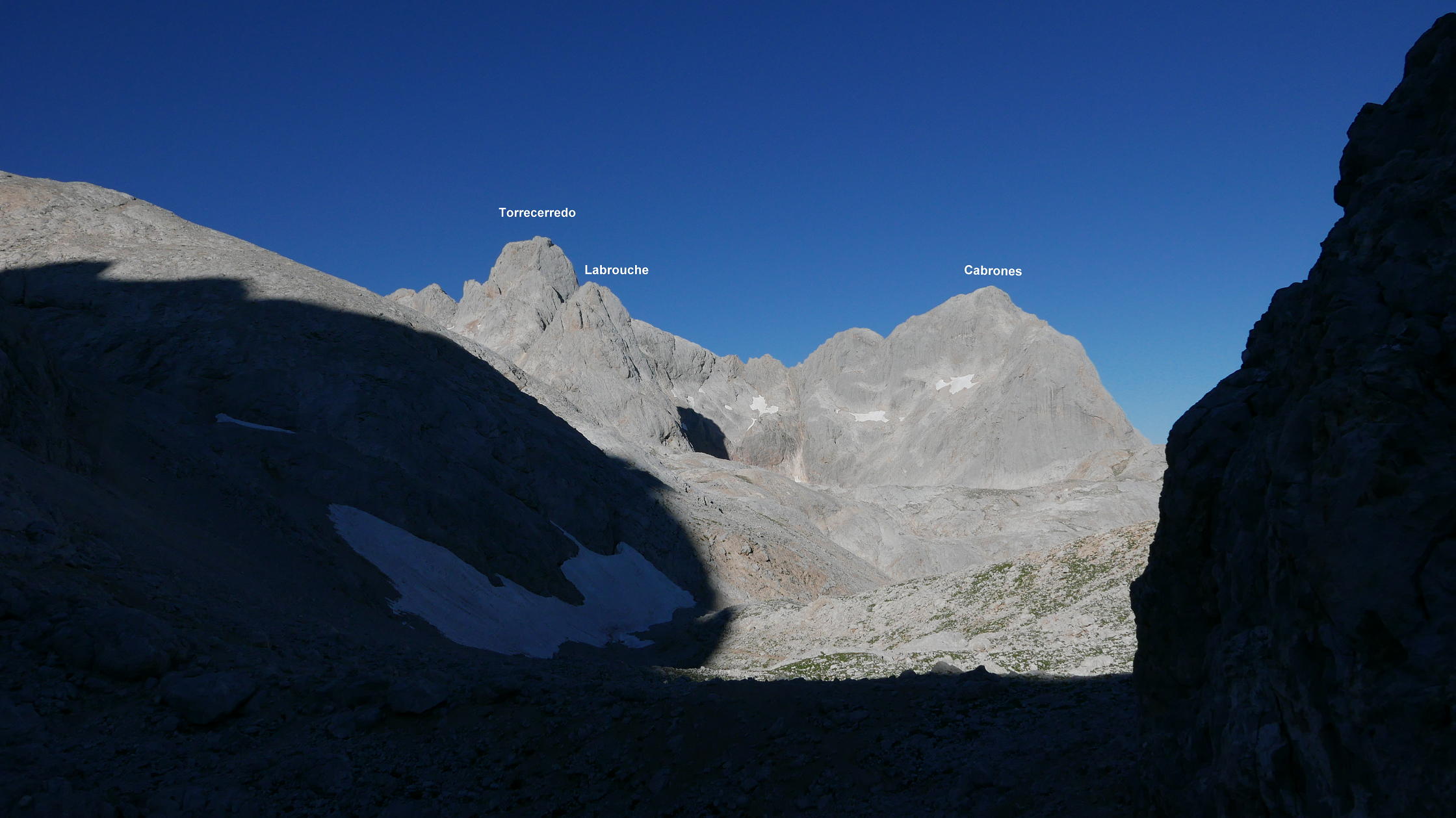 Hay un ligero descenso, pero enseguida me desvío a la izquierda, ya que de frente se va al refugio Jou de los Cabrones. Por tanto hacia el sur, faldeando el Neverón de Urriello, con algunos pasos por roca y parece que con varias opciones de senda, me voy dirigiendo hacia el Jou de Cerredo. Aunque hay hitos, es fácil despistarse un poco. Hay una senda a la izquierda que parece más marcada, pero no hay que seguirla, sino que hay que dejar a la izquierda el Jou de Cerredo, girando un poco a la derecha hacia la Torre de Labrouche. La torre Labrouche se bordea por el sur para ir entrando en las faldas del Torrecerredo.