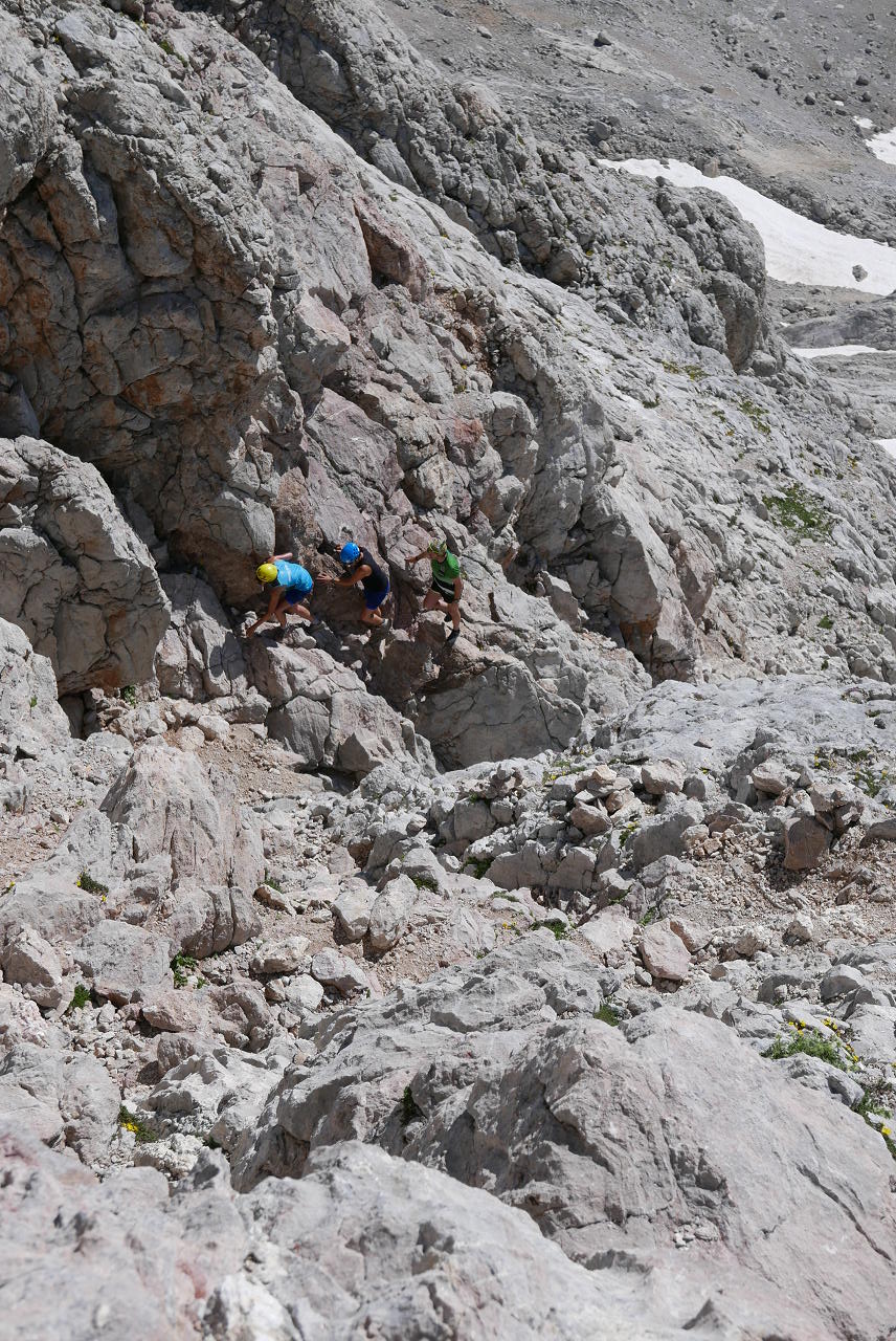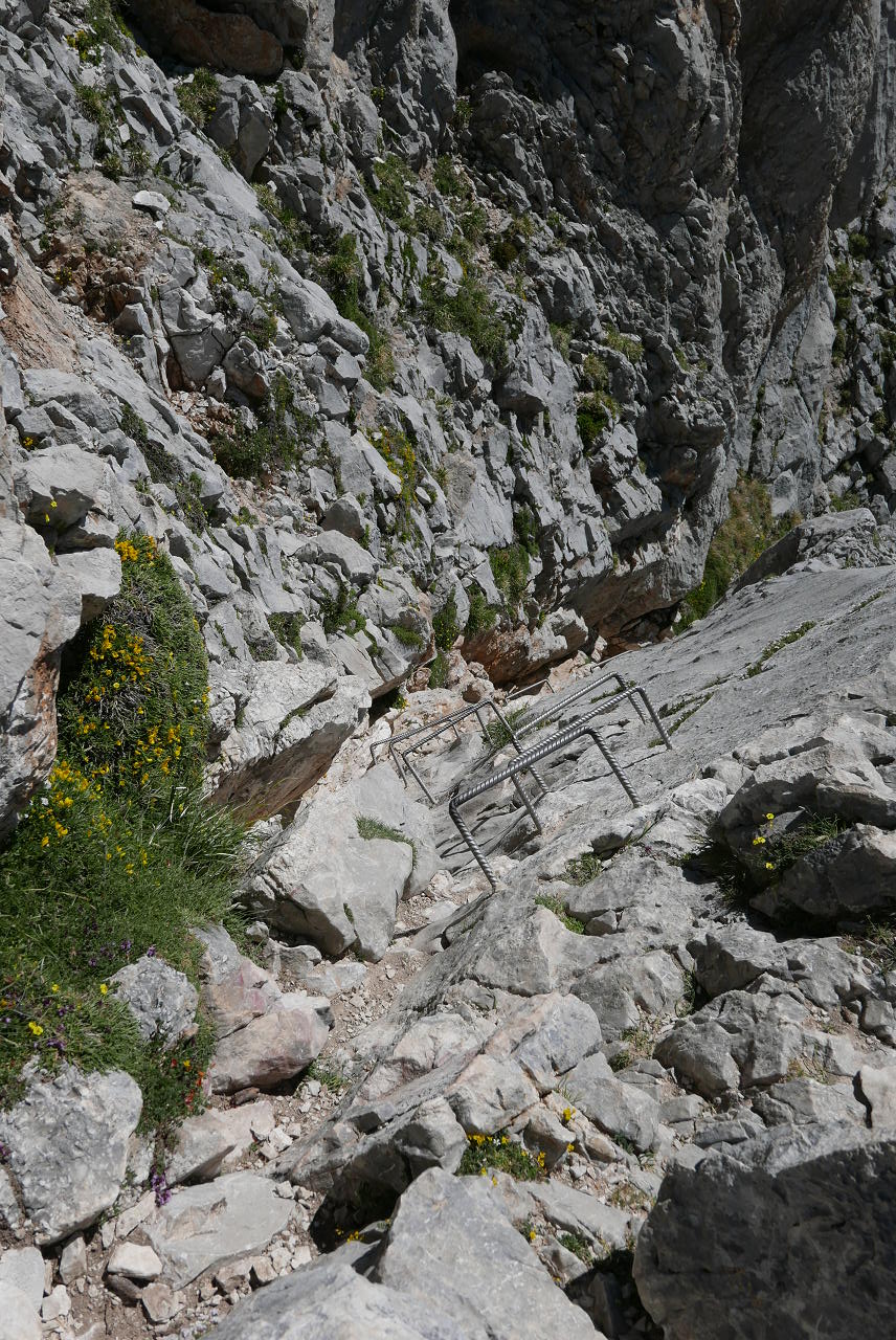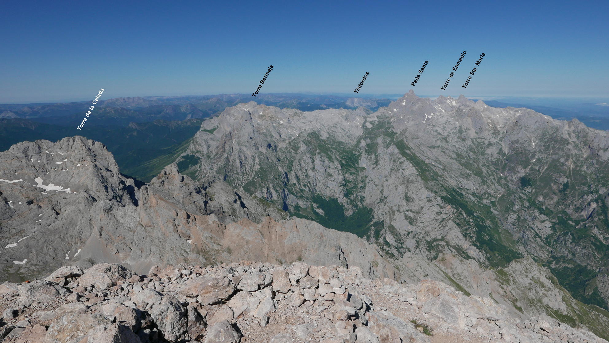 Se pasa bajo la Torre Labrouche, pasos por roca y trepadas y destrepes fáciles. Entro en una canal de piedrilla pelada y muy pendiente, bastante incómoda (muy resbalosa a la bajada). Al terminar está parte es mejor guardar los bastones ya que hay que trepar a la derecha una grieta. Después ya será todo trepada fácil en diagonal a la izquierda hasta salir a la cresta unos metros a la derecha de la cima. Lo más importante es no perder los hitos. Diría que el nivel de dificultad es IIº, quizá algún paso concreto II+, pero hay que tener en cuenta que es bastante expuesto, por lo que no se puede uno descuidar. Cima de Torrecerredo (2649m 4h29′).