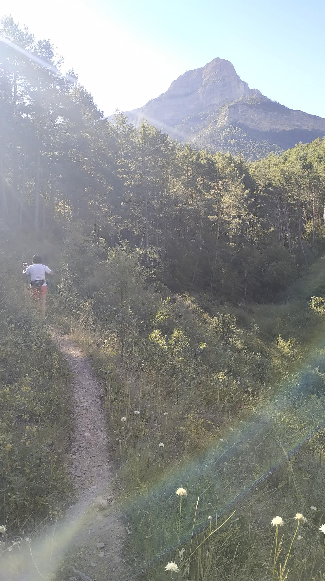 Después hay un desvío a la izquierda hacia el Polvorín (925m 0h26′), aunque no encontramos tampoco nada que nos recuerde a un polvorín, y empieza una senda sombría por pinar que desemboca en una pista (1090m1h24′) que se toma hacia la derecha, hasta un cruce de caminos (1090m 1h29′) donde seguimos recto. Justo a nuestra derecha está la carretera de acceso al Parador de Oroel, pero nosotros hemos evitado en todo momento andar por carretera.