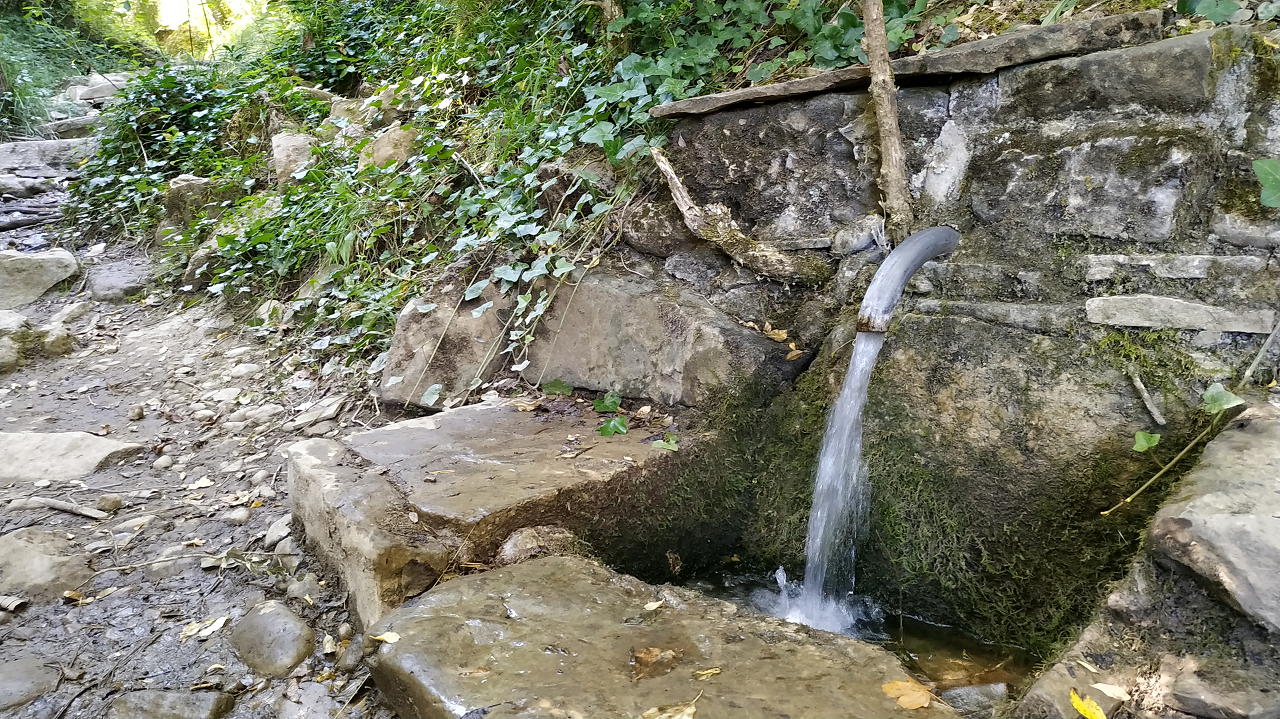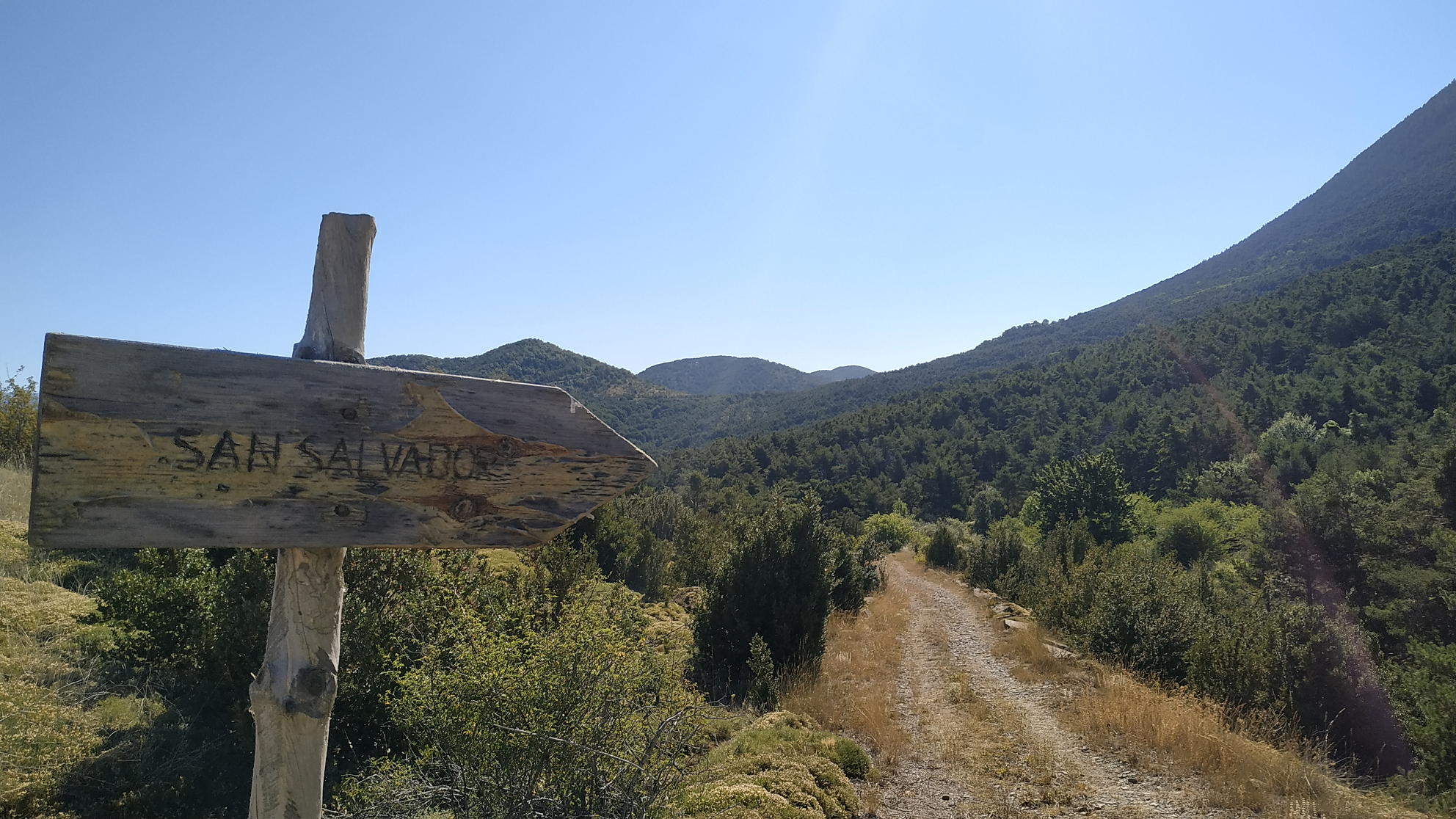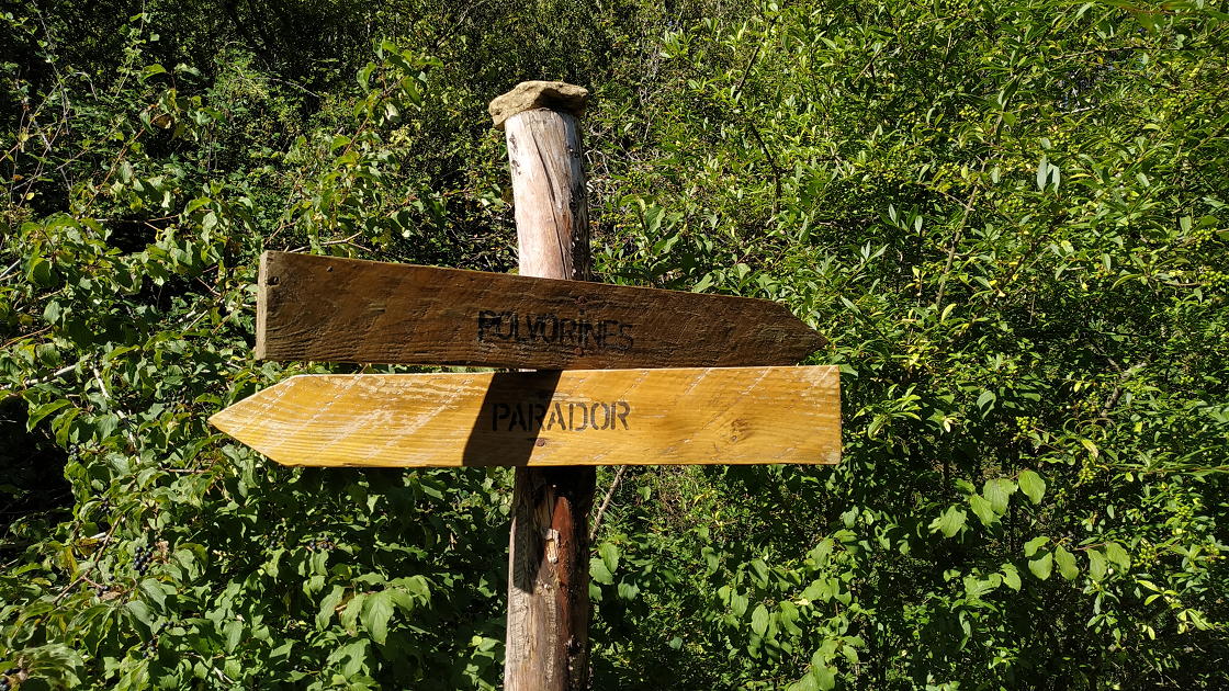 Comienza el descenso por una senda bajo los pinos hasta conectar con la senda que viene del parador en el punto donde está la ermita de San Salvador (1000m 1h42′) y, seguidamente, la fuente de San Salvador. Este tramo es muy agradable, pero más abajo ya vuelve a ser pista y terreno abierto, llegando al punto de conexión (830m 2h23′) con la parte asfaltada por donde habíamos subido. Desde ahí repetimos la ruta de subida hacia el aparcamiento (800m 2h38′)