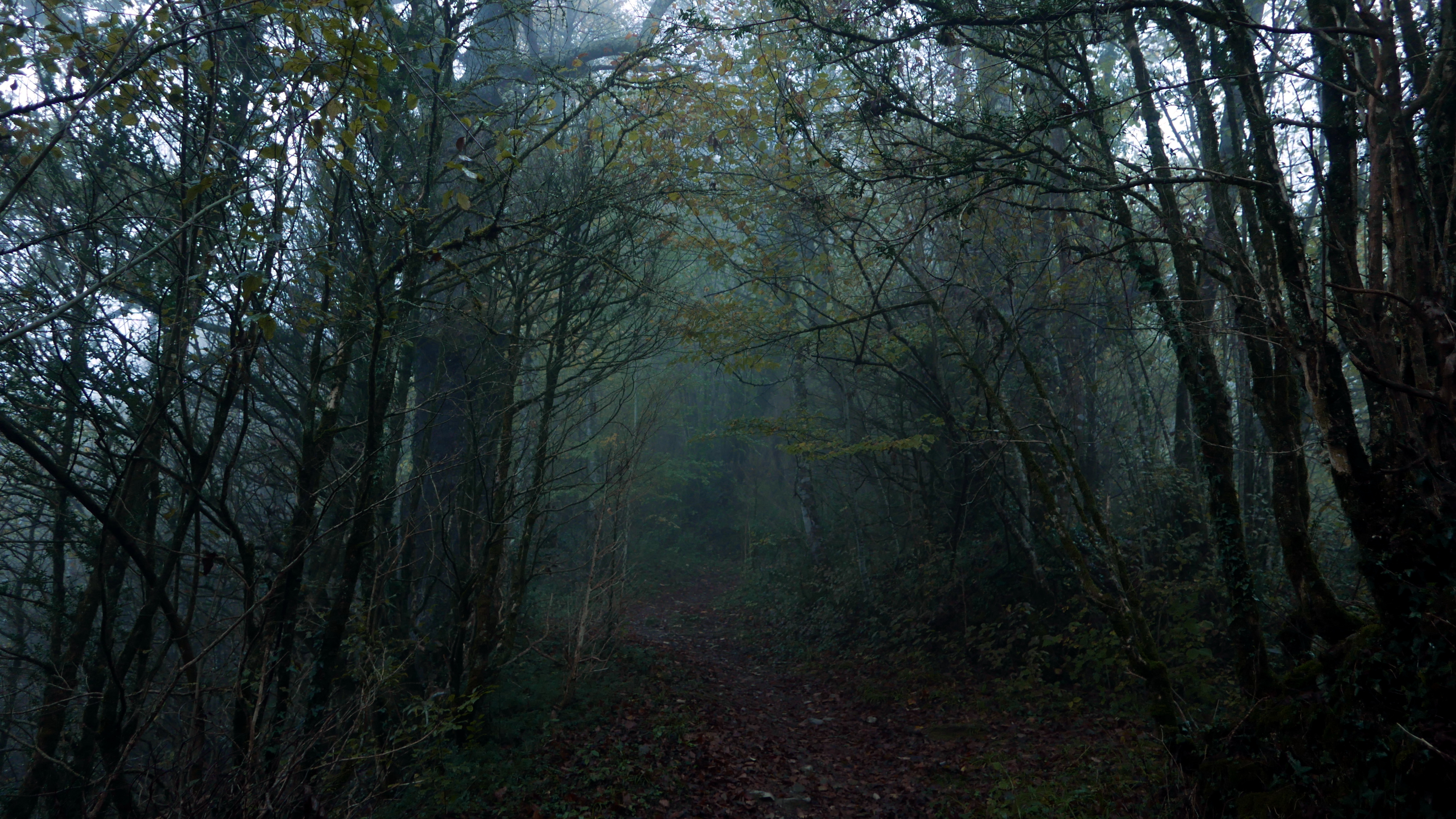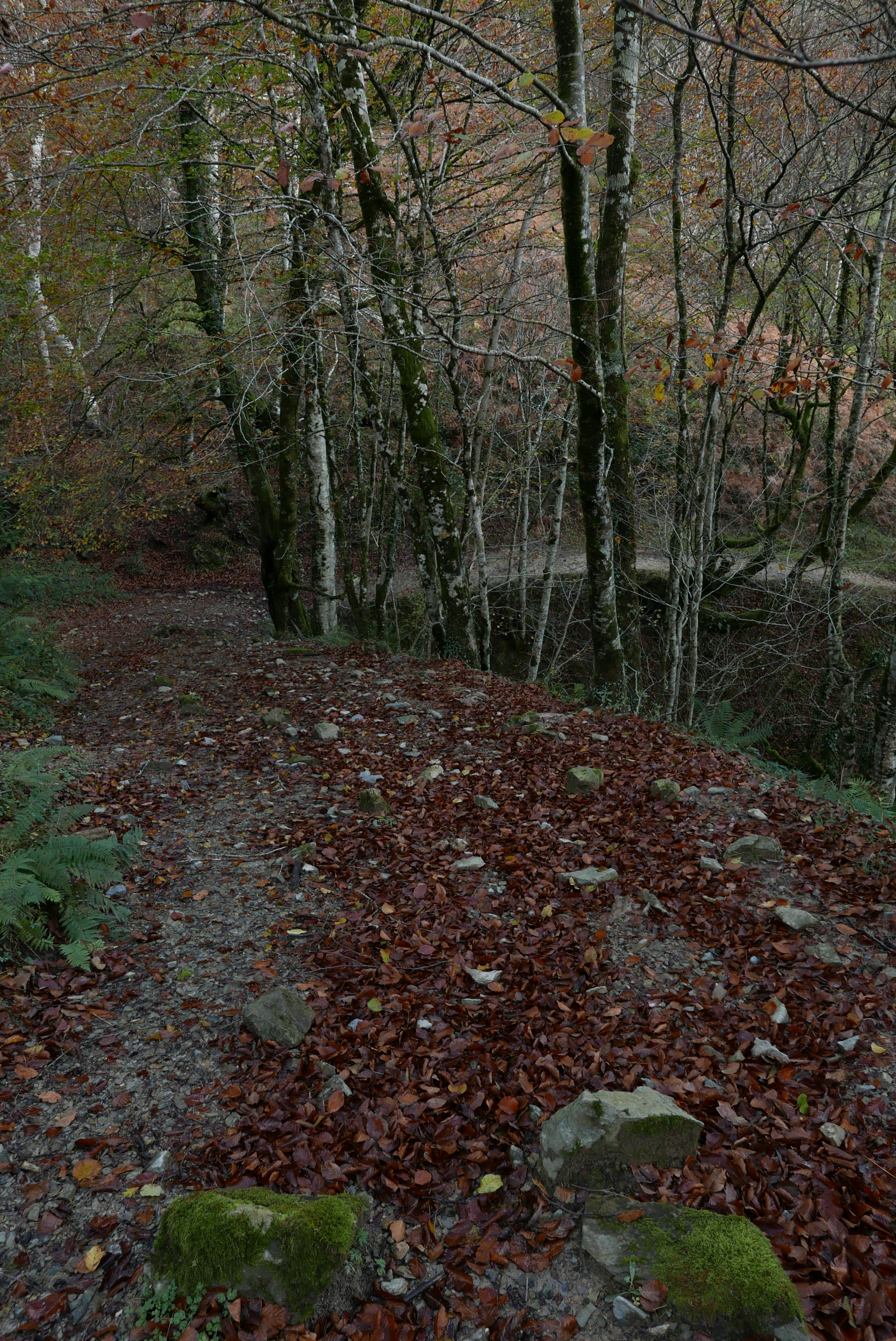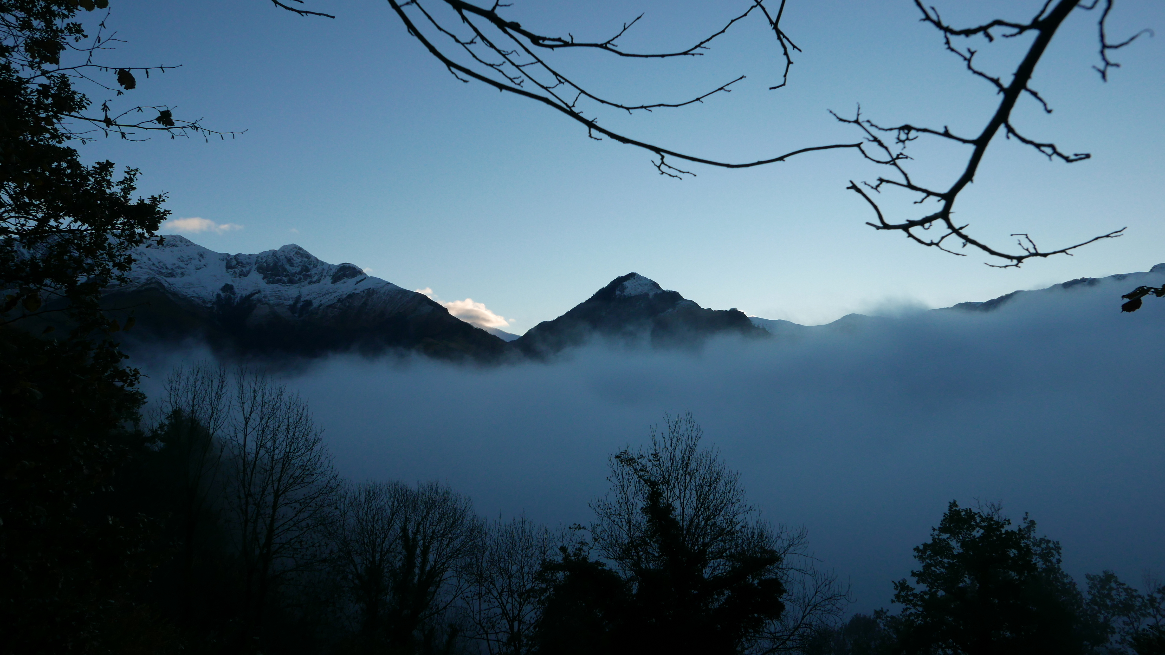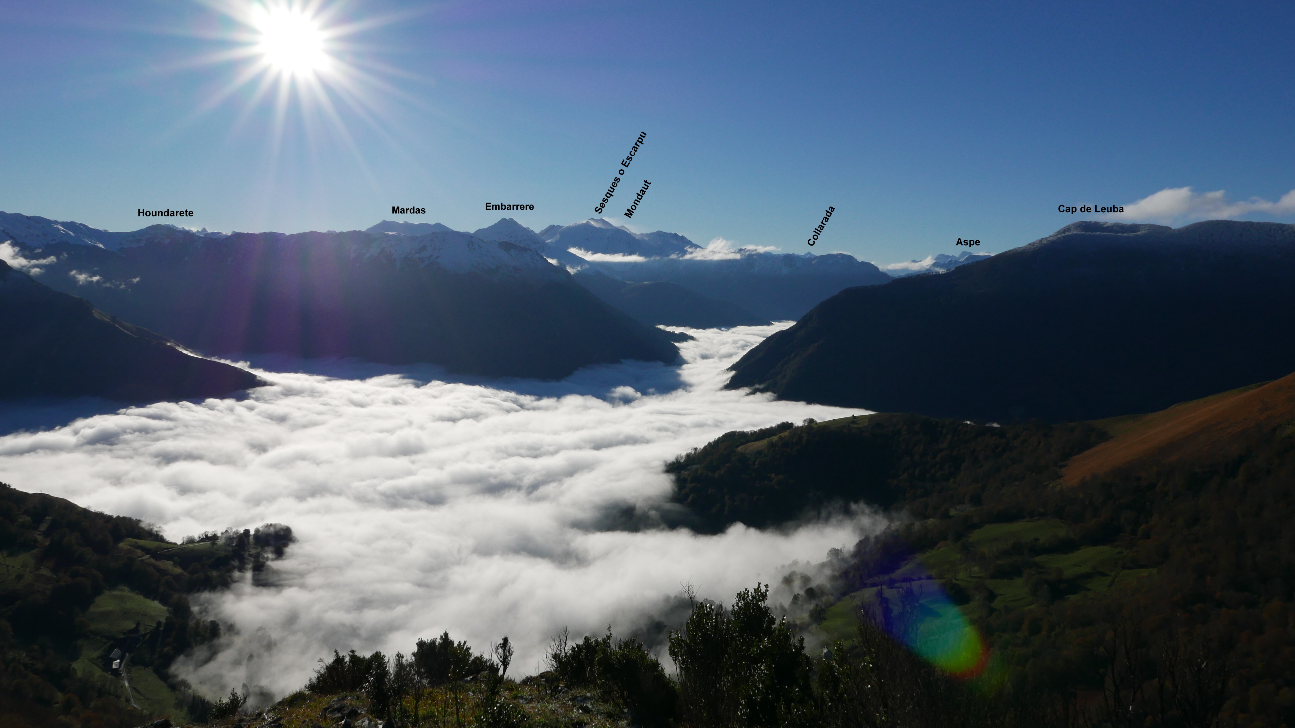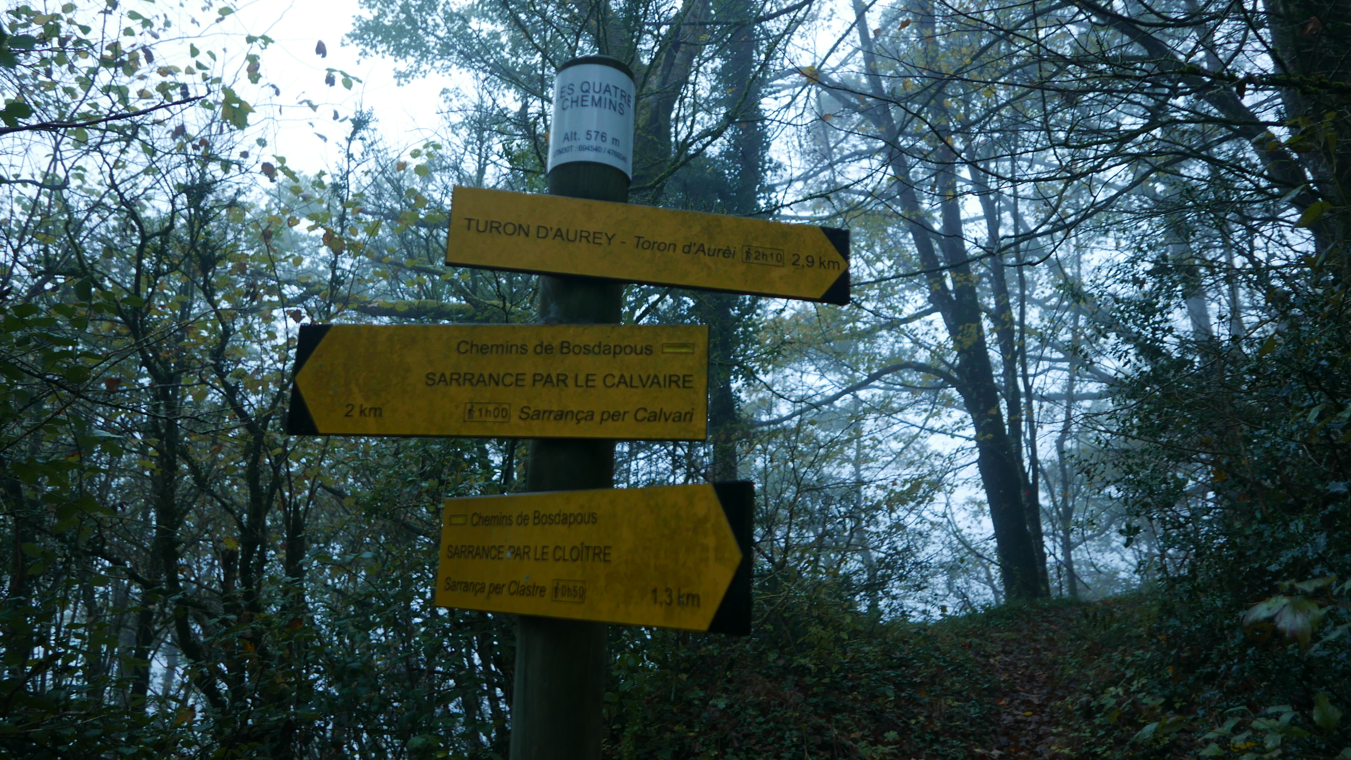 Descripción de la ruta: Sarrance (350m). Sobrepaso la iglesia y dejo el frontón a la izquierda. Sale un camino por una esquina a la derecha con un cartel indicador. Es un camino empedrado, algo resbaladizo, que sube por bosque en zigzags y con buena pendiente. De momento las nieblas cubren el valle. Cruzo una pista (540m 0h23′). Más arriba está la bifurcación Les quatre chemins (576m 0h31′) (a la izquierda sigue otro camino para bajar a Sarrance en un circuito, sigo a la derecha hacia arriba).
