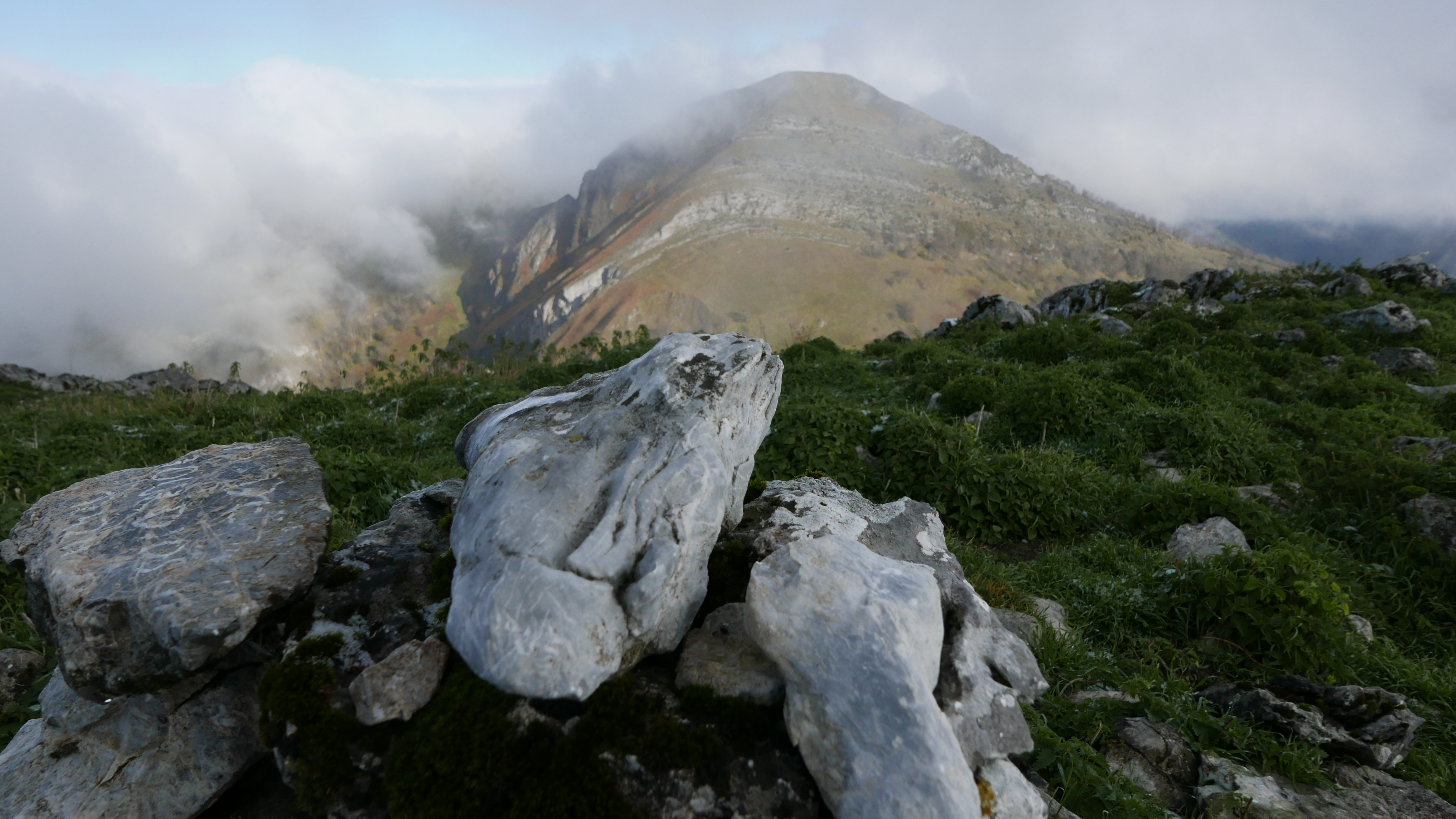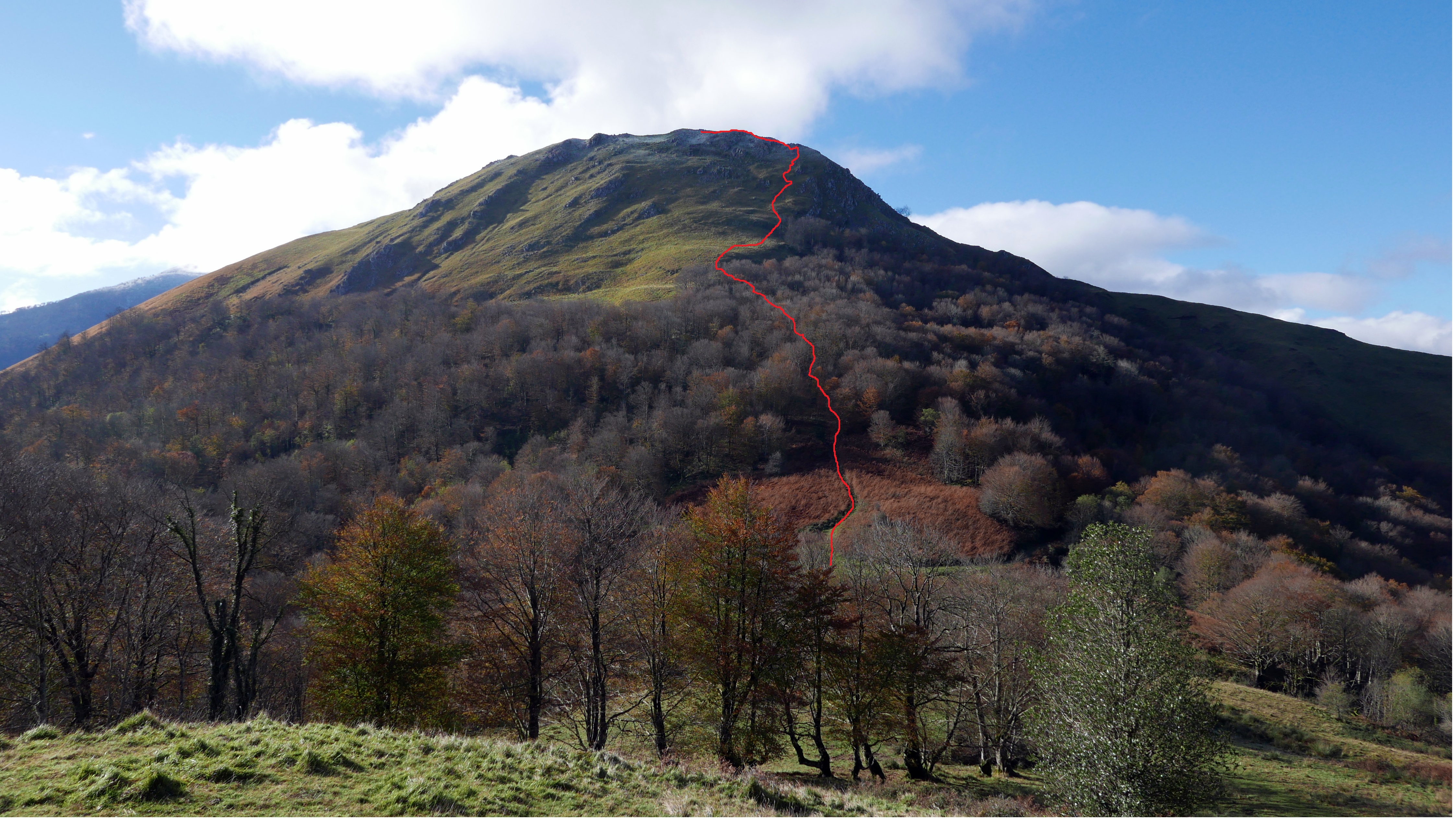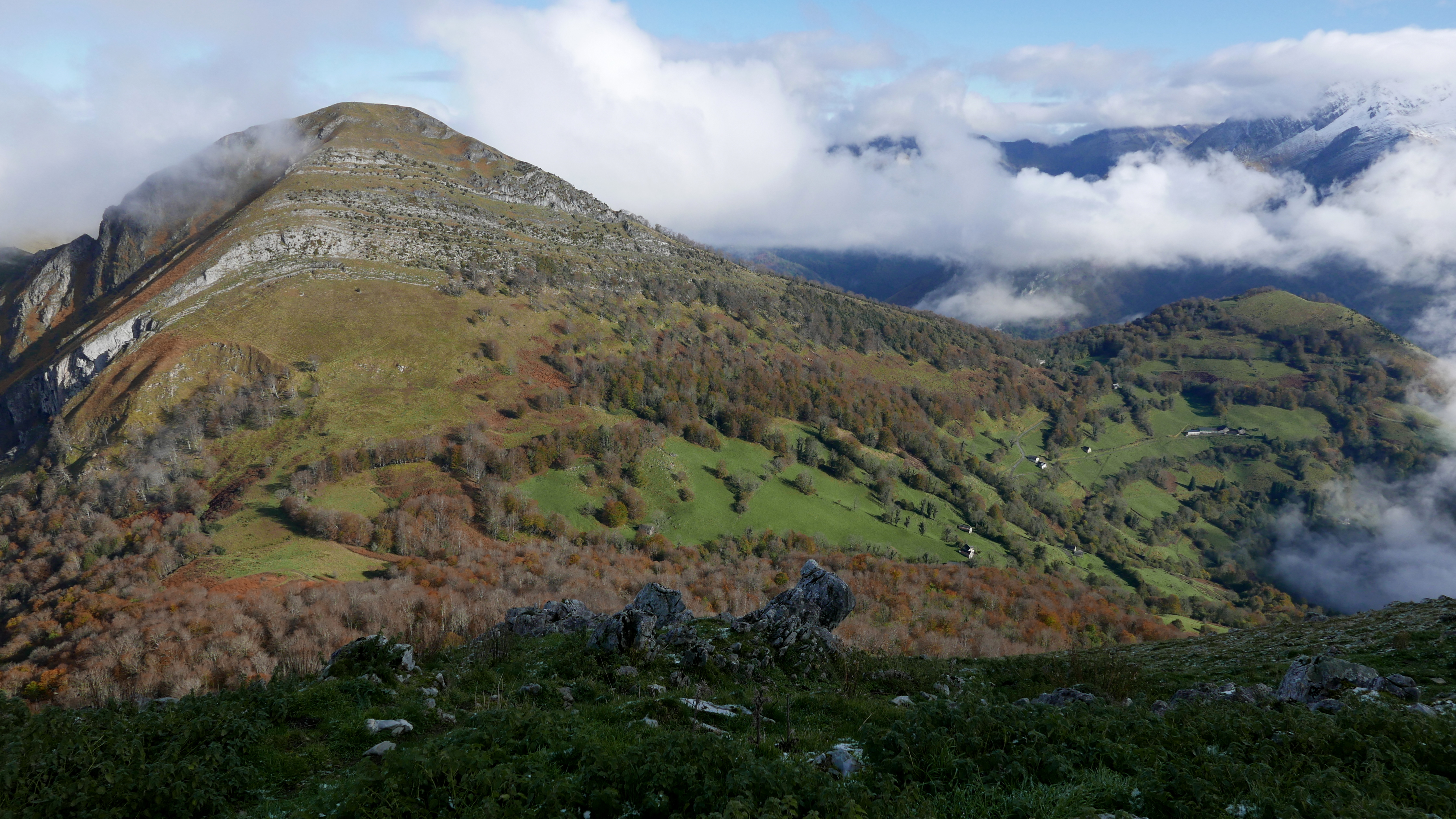 Una pista cruza el collado y sigo recto por un paso entre los helechos secos. Se entra en un bosquecillo confuso, a mi izquierda hay una valla de espino y, cuando el bosque se cierra, salgo hacia la izquierda subiendo a un lomo herboso. Subo la fuerte pendiente hacia el SW, encuentro hitos (1110m 2h54′) pero las sendas no son nada claras, probablemente de ganado. Al final hay una zona más rocosa y, siempre bastante empinado pero sin dificultad, se llega a la cima del Saraillé (1242m 3h10′). No me entretengo, las nieblas suben y se forman nubes también.