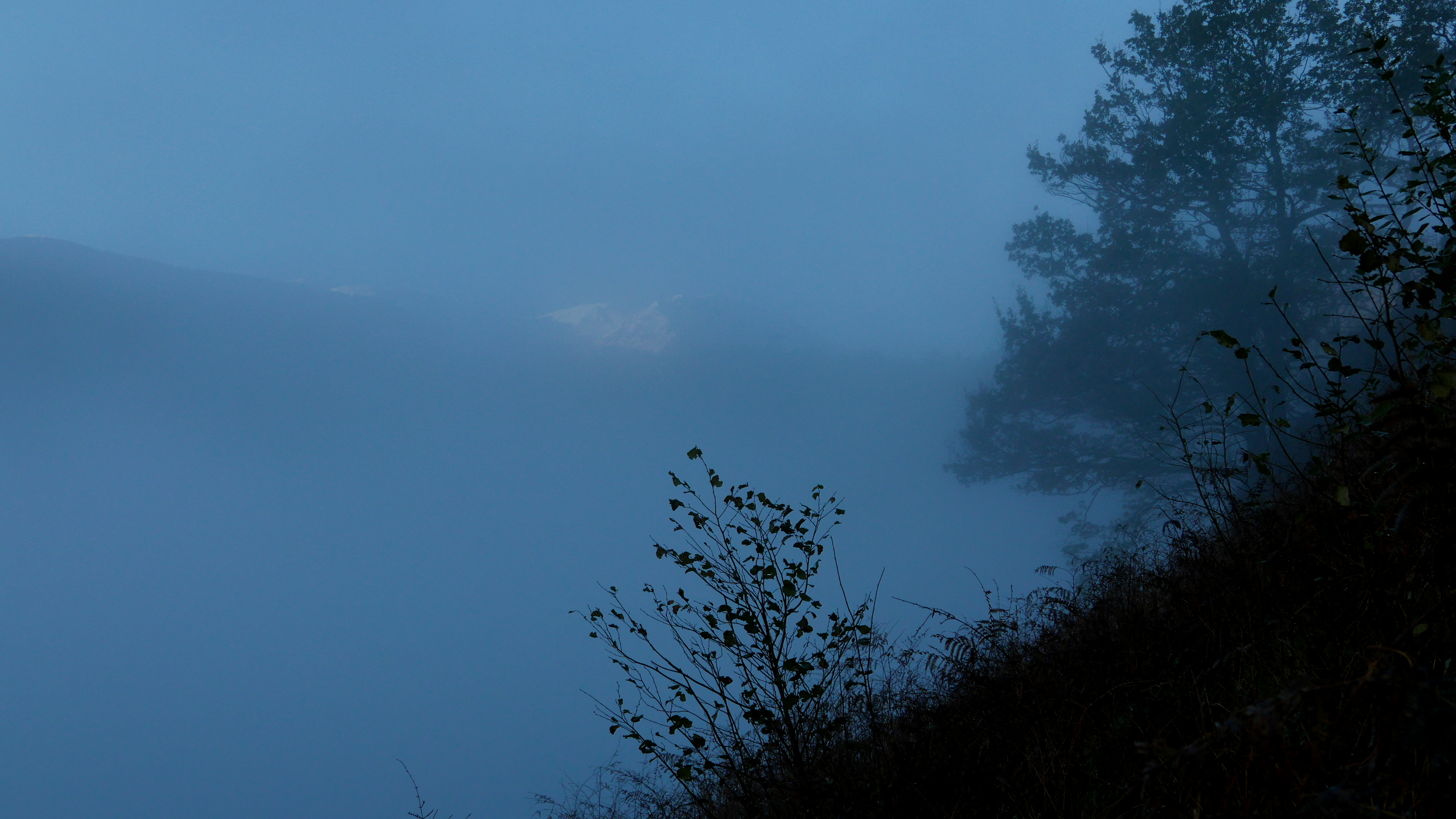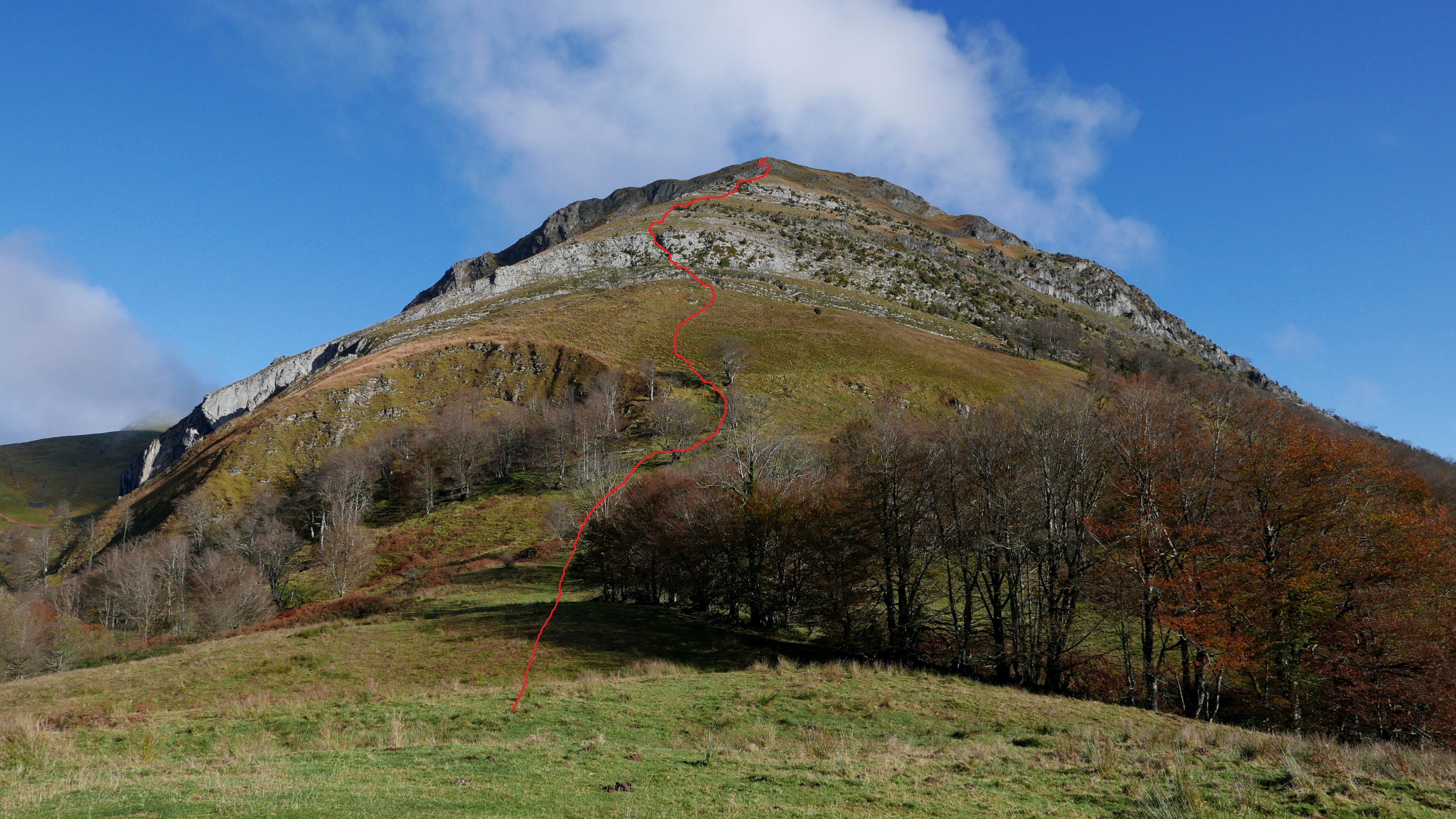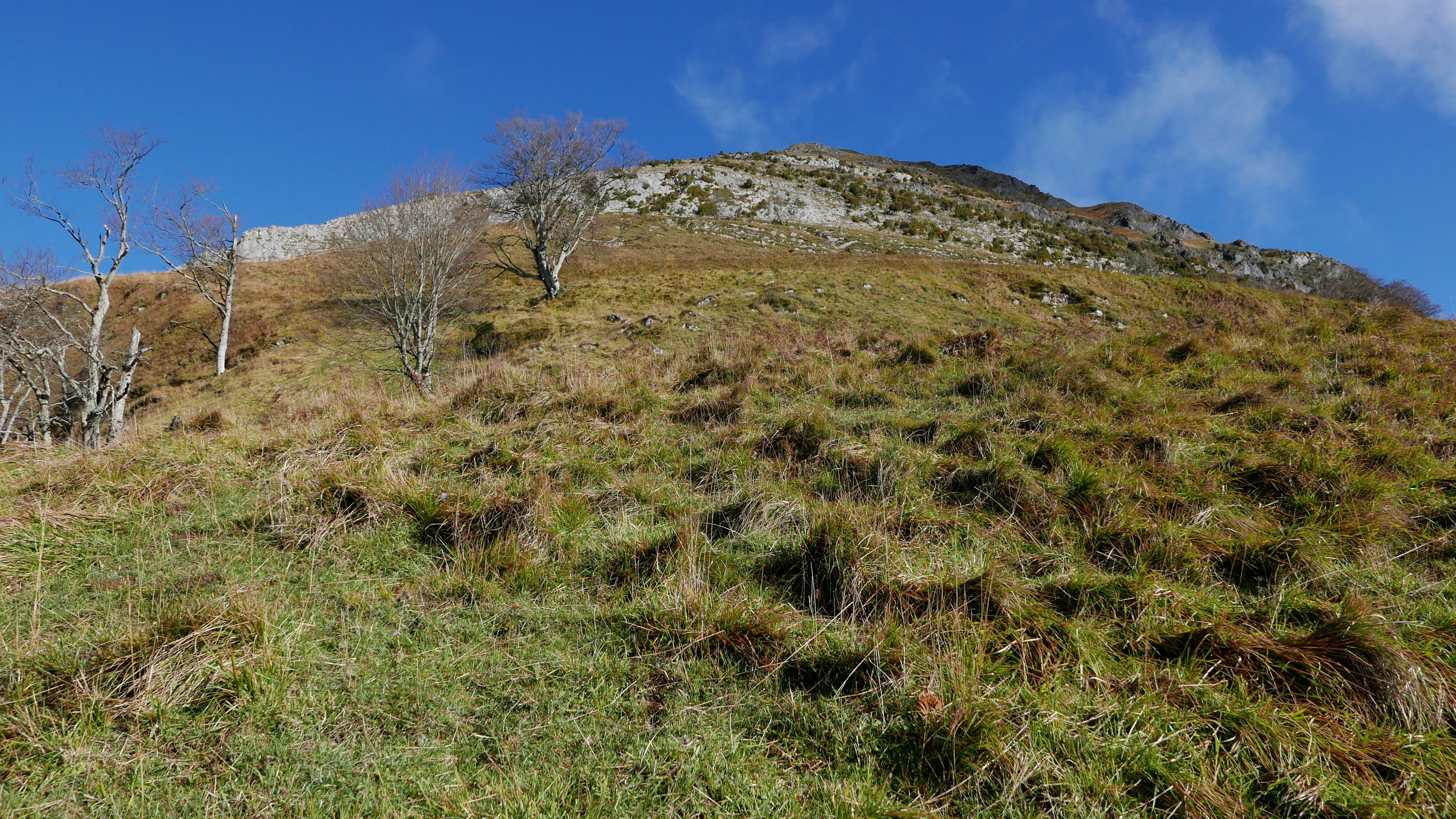 Una pista cruza el collado y sigo recto por un paso entre los helechos secos. Se entra en un bosquecillo confuso, a mi izquierda hay una valla de espino y, cuando el bosque se cierra, salgo hacia la izquierda subiendo a un lomo herboso. Subo la fuerte pendiente hacia el SW, encuentro hitos (1110m 2h54′) pero las sendas no son nada claras, probablemente de ganado. Al final hay una zona más rocosa y, siempre bastante empinado pero sin dificultad, se llega a la cima del Saraillé (1242m 3h10′). No me entretengo, las nieblas suben y se forman nubes también.