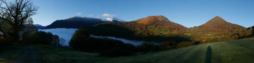 Paso junto a un abrevadero (680m 0h39′) y desemboco en una pista (745m 0h49′) que está asfaltada y que sigo hacia la izquierda (ojo en la bajada para dejar la pista y tomar el camino, hay un poste con una chapa amarilla). Numerosas granjas en el valle que tengo enfrente, bajo las prominentes cumbres del Trône du Roi, a la derecha, y el Saraillé, a la izquierda, que ya puedo ver porque estoy saliendo por encima de la niebla.