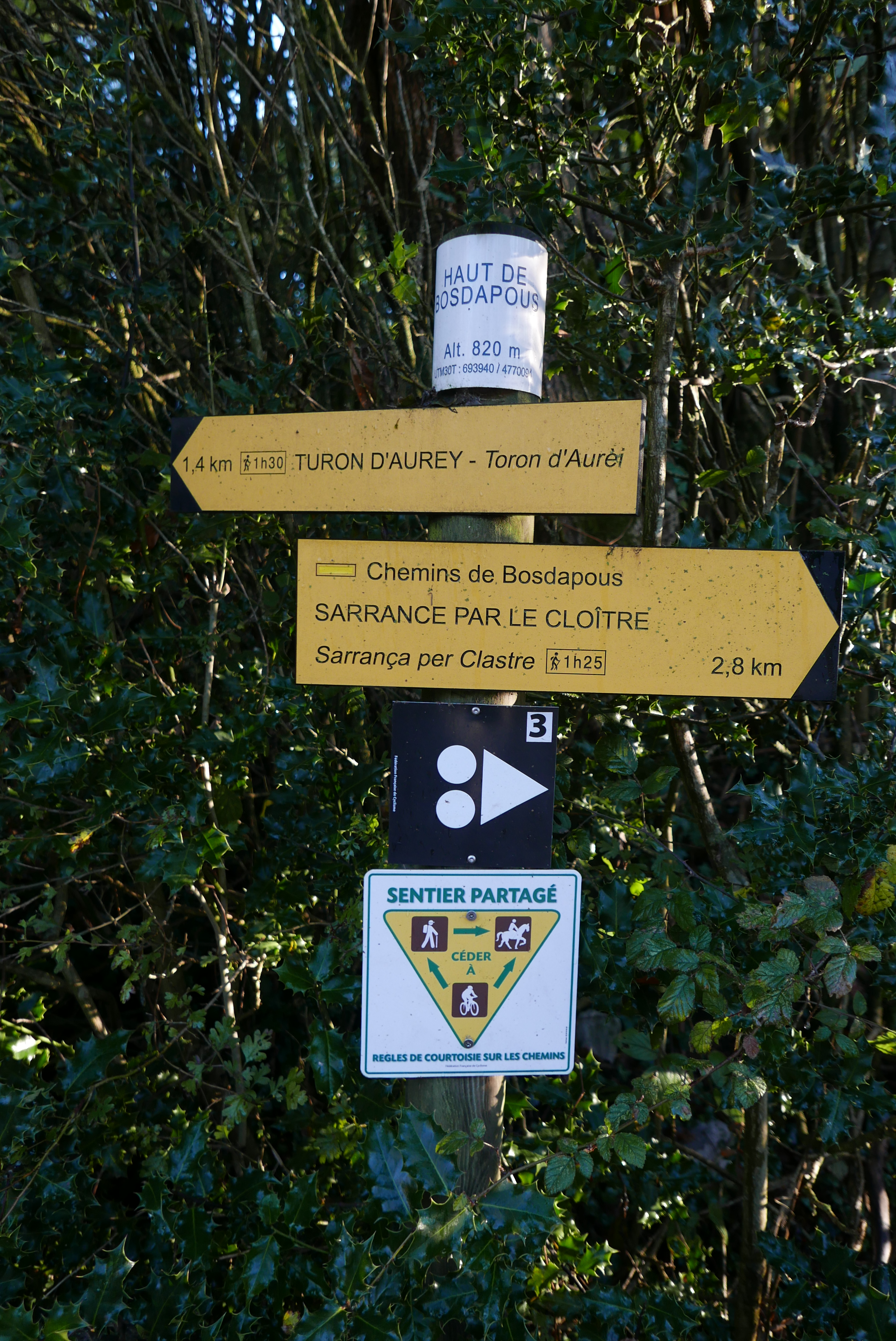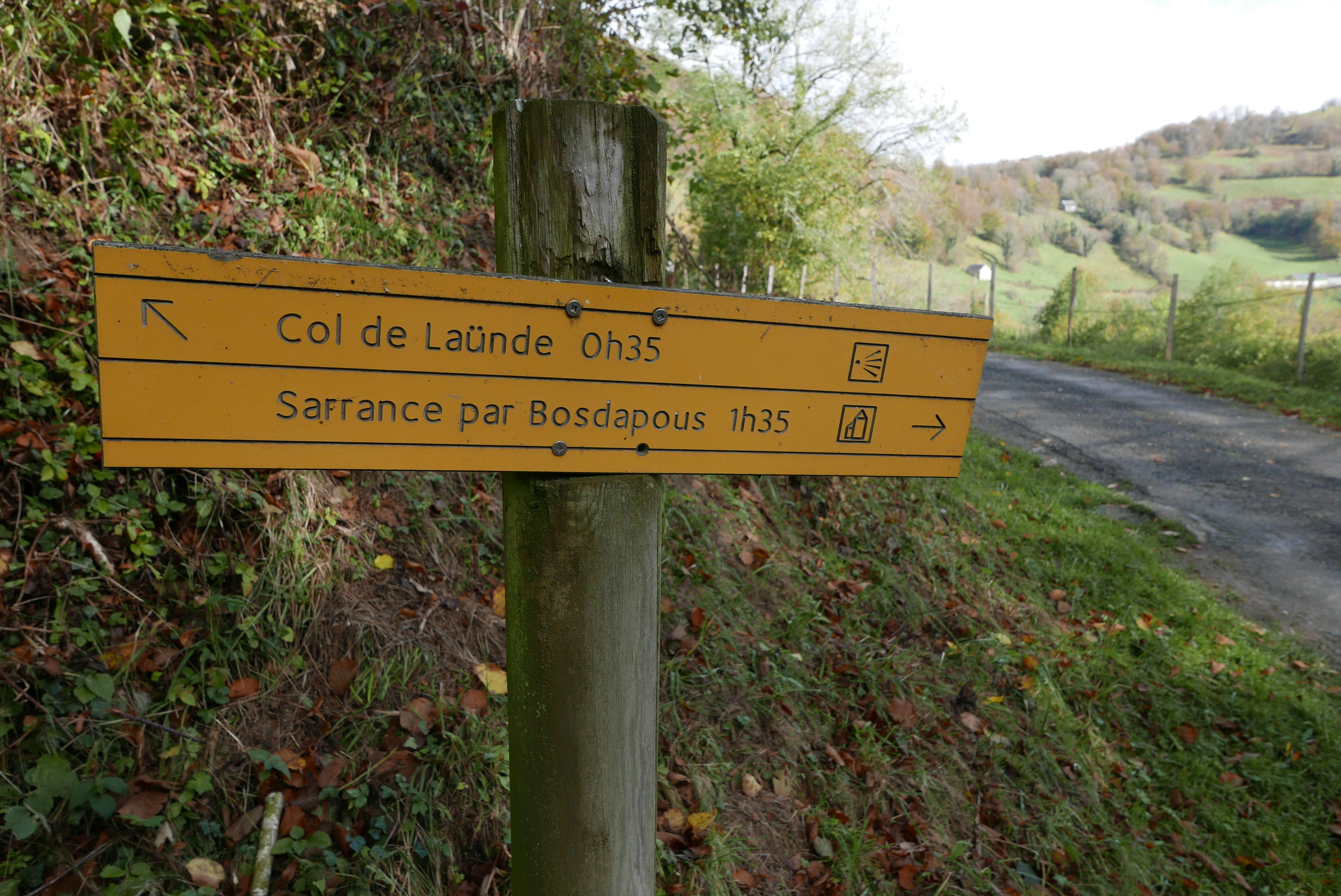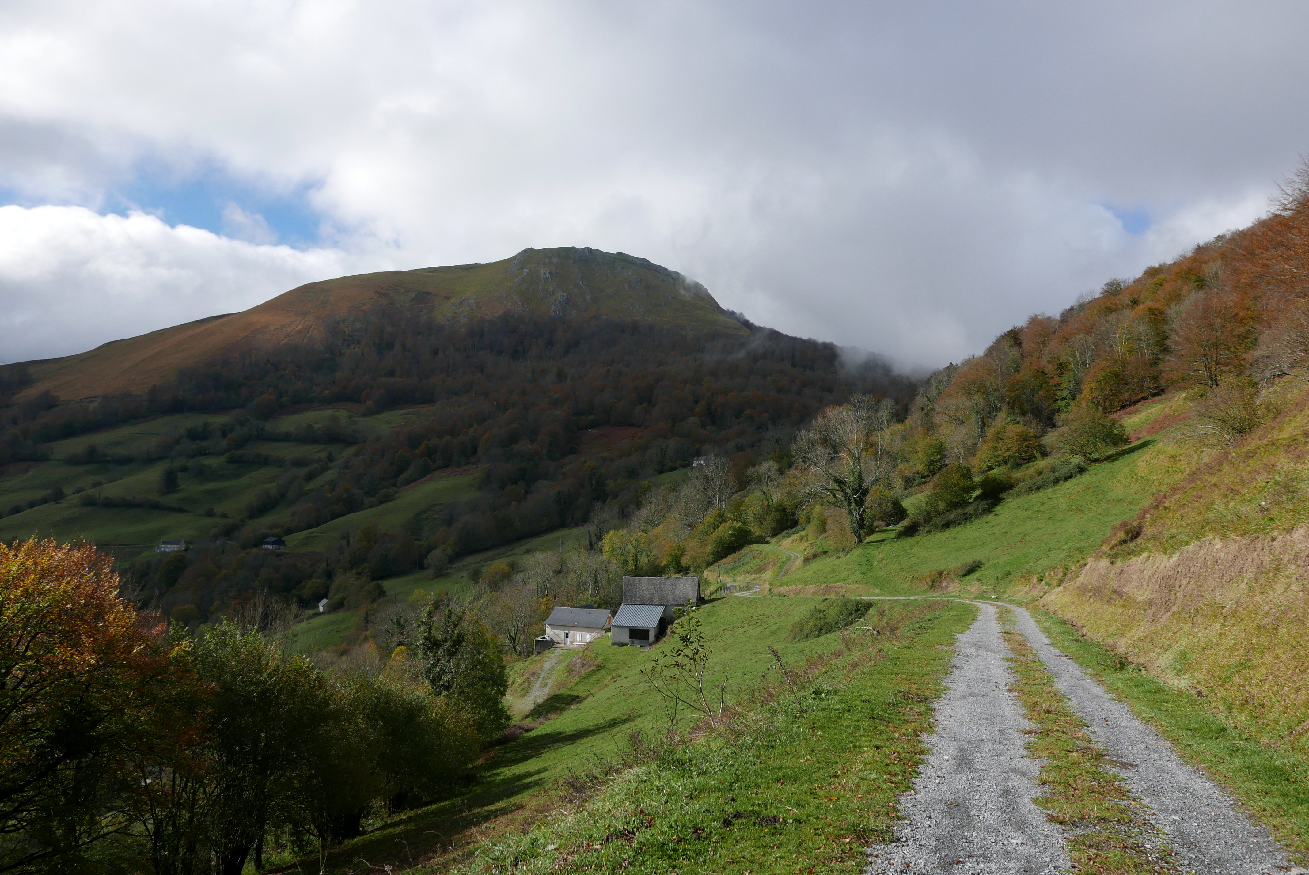 Desciendo un poco más directo al col de Launde (959m 3h41′) y no tomo la pista a la derecha, sino que bajo sin senda, por prados, ligeramente a la derecha, encontrando enseguida un camino al llegar al ruisseau de Bosdapous. Una bonita senda avanza entre el bosque con el arroyo a la derecha. Llego a las primeras casas (830m 3h55′) y sigo bajando hasta la pista asfaltada (770m 3h59′). Sigo la pista, siempre por el ramal de la izquierda (a la derecha salen ramales que van a granjas) y en ligero ascenso, hasta una bifurcación que tomo a la derecha (825m 4h12′) que conecta con el punto donde dejé la pista a la subida (Haut de Bosdapous). Continúo el descenso por la pista hasta el punto donde hay que dejarla (740m 4h22′) para tomar el camino señalizado en amarillo y que me lleva de nuevo a Sarrance (350m 4h54′)