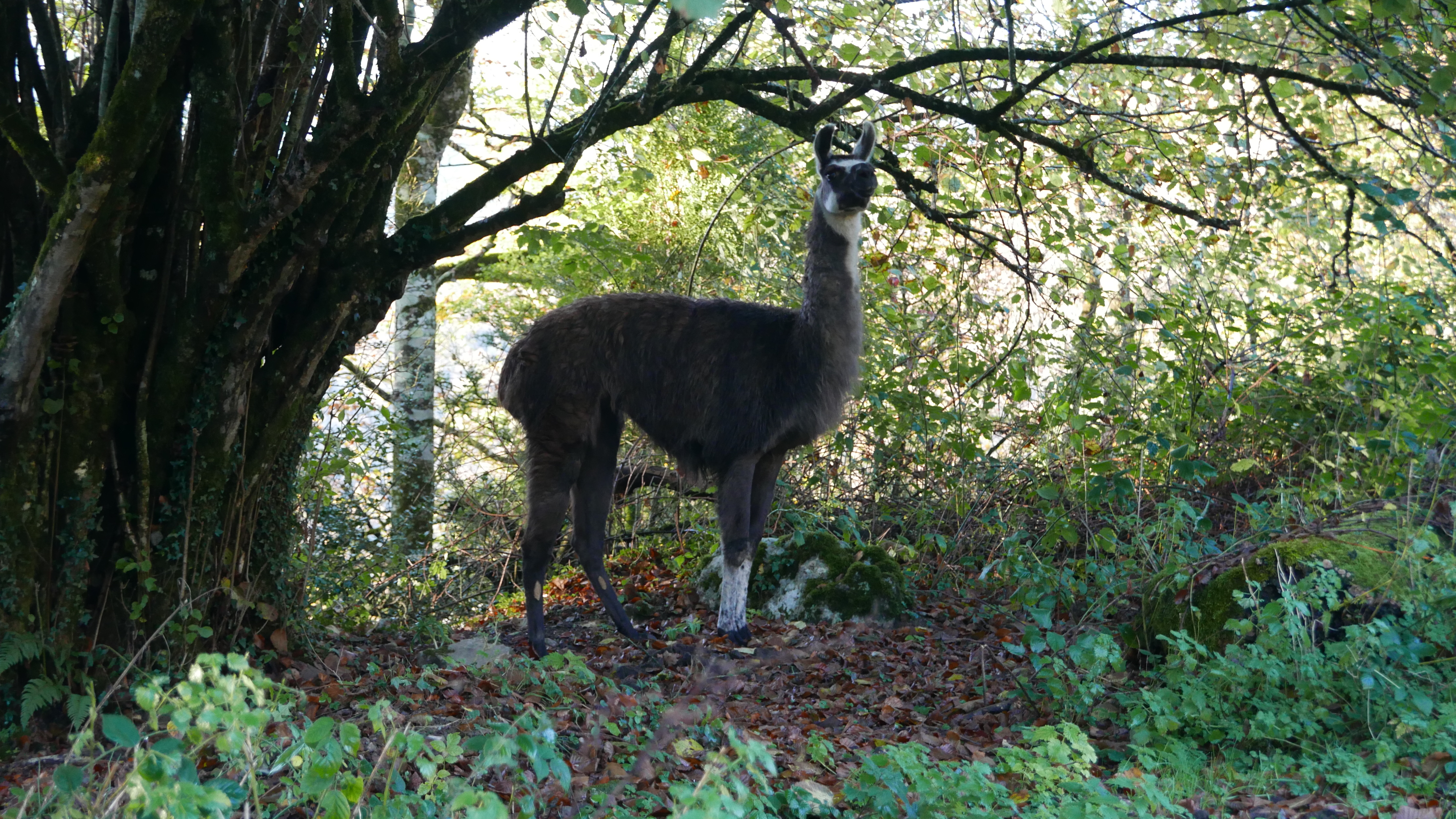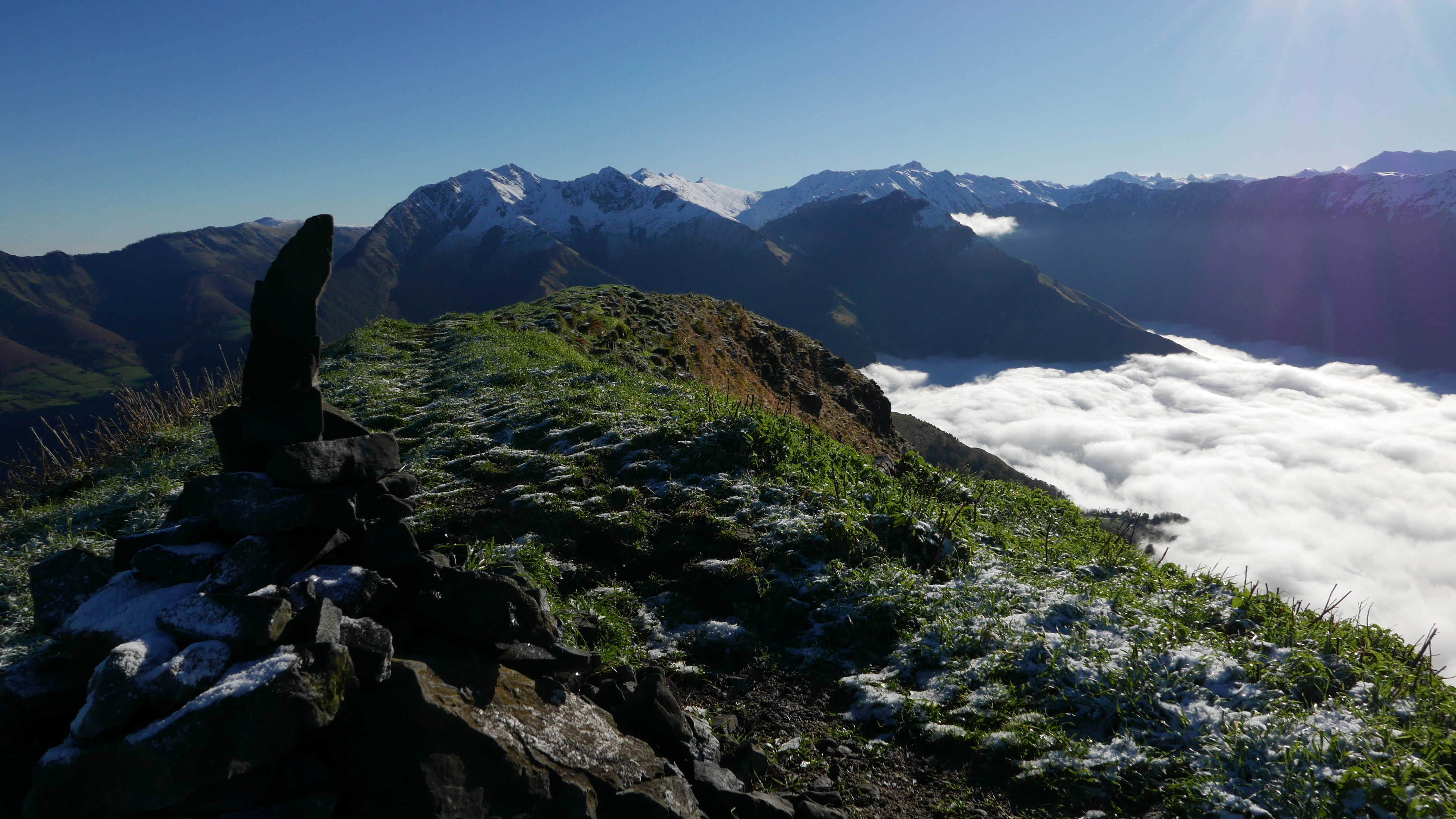 Tras este tramo de pista me desvío a la derecha en Haut de Bosdapous (820m 1h00′) dejando la pista por la que luego bajaré y tomando un camino que sube a un colladito. De repente entre los árboles surge un animal bastante grande que enseguida reconozco ¡una llama!, y luego en un rellano me encuentro un rebaño de otras 6 llamas, supongo que serán de alguna granja que explota la lana. El colladito es el Haut de Pelu (843m 1h07′), hasta donde pueden llegar coches. A la izquierda sale una sendita que sube por la cresta SW del Trône du Roi, con fuerte pendiente pero fácil, hasta la cima (Trône du Roi 1266m 1h54′). Preciosas vistas con el valle cubierto por el mar de nubes y las cimas iluminadas con la primera nevada de la temporada.