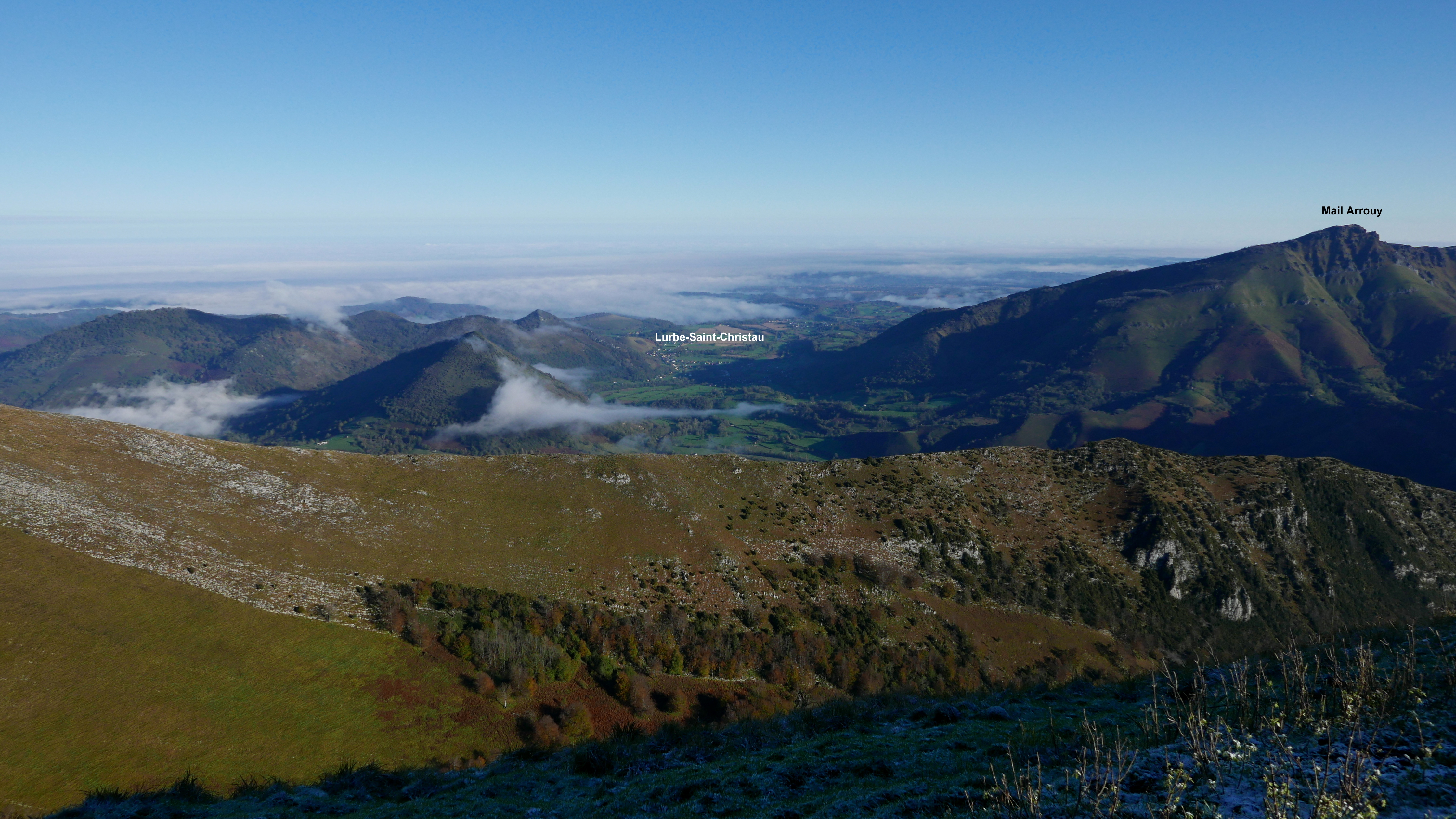 Hacia el norte ya se extienden los terrenos llanos donde se asienta Oloron-Ste-Marie, pero el Trône de Roi se alza altivo con laderas de potente verticalidad sobre valles de pastos ganaderos y bosques de hayas. La ruta desde Sarrance hasta el Trône du Roi está perfectamente señalizada. Desde aquí al Saraillé apenas encuentro algunos hitos. El descenso desde el col de Launde vuelve a ser fácil de seguir.