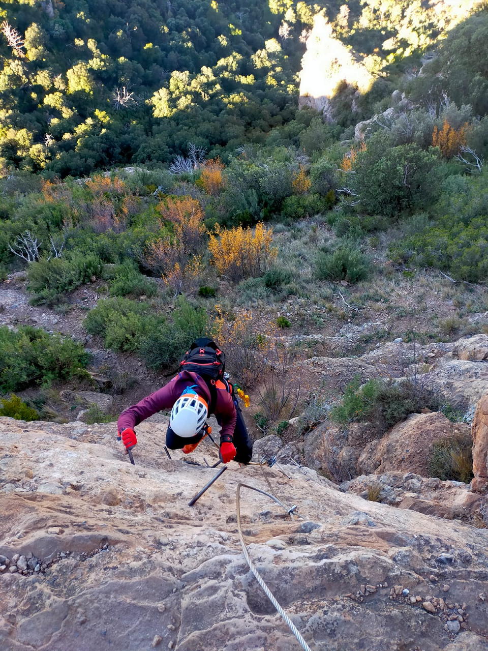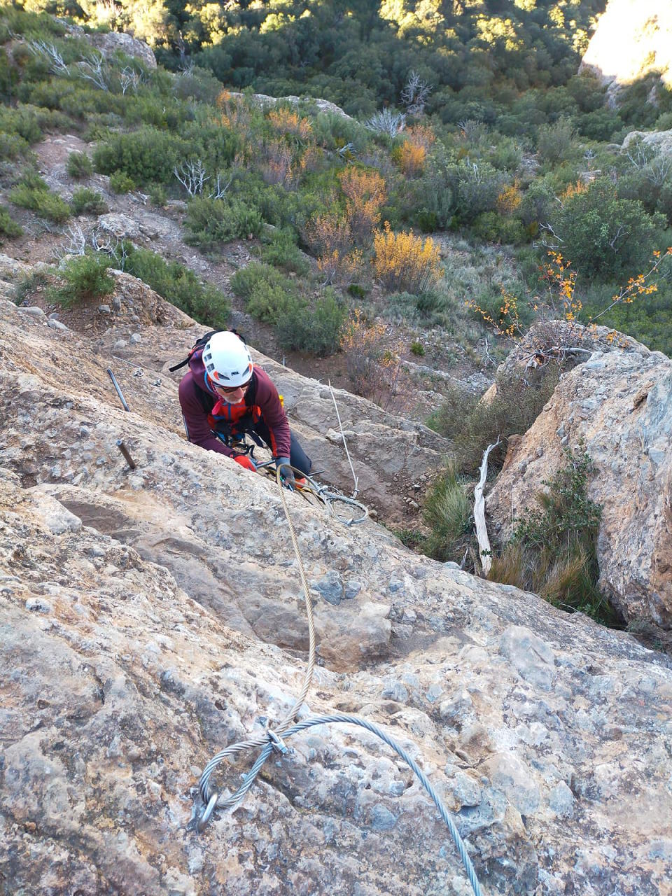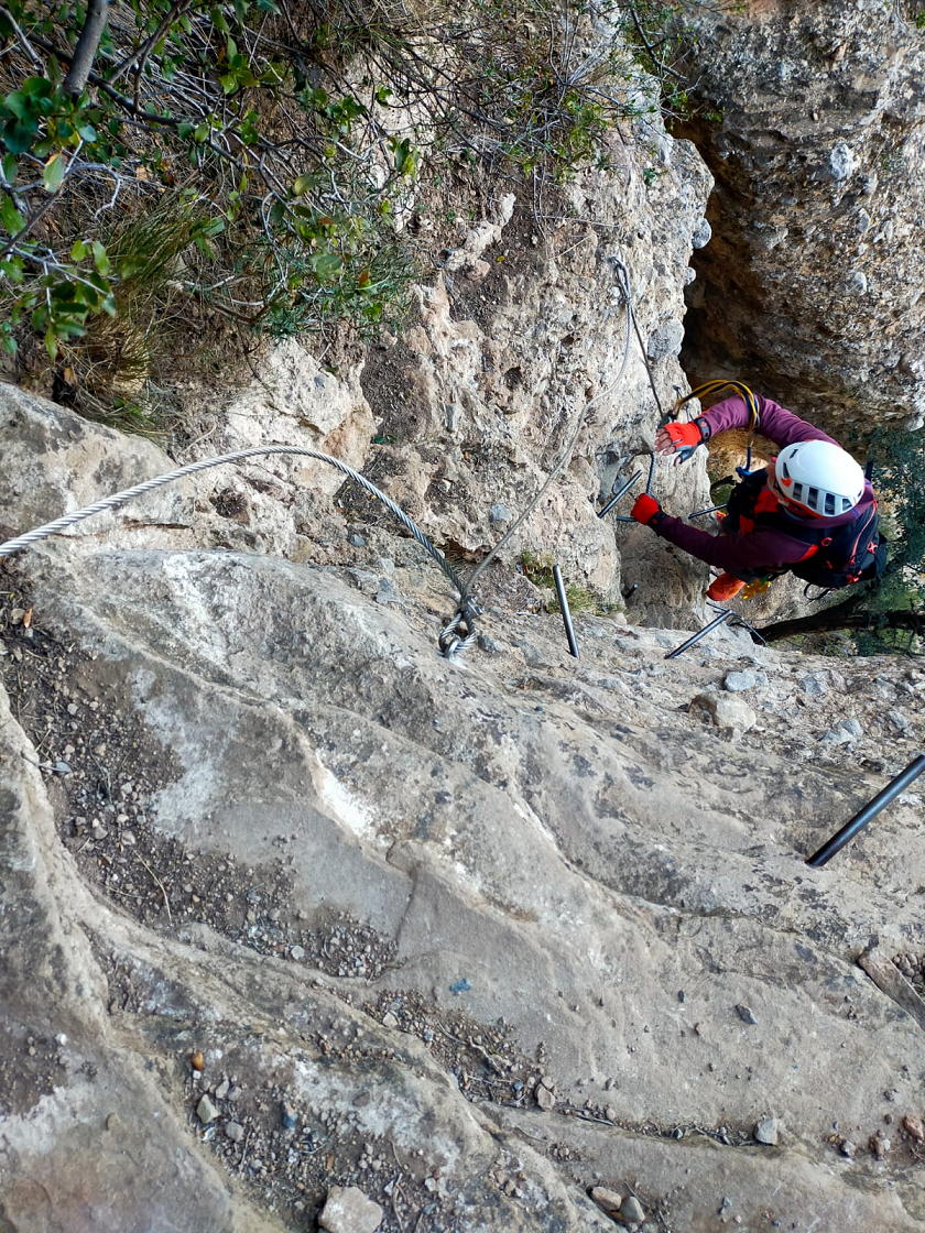 Hay un par de tramos verticales separados por una repisa de descanso, luego una estrecha canal muy encajonada. Se llega al punto mas alto, el Mirador de los Buitres (1040m 1h42′) tras un último paso casi extraplomado. Una pausa y seguimos a la izquierda (norte) hasta un espolón rocoso donde, a la derecha y con un cartel, sale una senda de descenso. Tiene mucha pendiente y vale la pena ayudarse con las ramas y troncos de los bojes y carrascas para no resbalar.