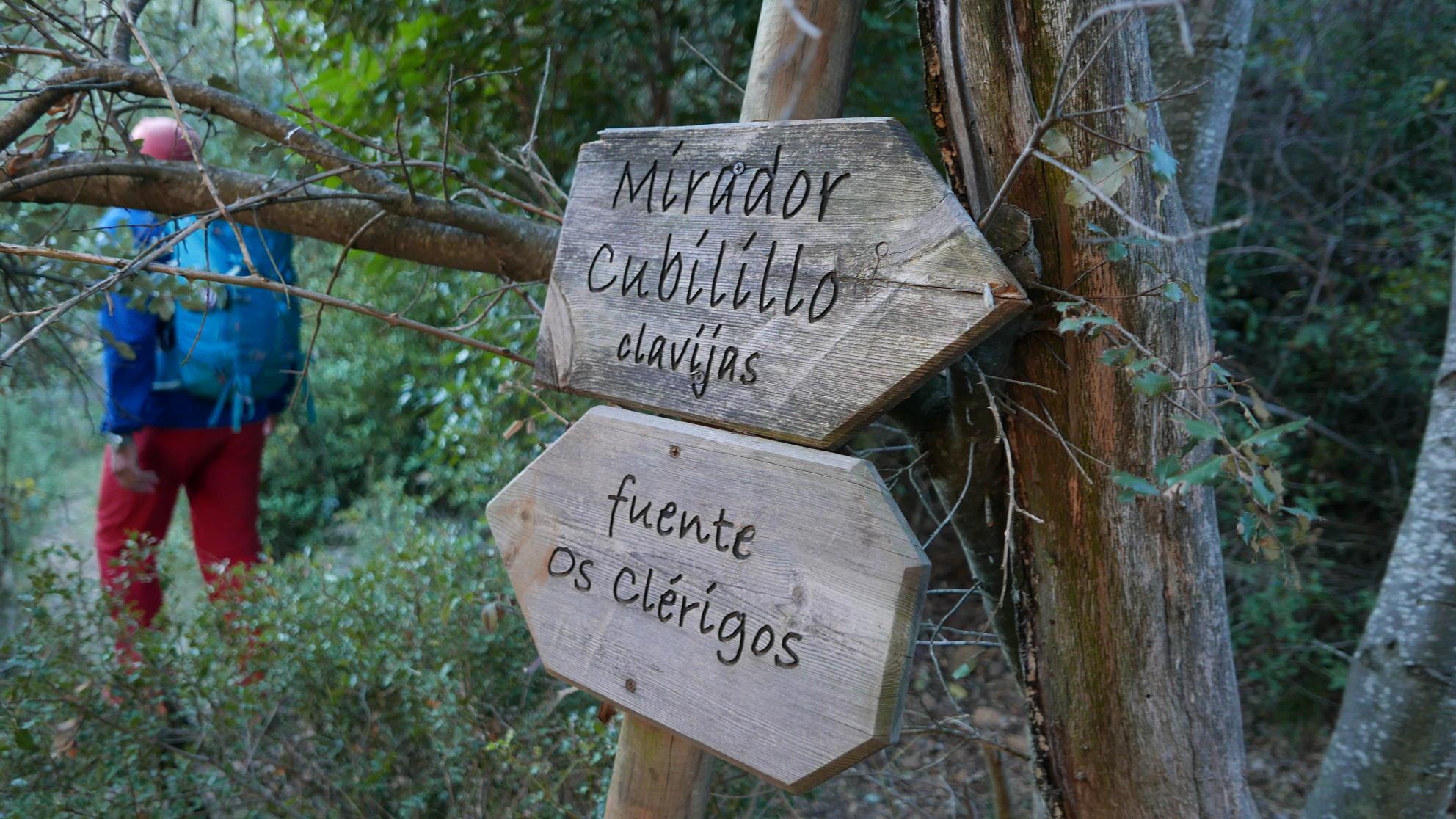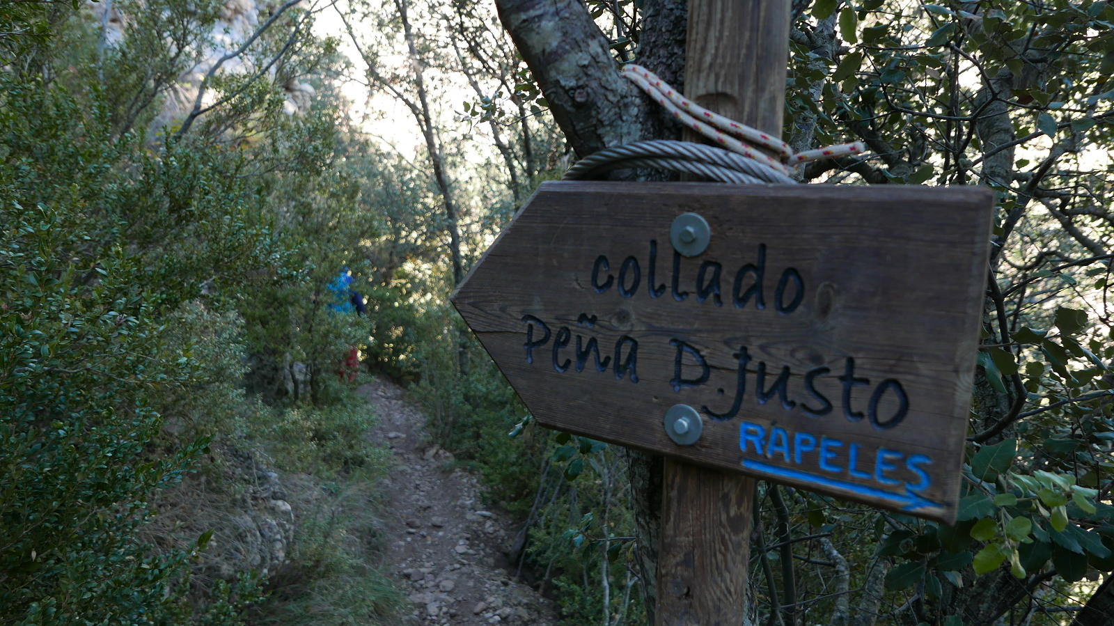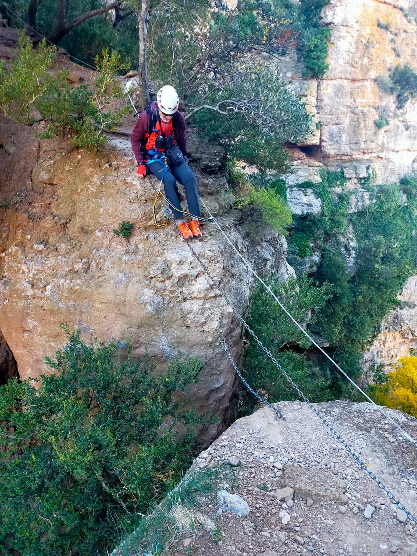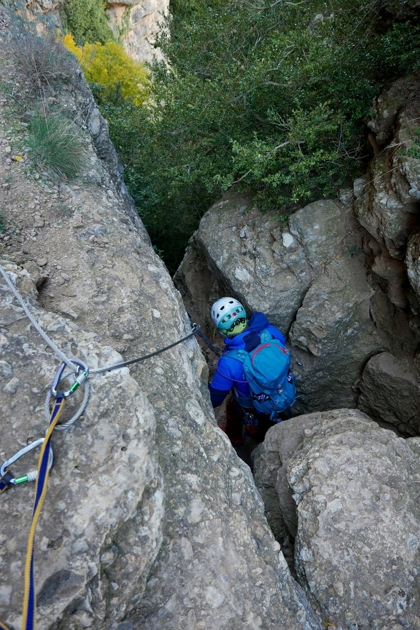 Hay un par de tramos verticales separados por una repisa de descanso, luego una estrecha canal muy encajonada. Se llega al punto mas alto, el Mirador de los Buitres (1040m 1h42′) tras un último paso casi extraplomado. Una pausa y seguimos a la izquierda (norte) hasta un espolón rocoso donde, a la derecha y con un cartel, sale una senda de descenso. Tiene mucha pendiente y vale la pena ayudarse con las ramas y troncos de los bojes y carrascas para no resbalar.