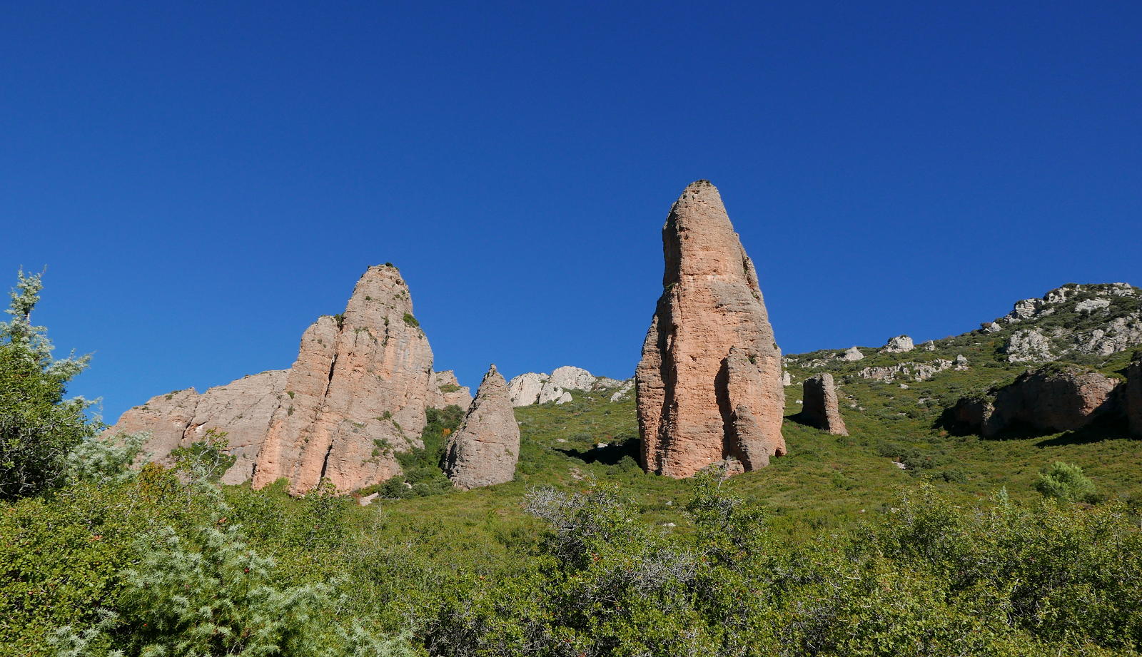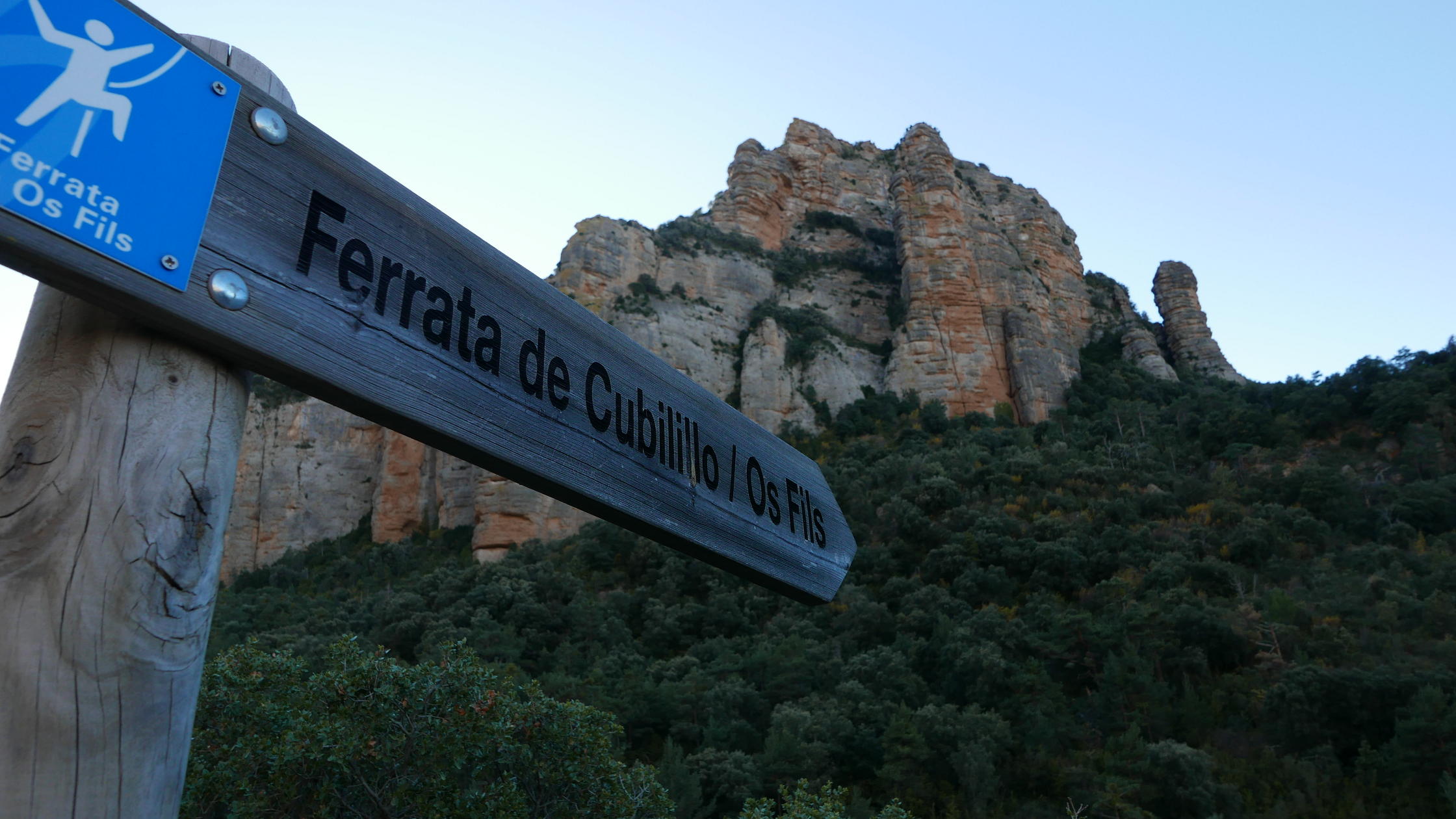 Descripción de la ruta: Aparcamiento del cementerio de Riglos (690m). Una pista asfaltada continúa hacia el este hasta una balsa junto a la ermita de Santa Cruz. Allí se toma a la derecha el GR-1, una pista con carteles hacia Mirador de Marcuello y Loarre. Avanzamos bajo los mallos Gómez Laguna, Aguja Roja y otros. Dejamos una senda a la derecha y continuamos por la pista hasta otro camino que sale a la derecha indicado con cartel de madera «Ferrata de Cubilillo os Fils. El sendero cruza el barranco de la Mota y empieza a ascender entre el bosquete de boj y carrasca. Hay una bifurcación, tomamos a la derecha hacia Peña don Justo (luego bajaremos por el ramal que hemos dejado a la izquierda). Siguiendo esta senda llegamos al inicio de la ferrata (930m 0h51′).