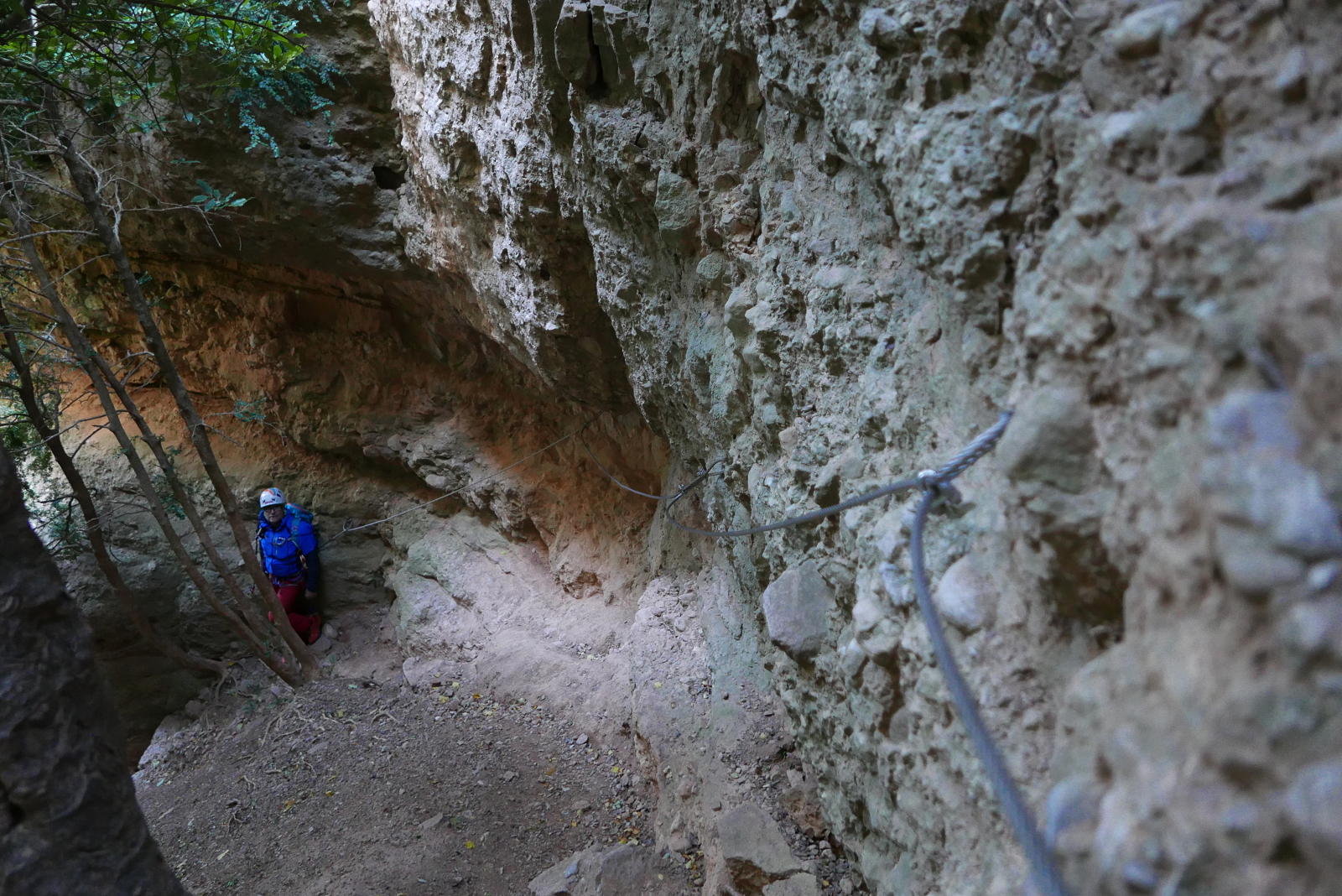 Comienza la línea de vida para el descenso (950m 2h08′). Hay tramos horizontales de flanqueo sin peligro, pero con cable de seguridad. Después llega el puente, son solo un par de pasos, pero apoyar los pies sobre una cadena da un poco de cosa. El descenso de una escalera conduce enseguida a la senda que se dirige al punto de conexión con la senda de subida (815m 2h40′) y vuelta al aparcamiento (690m 3h14′).