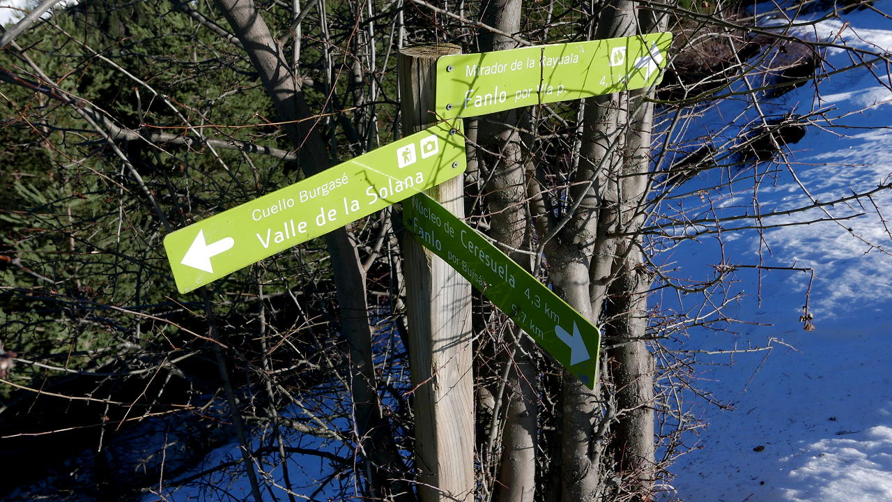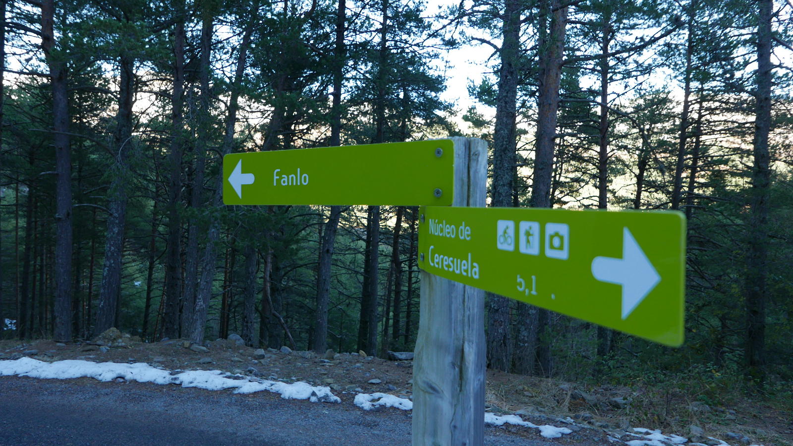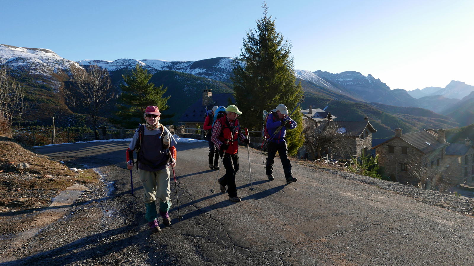 Tras este tramo más complejo desembocamos en la pista principal, que es el GR15-1, cerca del Collado Trito (1395m 5h27′), pista que seguimos hacia la izquierda y que se nos hace eterna. Es prácticamente llana y, aunque tiene algunos trozos sin nieve, continuamos con las raquetas puestas. El GR se desvía de la carretera para bajar a Buisán (1355m 6h32′), pero seguimos la pista principal hasta llegar a la carretera asfaltada (1315m 6h42′), donde nos quitamos las raquetas y recuperamos el GR. Una senda a la derecha (1340m 6h52′) señalizada como GR, enseguida entra en Fanlo. Atravesamos sus callejas para llegar al aparcamiento (1385m 7h13′)
