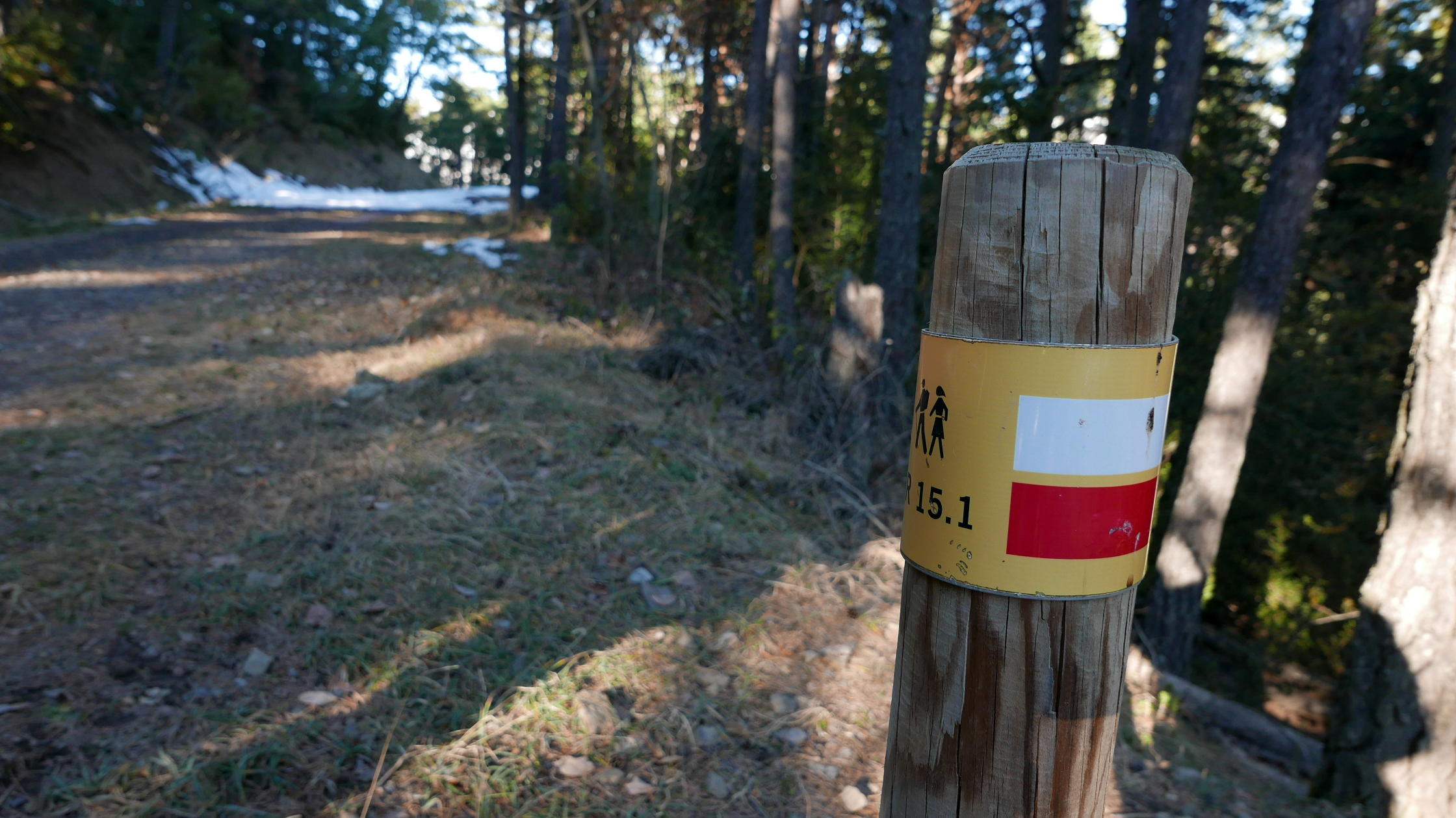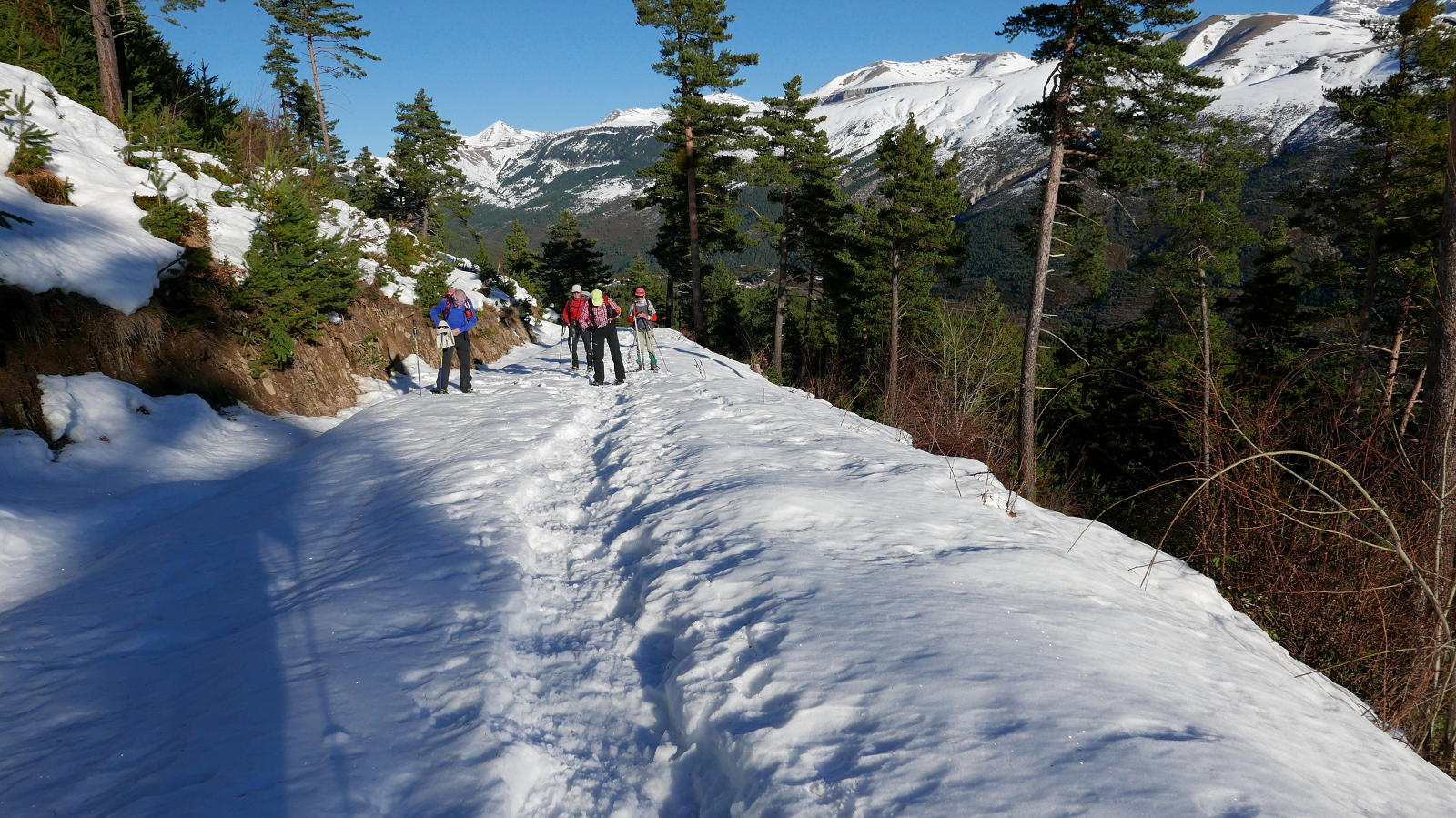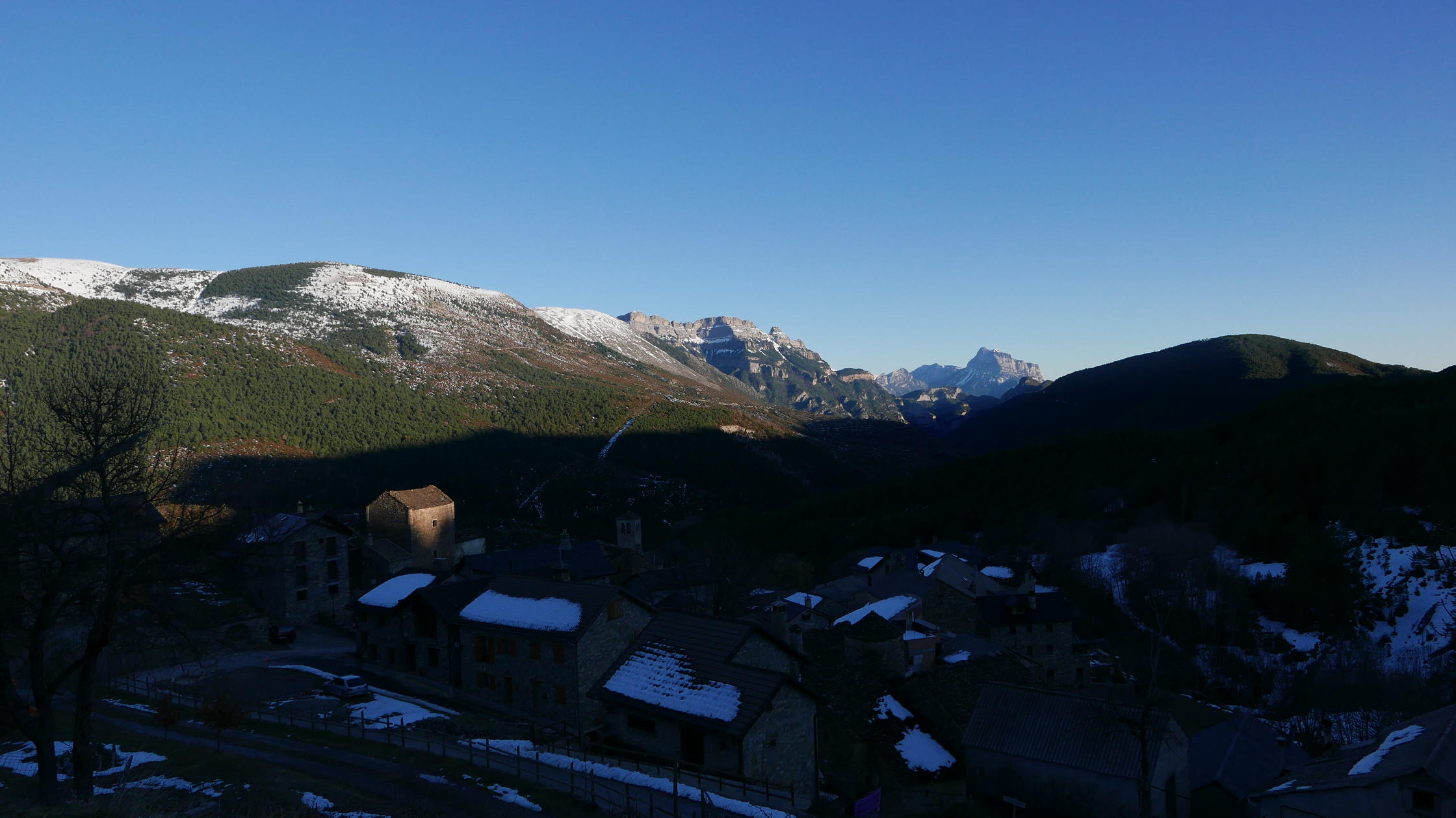 Tras este tramo más complejo desembocamos en la pista principal, que es el GR15-1, cerca del Collado Trito (1395m 5h27′), pista que seguimos hacia la izquierda y que se nos hace eterna. Es prácticamente llana y, aunque tiene algunos trozos sin nieve, continuamos con las raquetas puestas. El GR se desvía de la carretera para bajar a Buisán (1355m 6h32′), pero seguimos la pista principal hasta llegar a la carretera asfaltada (1315m 6h42′), donde nos quitamos las raquetas y recuperamos el GR. Una senda a la derecha (1340m 6h52′) señalizada como GR, enseguida entra en Fanlo. Atravesamos sus callejas para llegar al aparcamiento (1385m 7h13′)