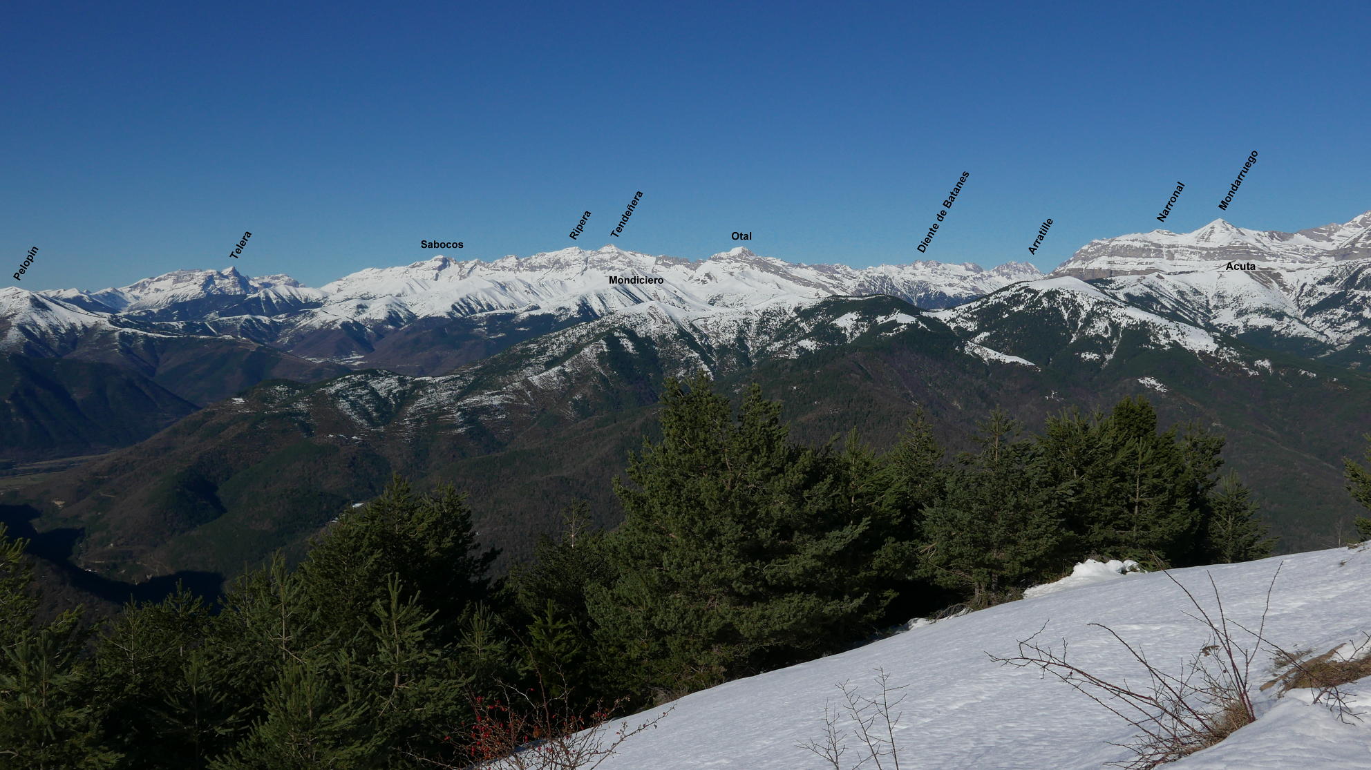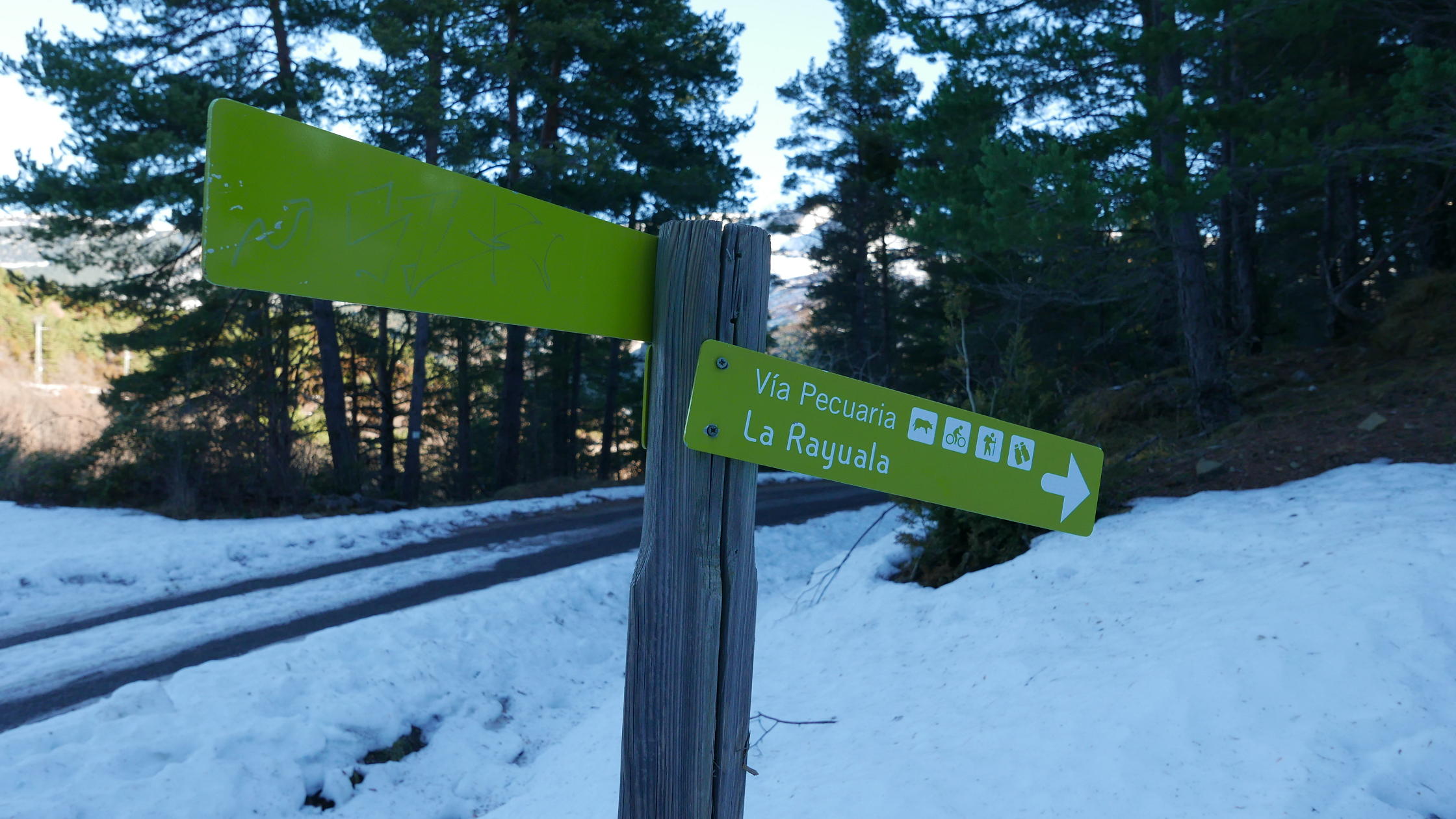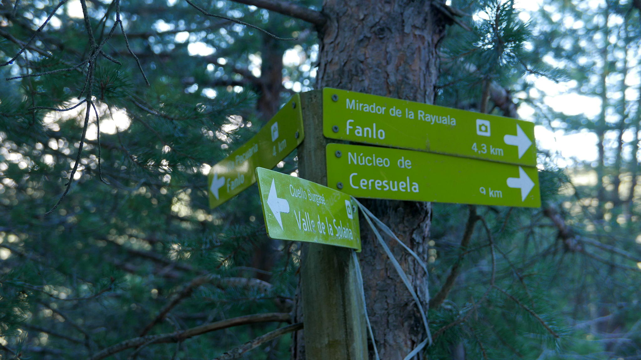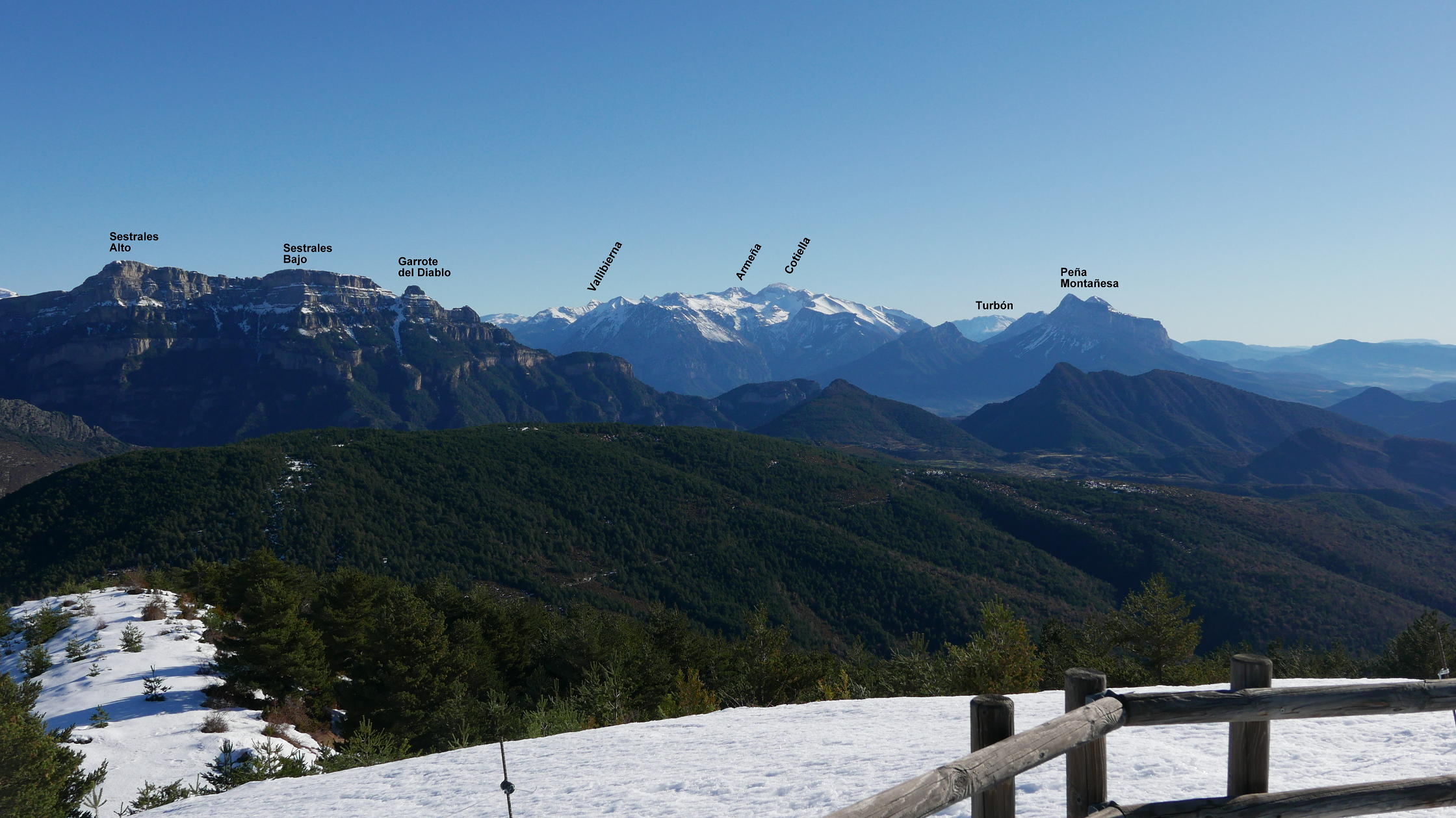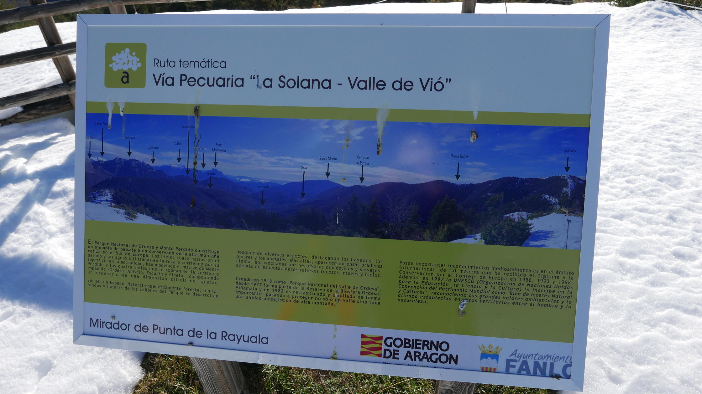 Descripción de la ruta: Fanlo (1385m). Continuamos unos metros por la carretera (cartel La Solana, Sasé, Fiscal PRHU-42) y nos desviamos por una pista a la derecha (Vía Pecuaria La Rayuala). Tomamos un atajo a la derecha (1405m 0h11′) y volvemos a seguir la pista que pasa por el collado Medioelmonte (1543m 1h01′), hasta desviarnos para subir al mirador de la Rayuala (1709m 1h43′).