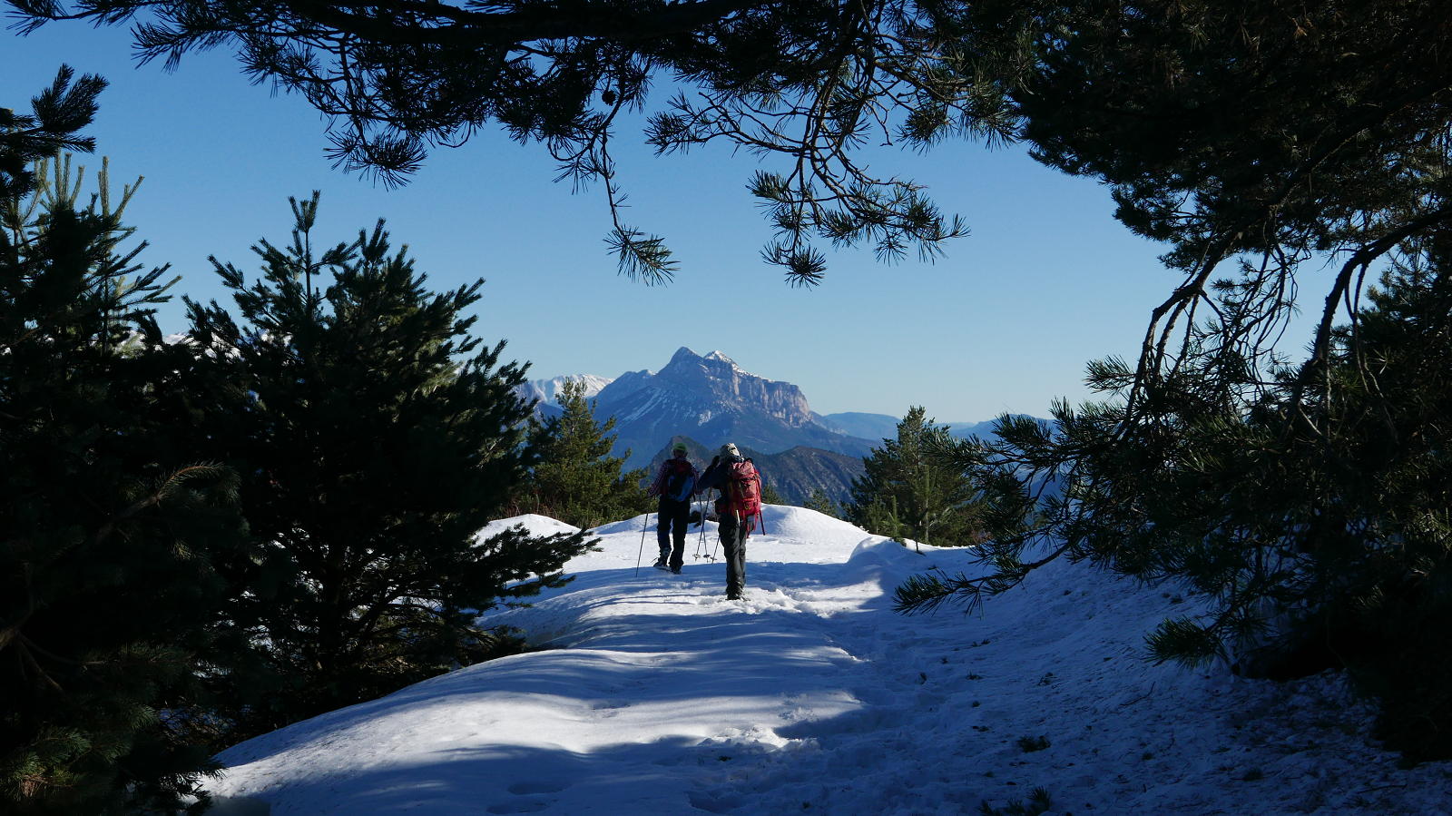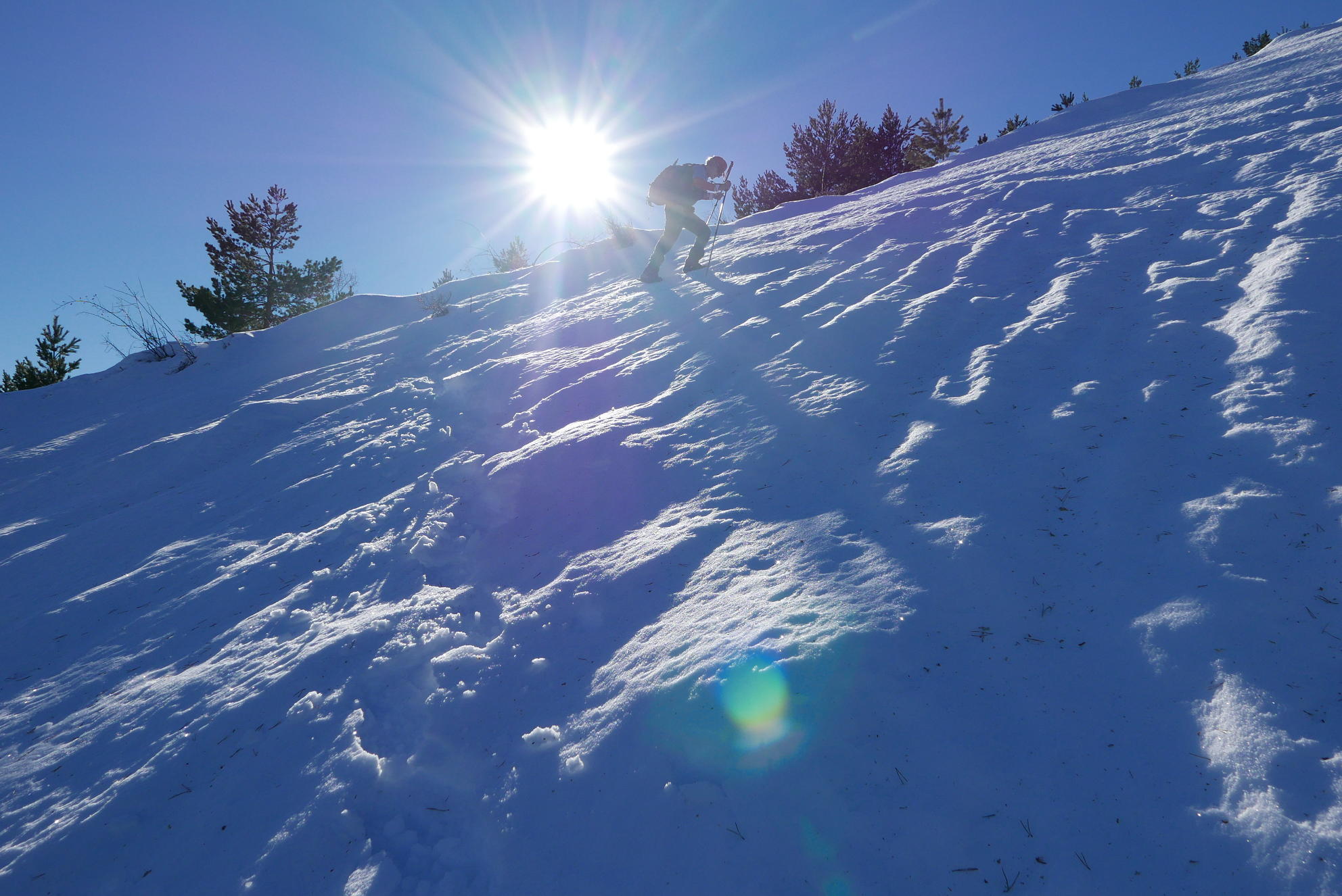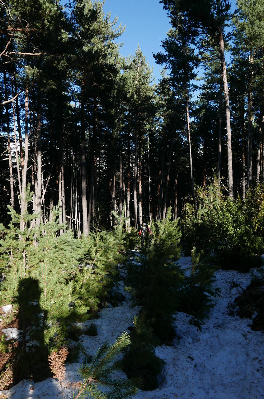 Para el descenso hay una ruta descrita en algunos tracks que hoy no seguimos y que tendré que investigar en otra ocasión, ya que ahora tomamos la misma ruta de ascenso, aunque por la pista de la ladera norte, evitando el Tozal de San Ginés. Cuando llegamos al punto donde dejamos la pista para subir el mirador de la Rayuala (1685m 4h34′) giramos a la derecha (SE) bordeamos el mirador por la izquierda, y, girando al NE, descendemos por un bosquecillo de pinos pequeños y bojes que en los mapas es un camino o pista, pero ahora es algo confuso y complicado debido a la nieve.