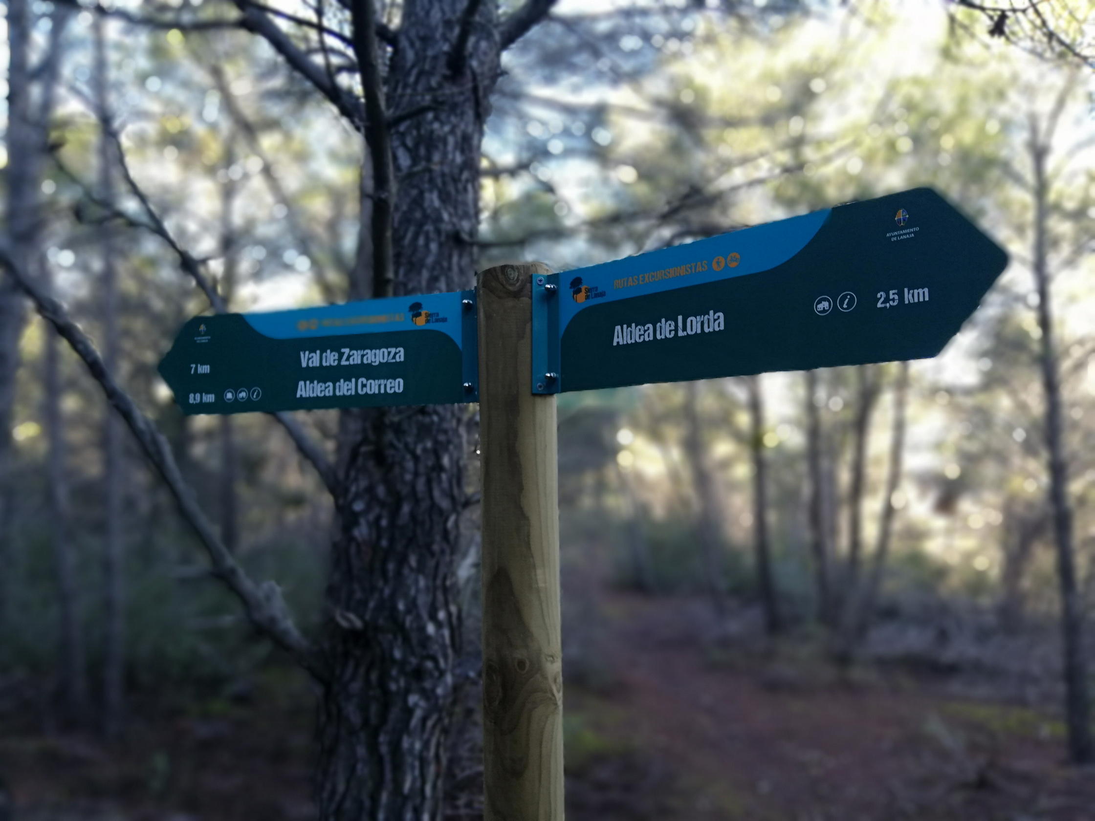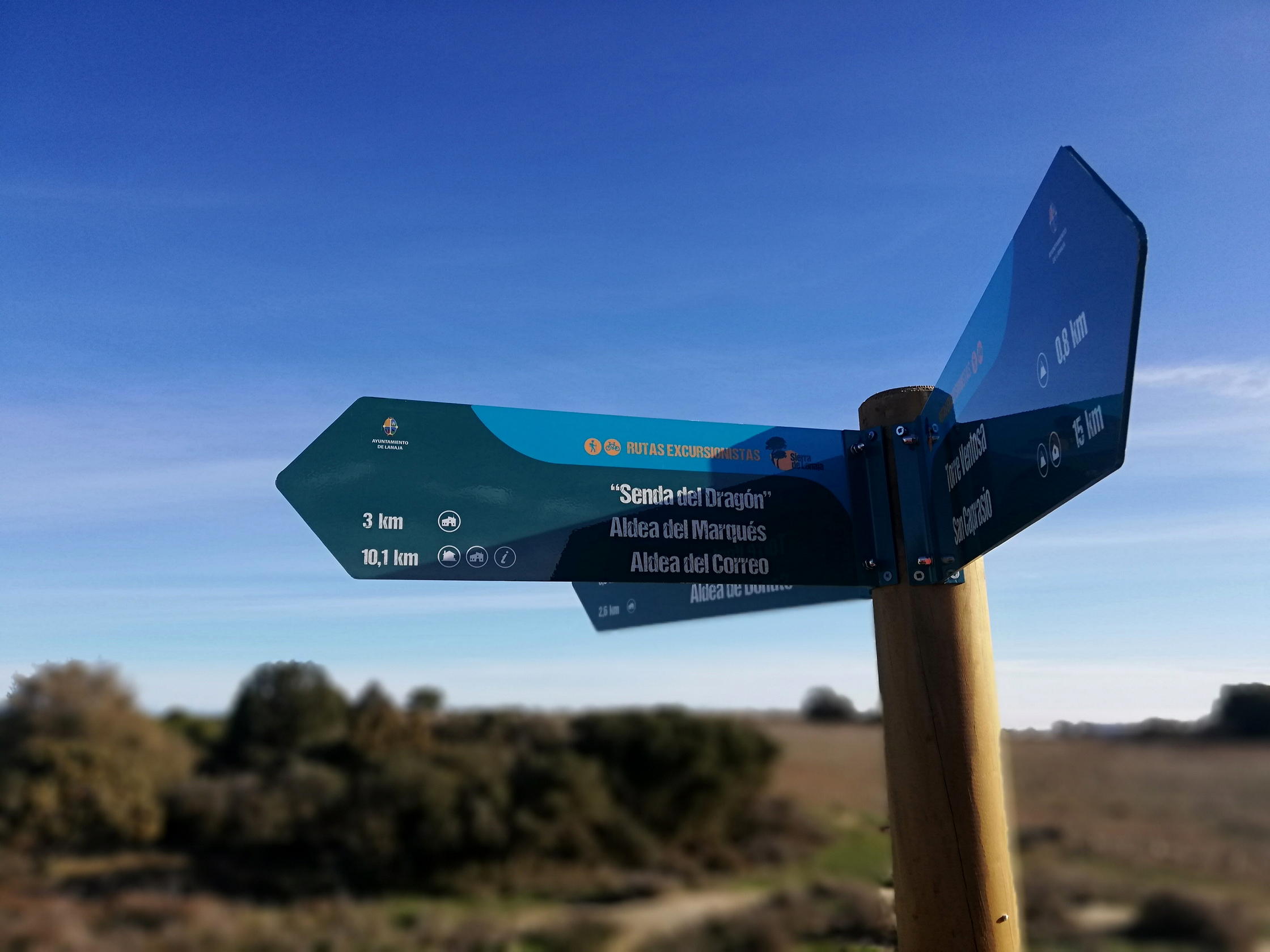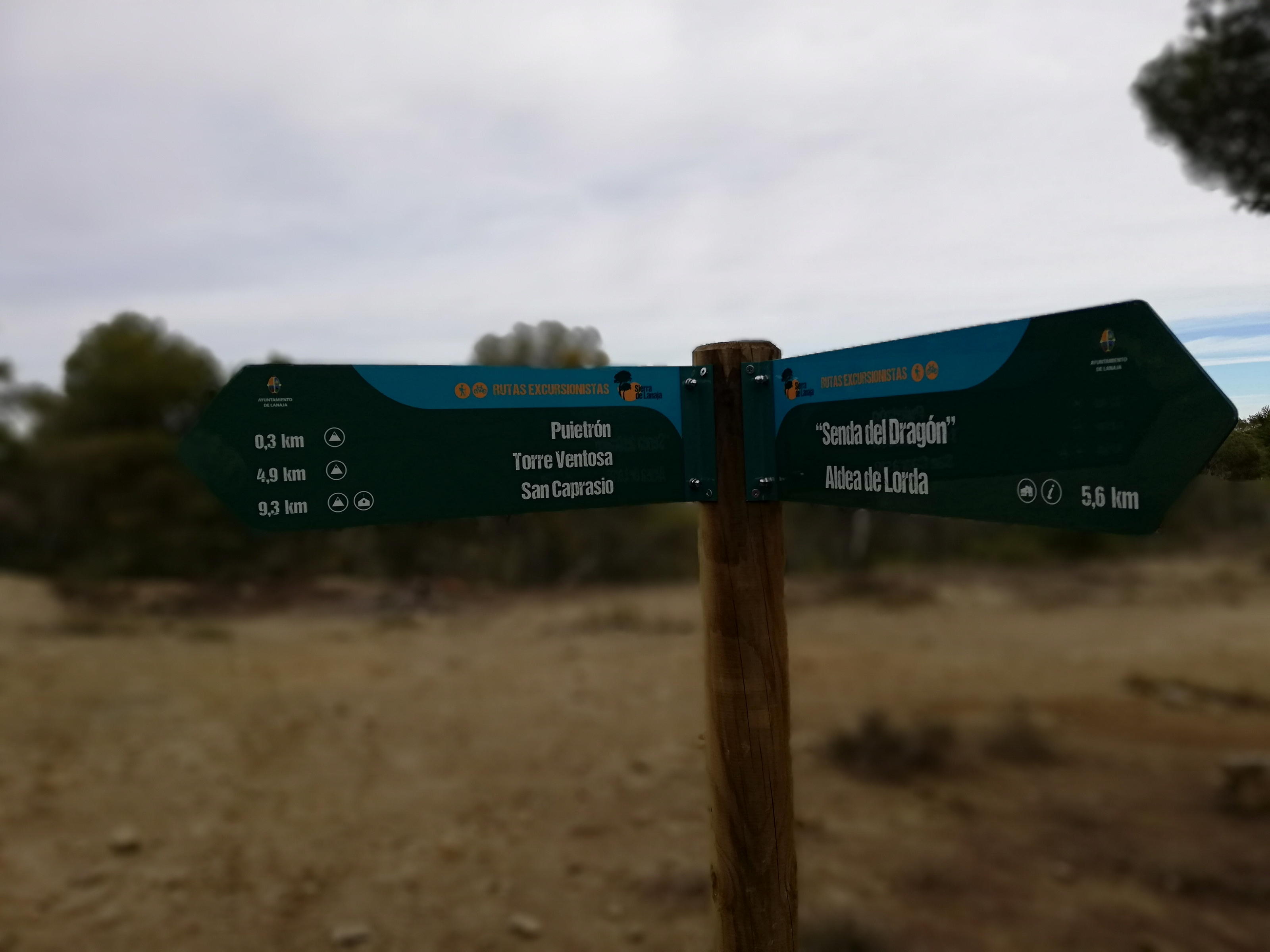 Descripción de la ruta: Aparcamiento (690m) junto al cartel de «Senda del Dragón, Aldea del Marqués, Aldea del Correo». Siguiendo esa pista se pasa enseguida la aldea de Lorda y, un poco más adelante, la balsa de Lorda (690m 0h05′), a partir de la cual empieza la senda por bosque que va faldeando continuamente la ladera norte de la sierra, con pequeños subeybaja que atraviesan los sucesivos barranquillos. En la balsa hay un cartel: hacia la izquierda Torre Ventosa y San Caprasio; derecha el Volador y recto Senda del Dragón, dirección que seguimos.