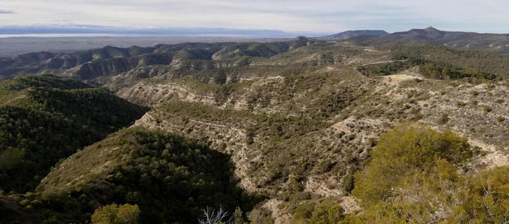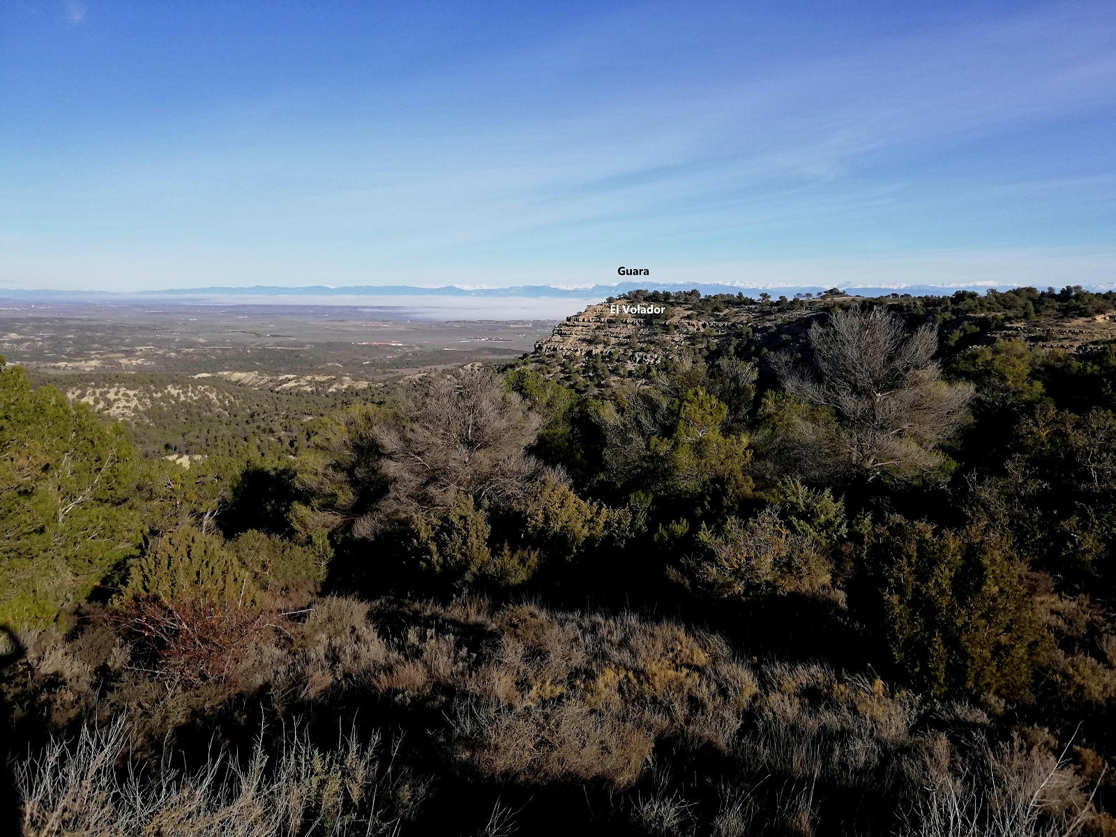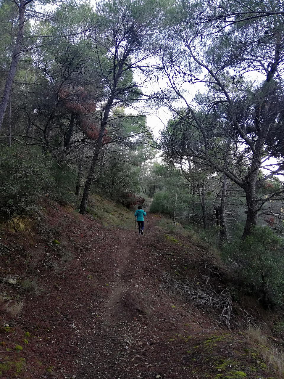 Os preguntareis qué hago subiendo esta modesta cota de menos de 800m. Pues aquí estoy, en tierras monegrinas, una zona que he recorrido numerosas veces con bicicleta de montaña, pero hoy toca senderismo. Y nos sorprenderá que en este territorio tan árido se pueda hacer una ruta que discurre totalmente por un denso pinar, con carrascas y enebros.