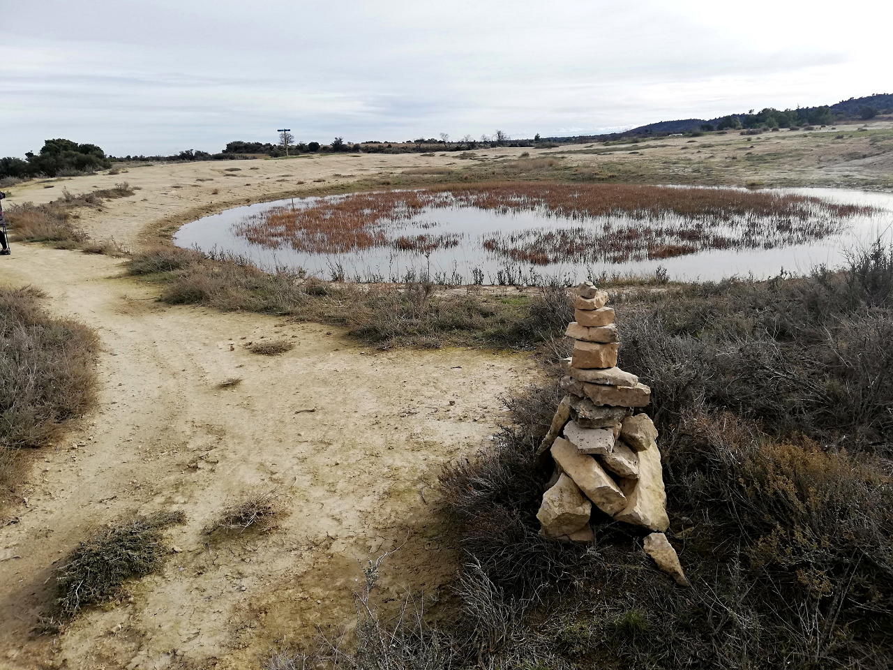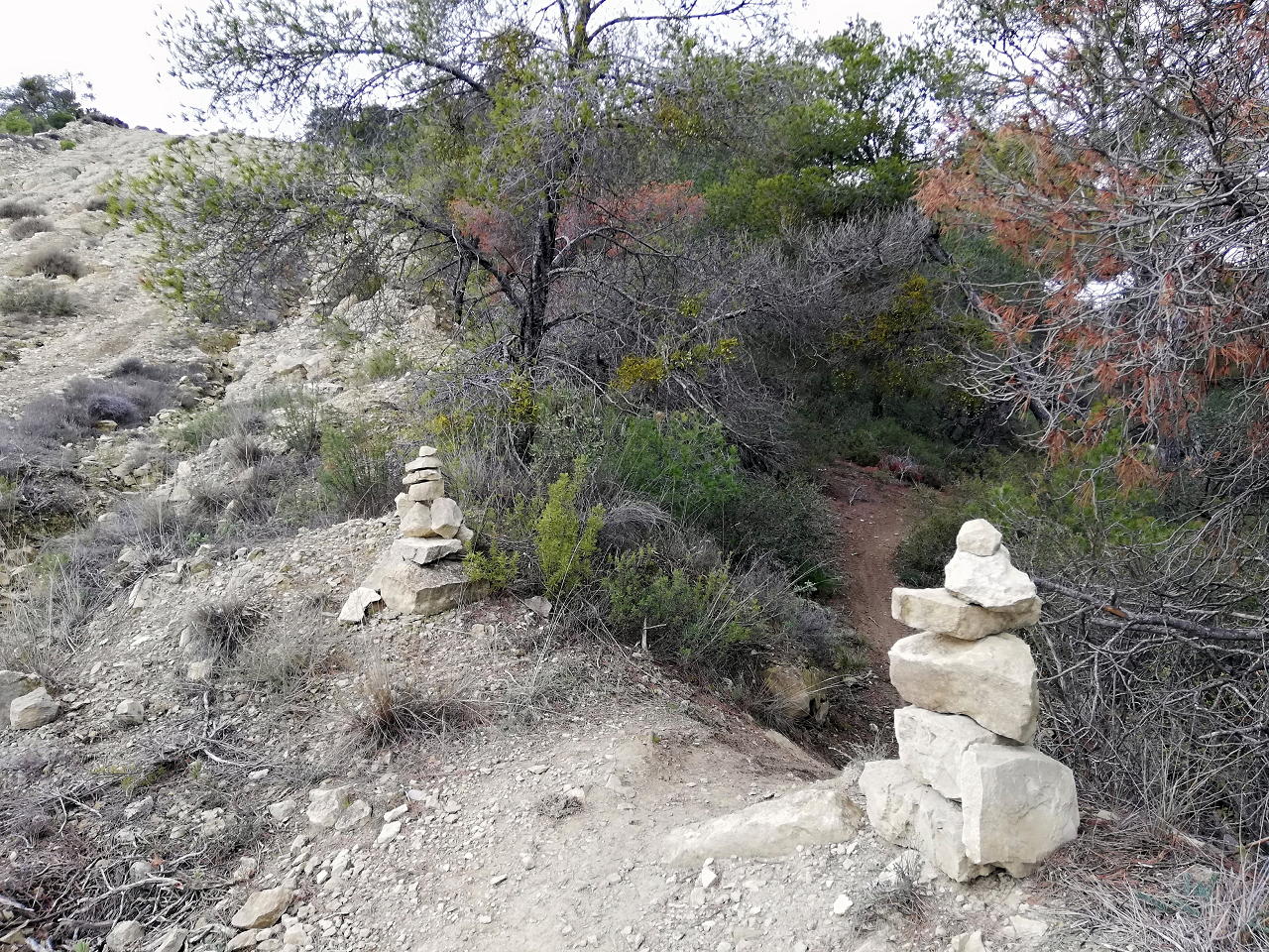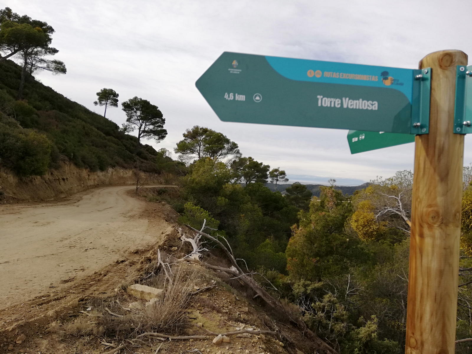 Os preguntareis qué hago subiendo esta modesta cota de menos de 800m. Pues aquí estoy, en tierras monegrinas, una zona que he recorrido numerosas veces con bicicleta de montaña, pero hoy toca senderismo. Y nos sorprenderá que en este territorio tan árido se pueda hacer una ruta que discurre totalmente por un denso pinar, con carrascas y enebros.