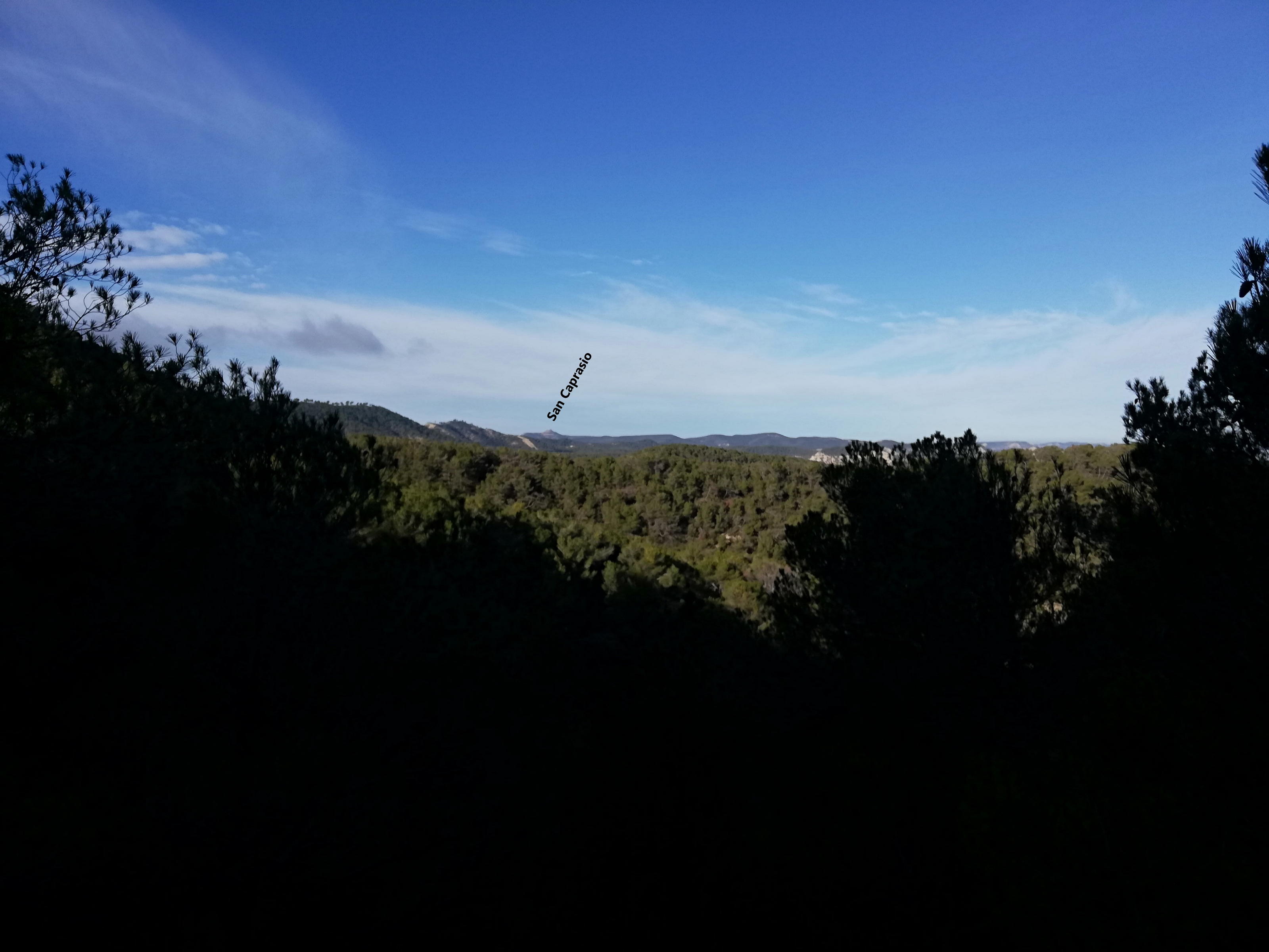 Es el único tramo de subida dura por un cortafuegos lleno de acanaladuras por el paso del agua. Atravieso una pista que a la derecha lleva a San Caprasio y a la izquierda a Torre Ventosa (también con cartel). Hacia arriba, casi sin senda, llego a la cima del Pueitrón (771m 1h30′) con las amplísimas vistas a los dos lados de la sierra y al norte, a lo lejos, el Pirineo.