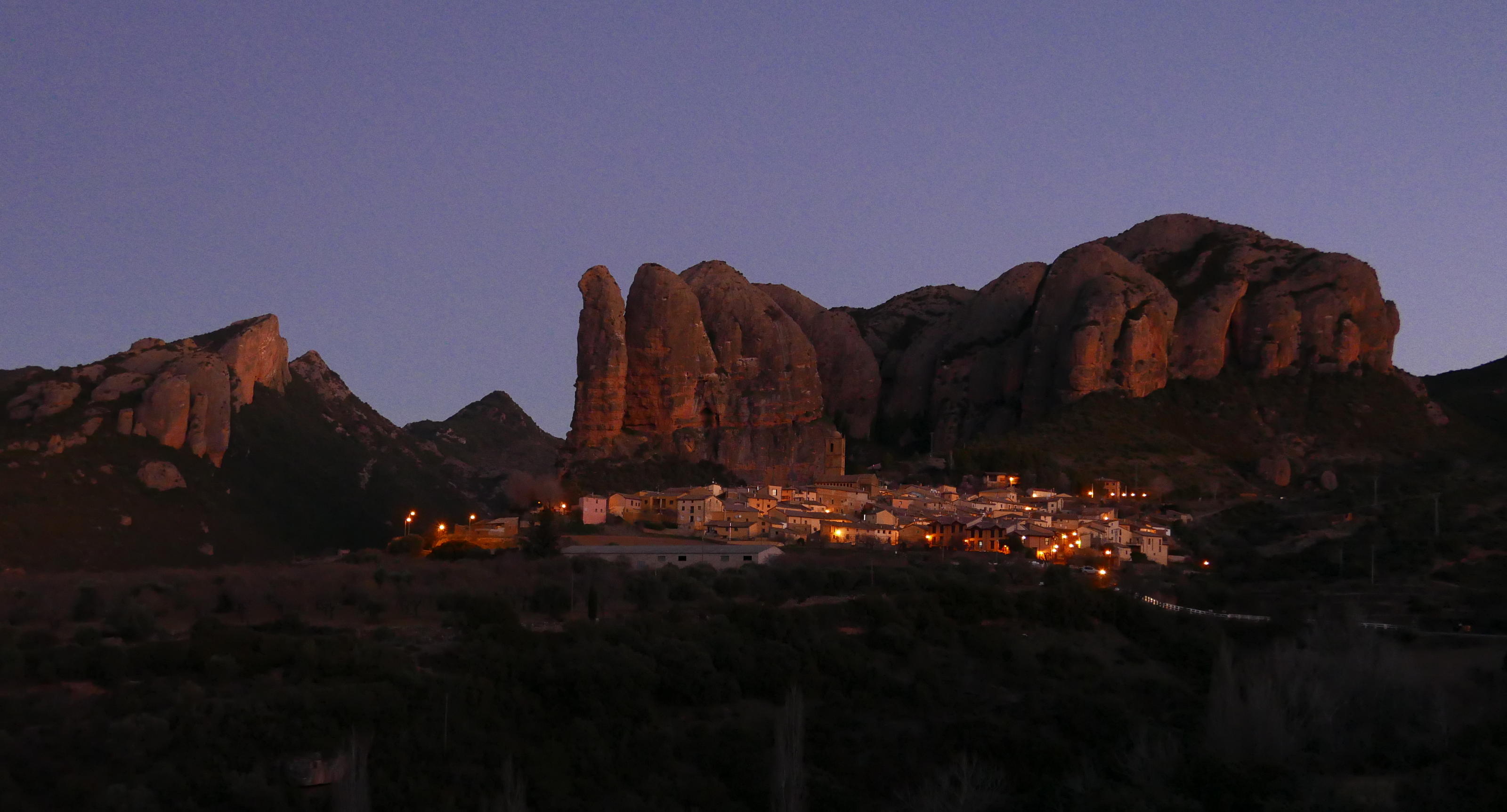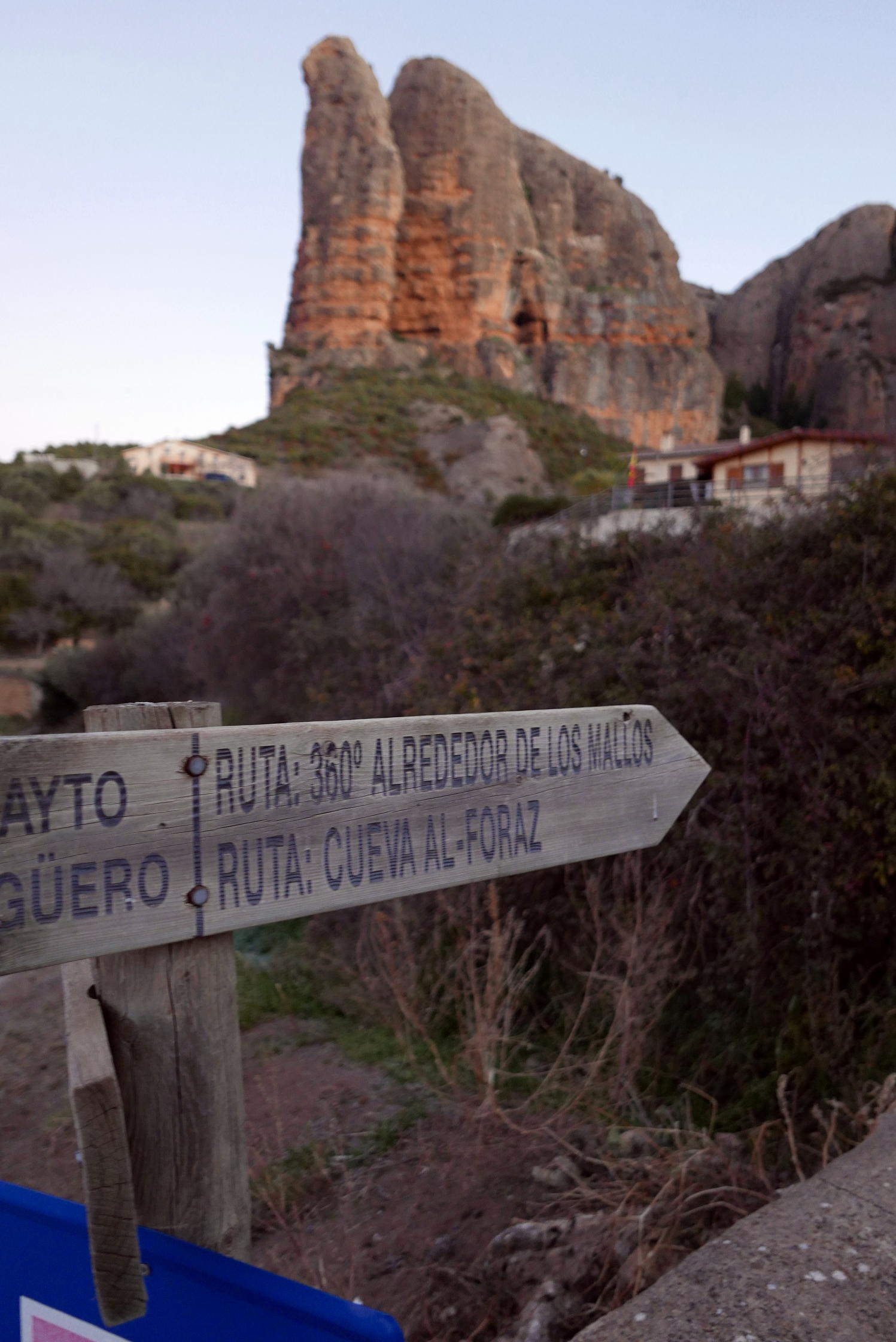 Los hermanos pequeños de los mallos de Riglos también pueden alardear de configurar un paisaje espectacular. Estas torres de conglomerados, se alzan sobre el pueblo de Agüero, que les da su nombre. Es la primera excursión que hago en esta zona, y compruebo que ofrece una amplia variedad de recorridos de diferentes grados de dificultad. Hoy combino una sencilla ruta circular con la ascensión a tres esbeltos picos que, sin necesitar técnicas de escalada, presentan algunos pasos de cierta verticalidad que requieren apoyar las manos. Sus vertientes orientales caen a pico, vertiginosas, sobre el barranco de Castillo Mango, que corta el bloque de mallos que hay sobre el pueblo, de estos que están al oeste.